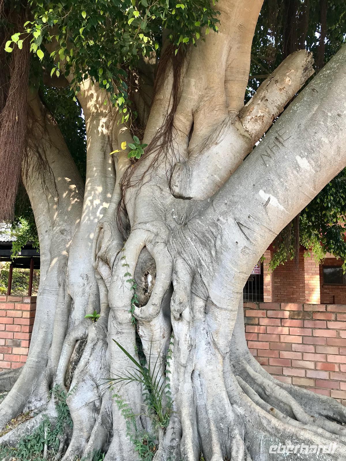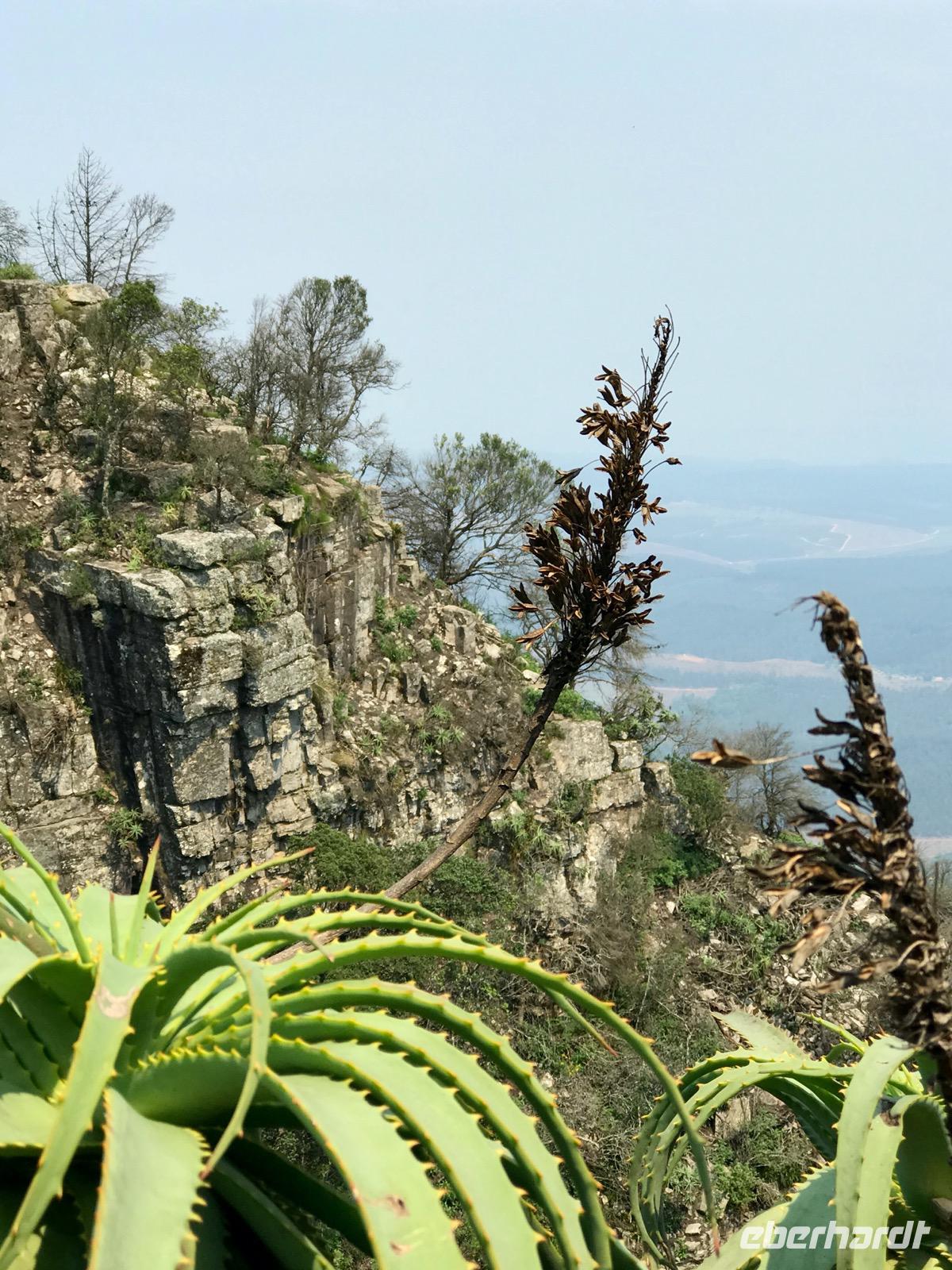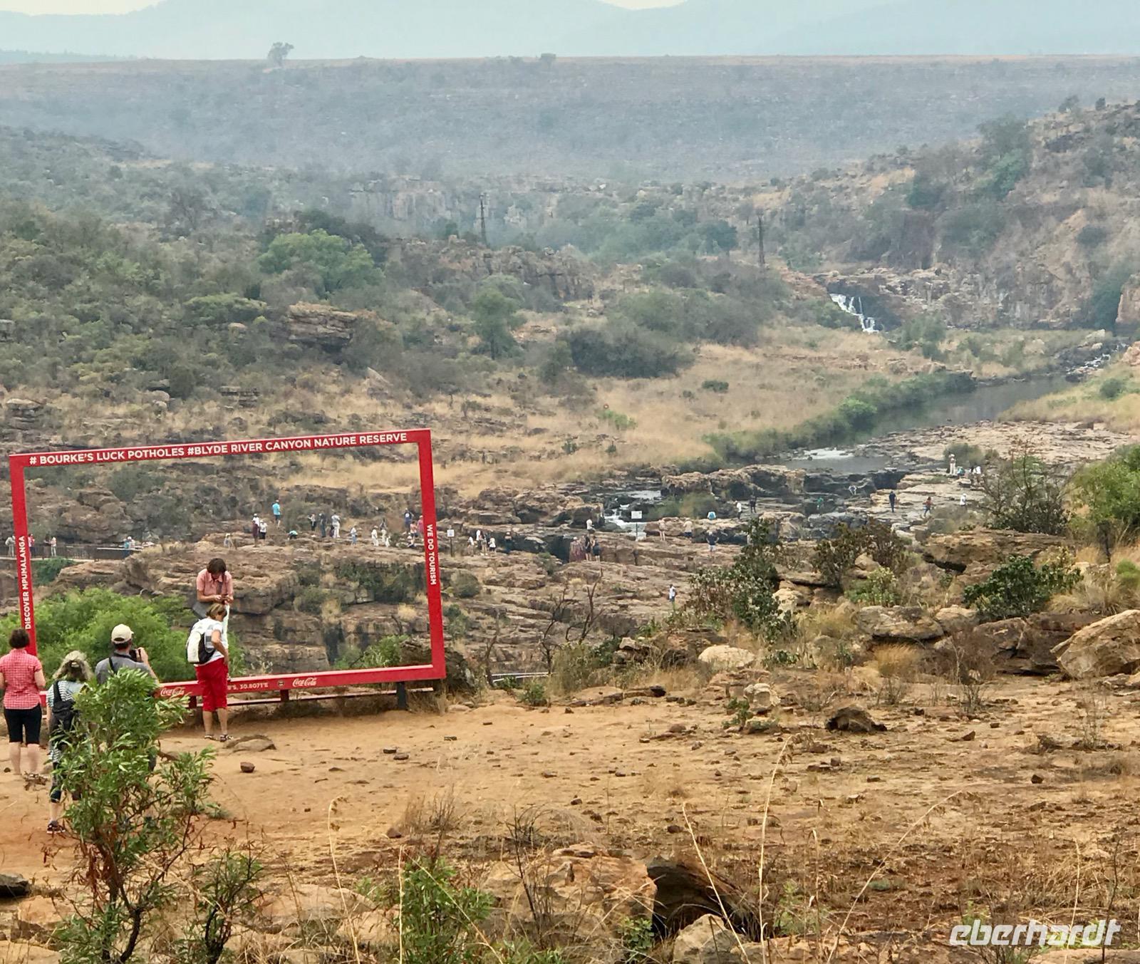 Unser heutiger Ausflug folgt einer Reihe von Ausflugszielen an der Panoramastraße. Zunächst fahren wir bis zum Blyde River Canyon, wo es mehrere Aussichtspunkte an den Klippen gibt. Der Blyde River (Fluss der Freude) hat sich über Jahrtausende eine 20 km lange Schlucht durch Schiefer- und Quarzstein geschaffen. Fast 700 Meter geht es in die Tiefe. Leider ist der Ausblick nebelverhangen und sehr diesig. Da kann man auf den Fotos das grandiose Bild dieser Landschaft nur erahnen.