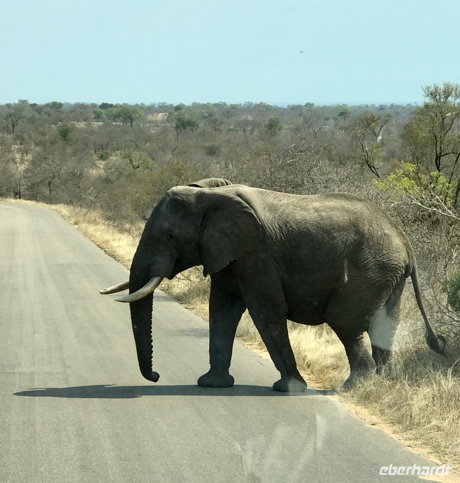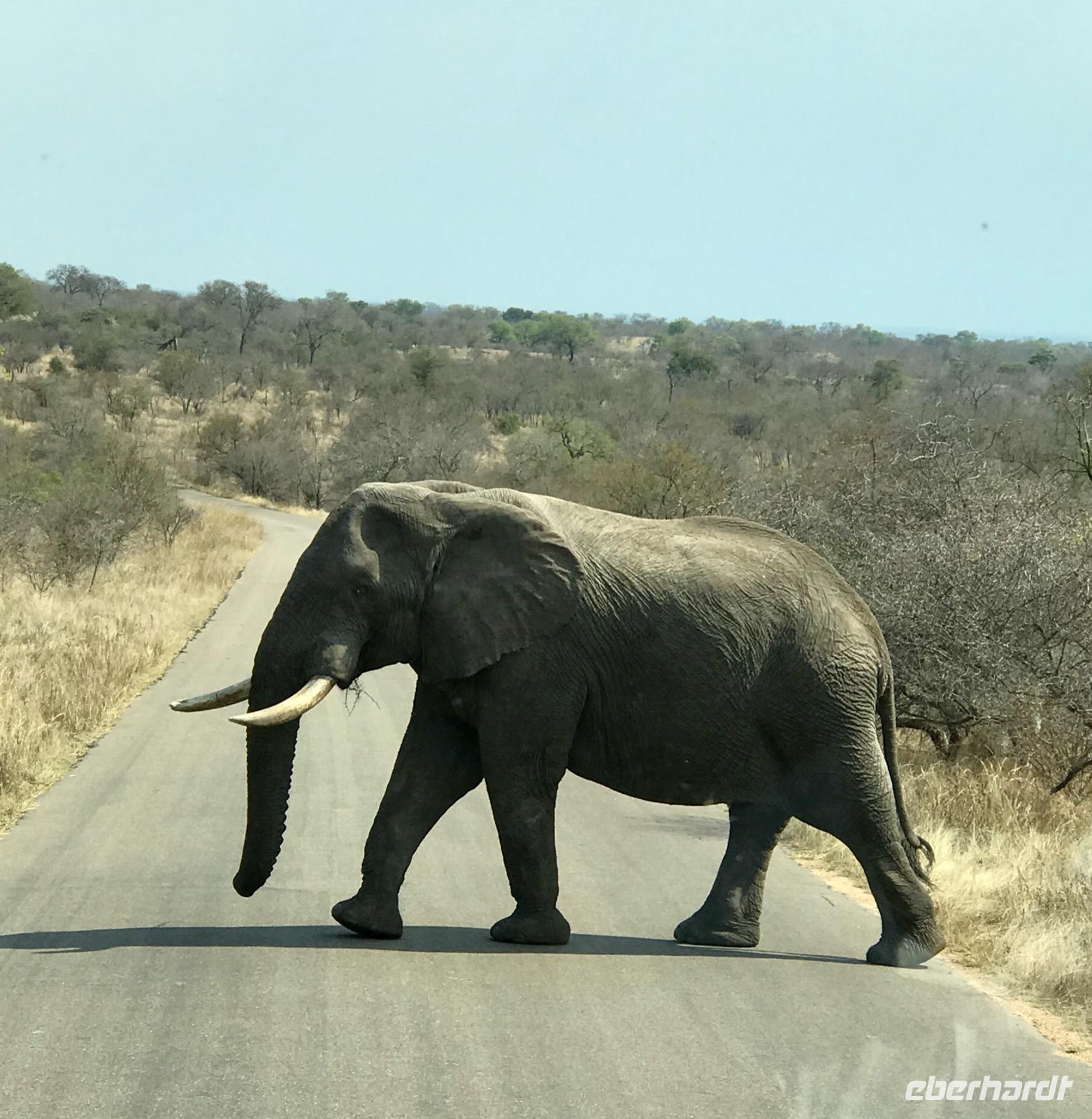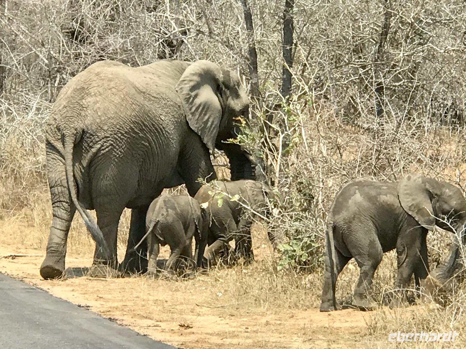 Elefanten sehen wir in Herden und genießen die Familienbilder, die erfahrenen Alten mit den ganz Kleinen. Die Männer sind lieber unter sich und bilden eigene Herden. Sie scheinen sich nicht an unserer Anwesenheit zu stören. Gleichmütig queren sie die Straßen. Mit den großen Ohren fächern sie sich frische Luft zu und kühlen die Haut. Wir beobachten sie beim Fressen. Mit dem recht gelenkigen Rüssel sind sie in der Lage, alles abzureißen, auch wenn die Zweige stachelig sind, und unter dem Rüssel ins Maul zu schieben.