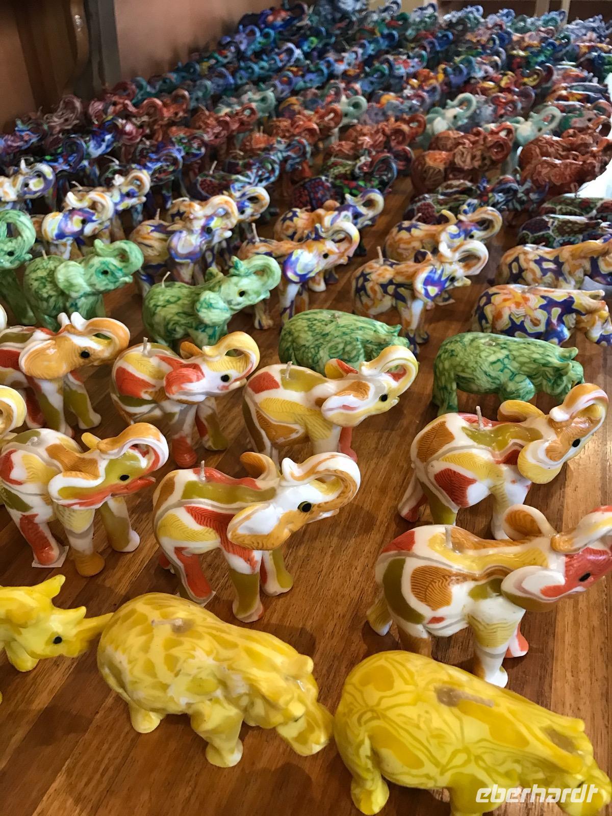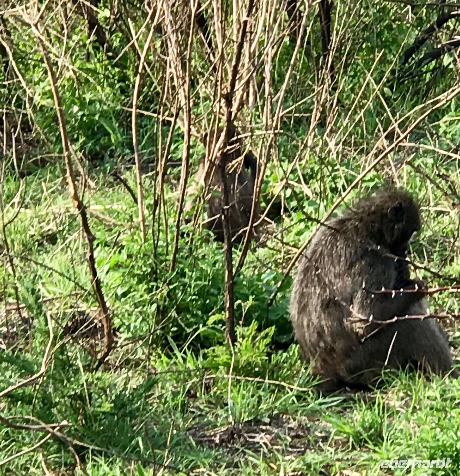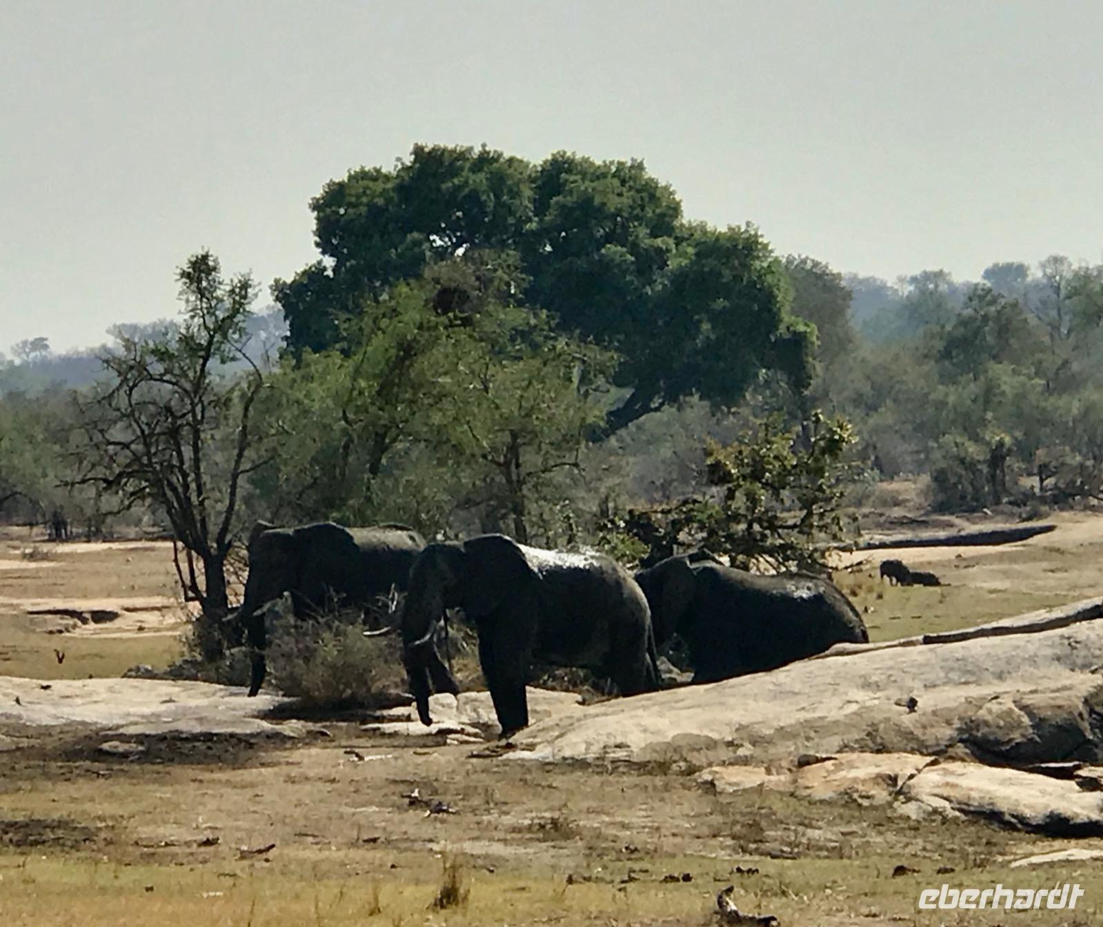 Elefanten sehen wir in Herden und genießen die Familienbilder, die erfahrenen Alten mit den ganz Kleinen. Die Männer sind lieber unter sich und bilden eigene Herden. Sie scheinen sich nicht an unserer Anwesenheit zu stören. Gleichmütig queren sie die Straßen. Mit den großen Ohren fächern sie sich frische Luft zu und kühlen die Haut. Wir beobachten sie beim Fressen. Mit dem recht gelenkigen Rüssel sind sie in der Lage, alles abzureißen, auch wenn die Zweige stachelig sind, und unter dem Rüssel ins Maul zu schieben.