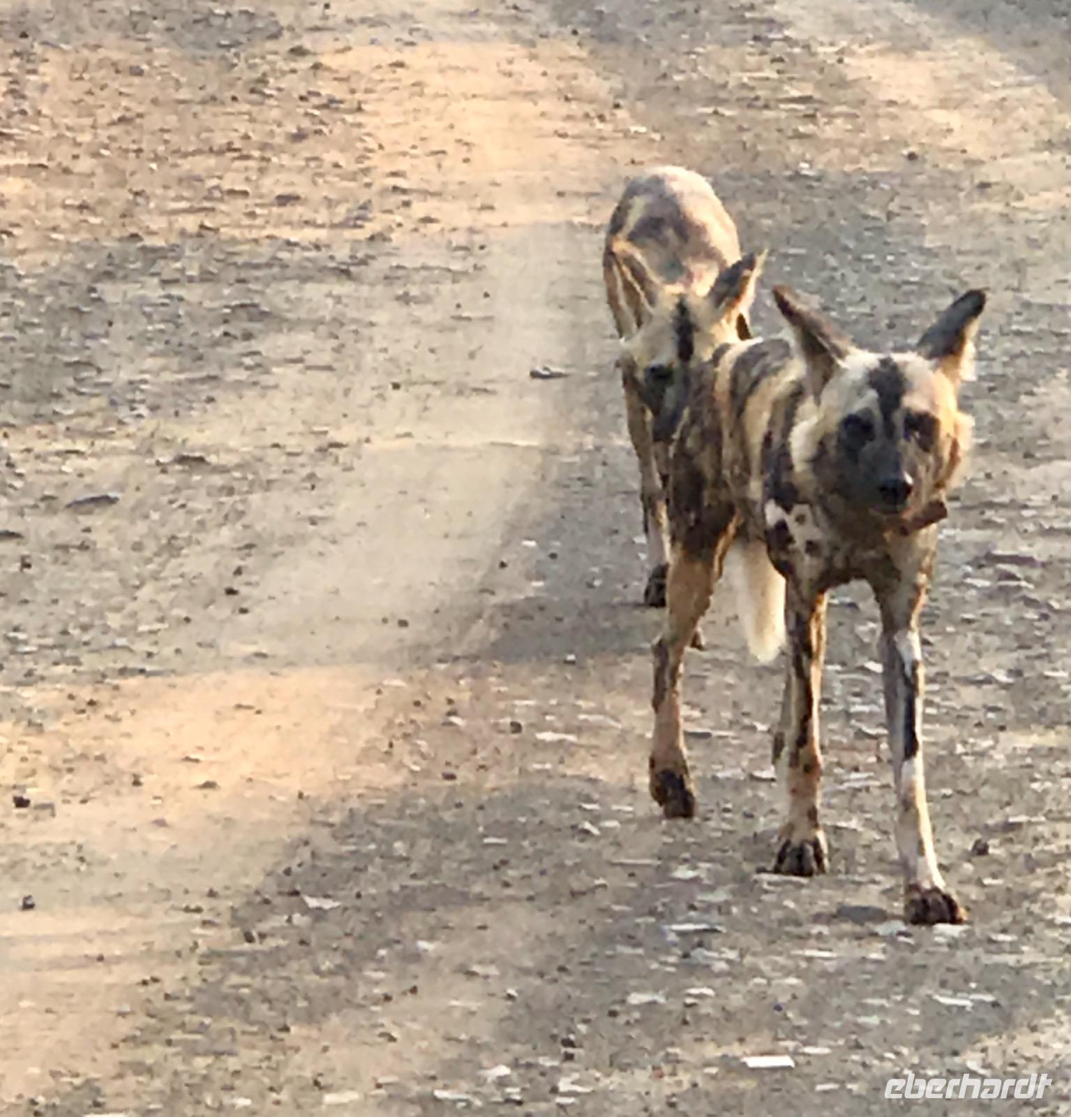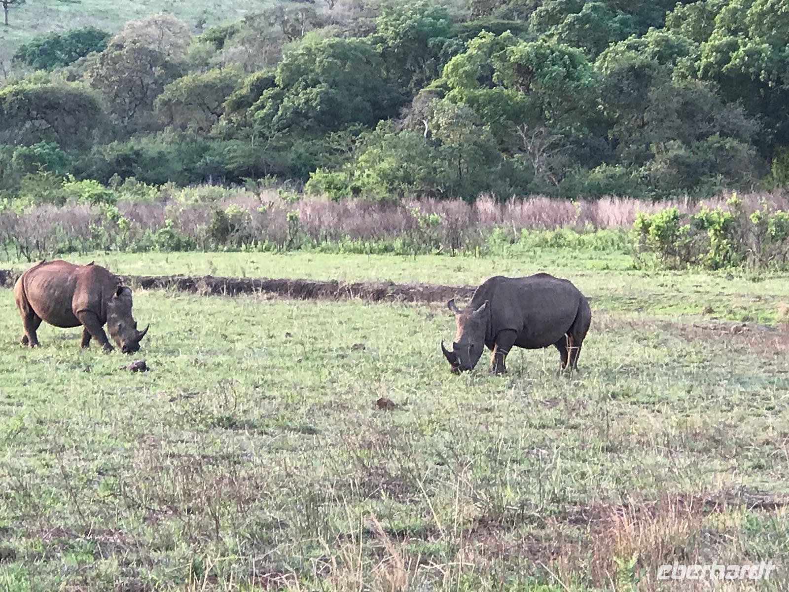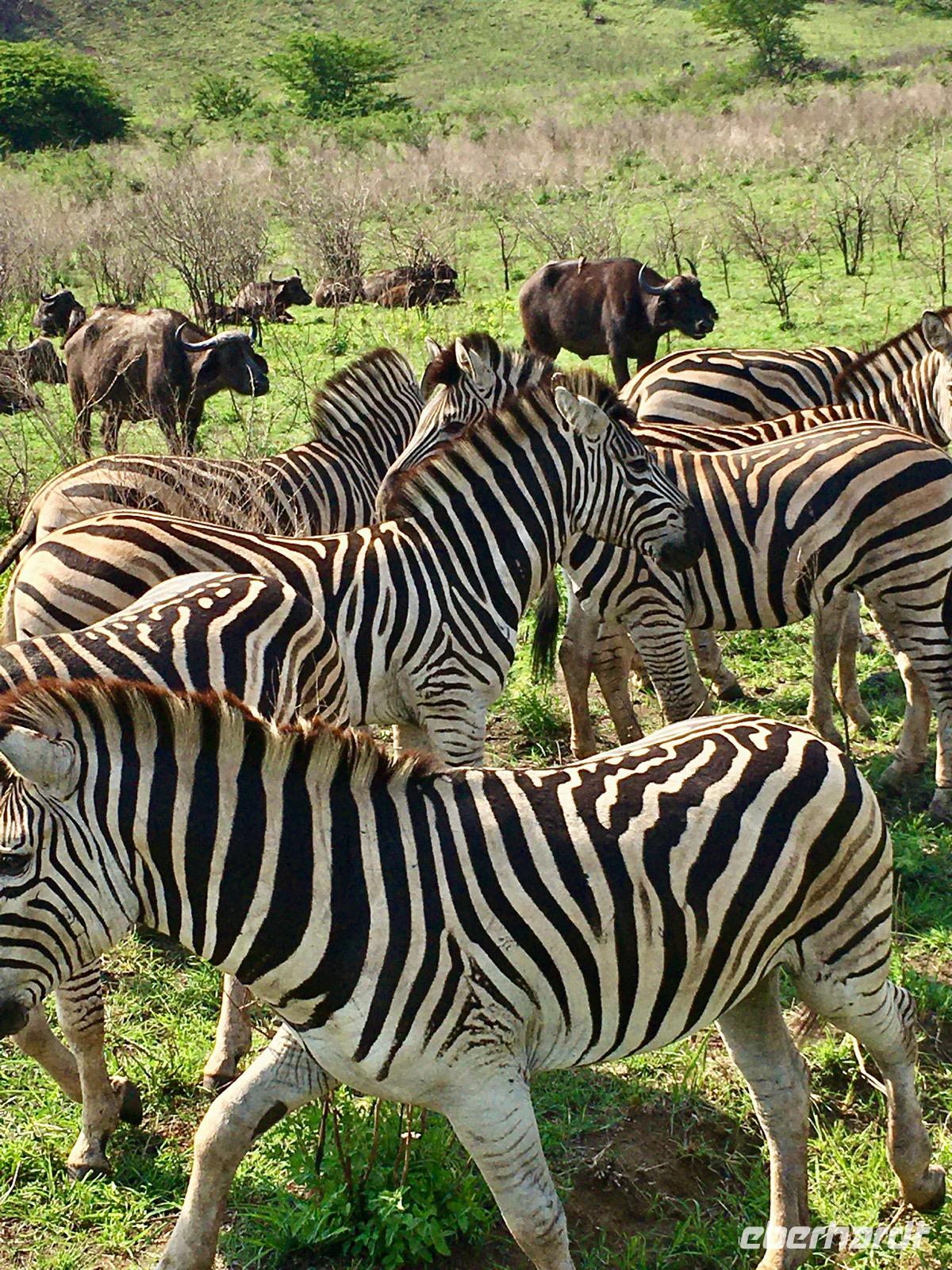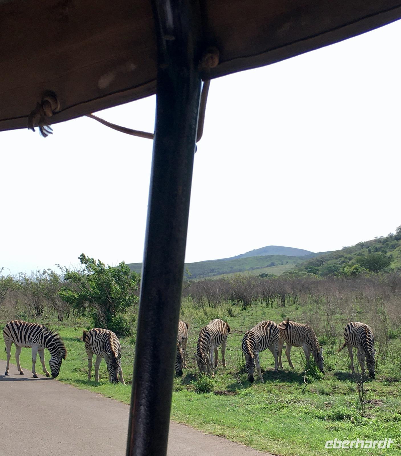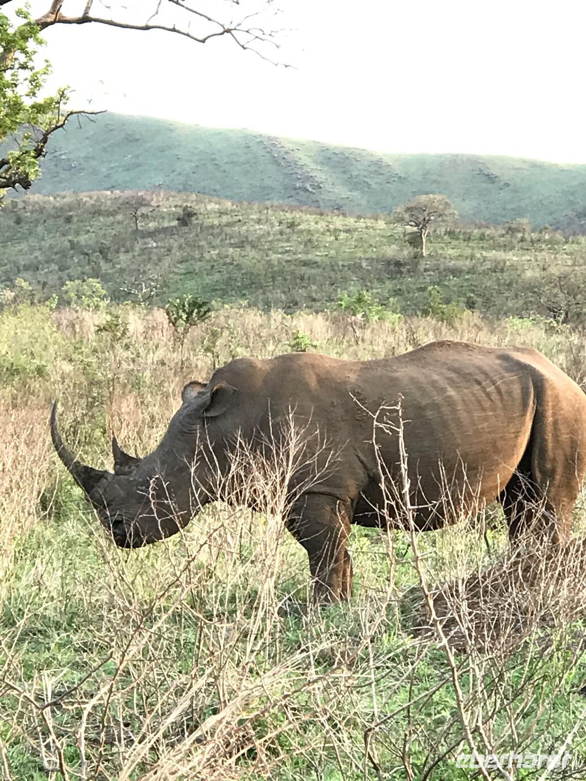 Am Nachmittag haben wir eine 3-stündigen Wildbeobachtungsfahrt in offenen Geländewagen im Hluhluwe/Imfolozi Nationalpark. Es ist unsere erste Bekanntschaft mit einer Safari und wir genießen es, in der Natur zu sein. In diesem Park, fast 1.000 km2 groß, gibt es ein sehr ambitioniertes Nashorn-Schutzprogramm, um die letzten Nashörner Südafrikas bewahren zu können. Das Reservat bietet eine sehr abwechslungsreiche Landschaft aus sanften Hügeln, offener Waldlandschaft und Flussarmen. Wir treffen Nashörner, Büffelherden, Zebras, Elefanten und dann sogar Wildhunde.