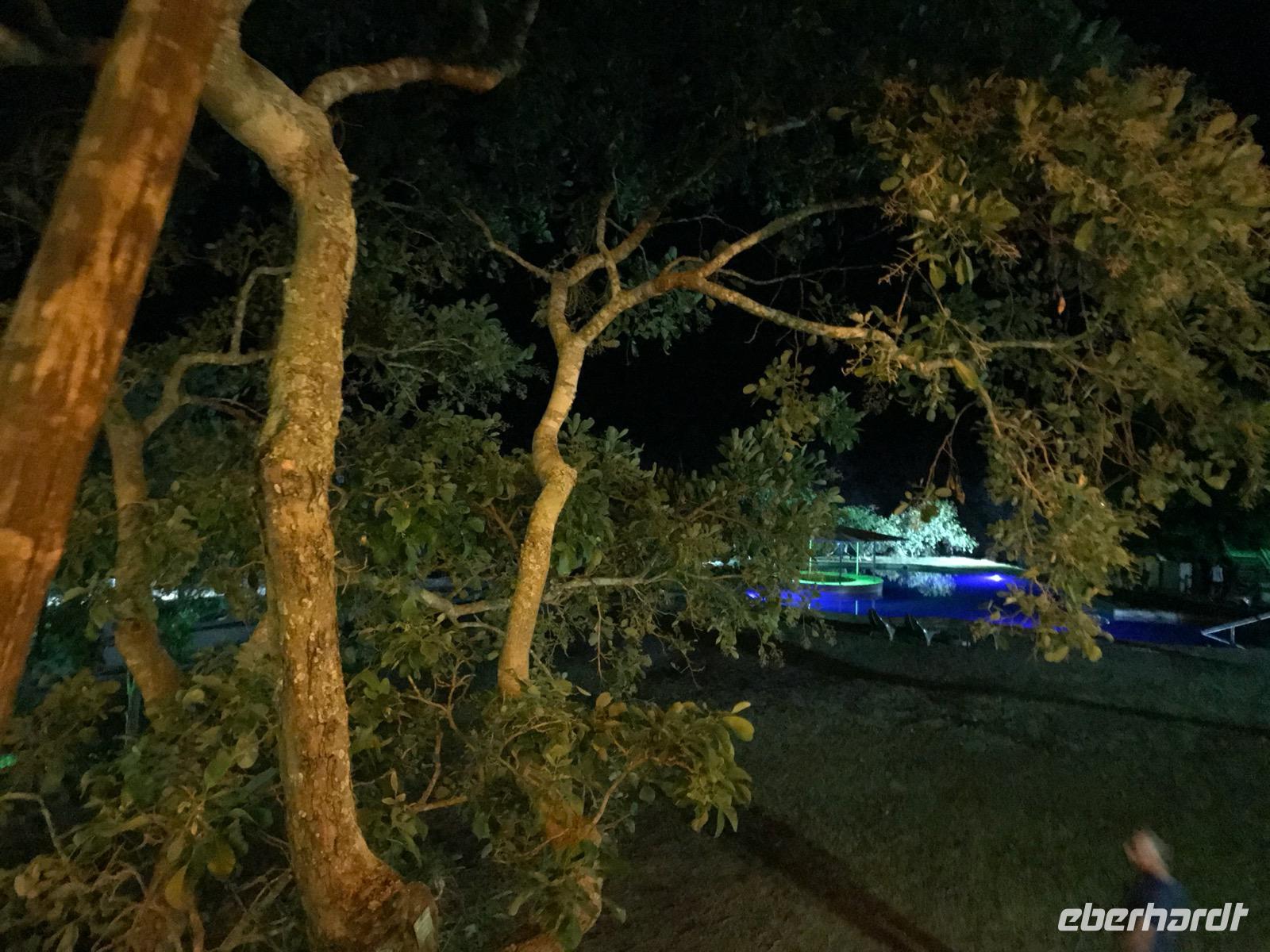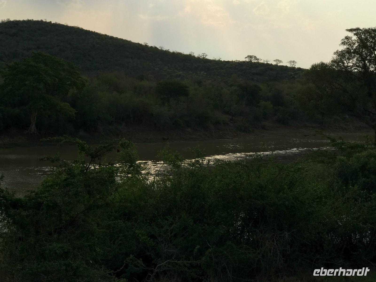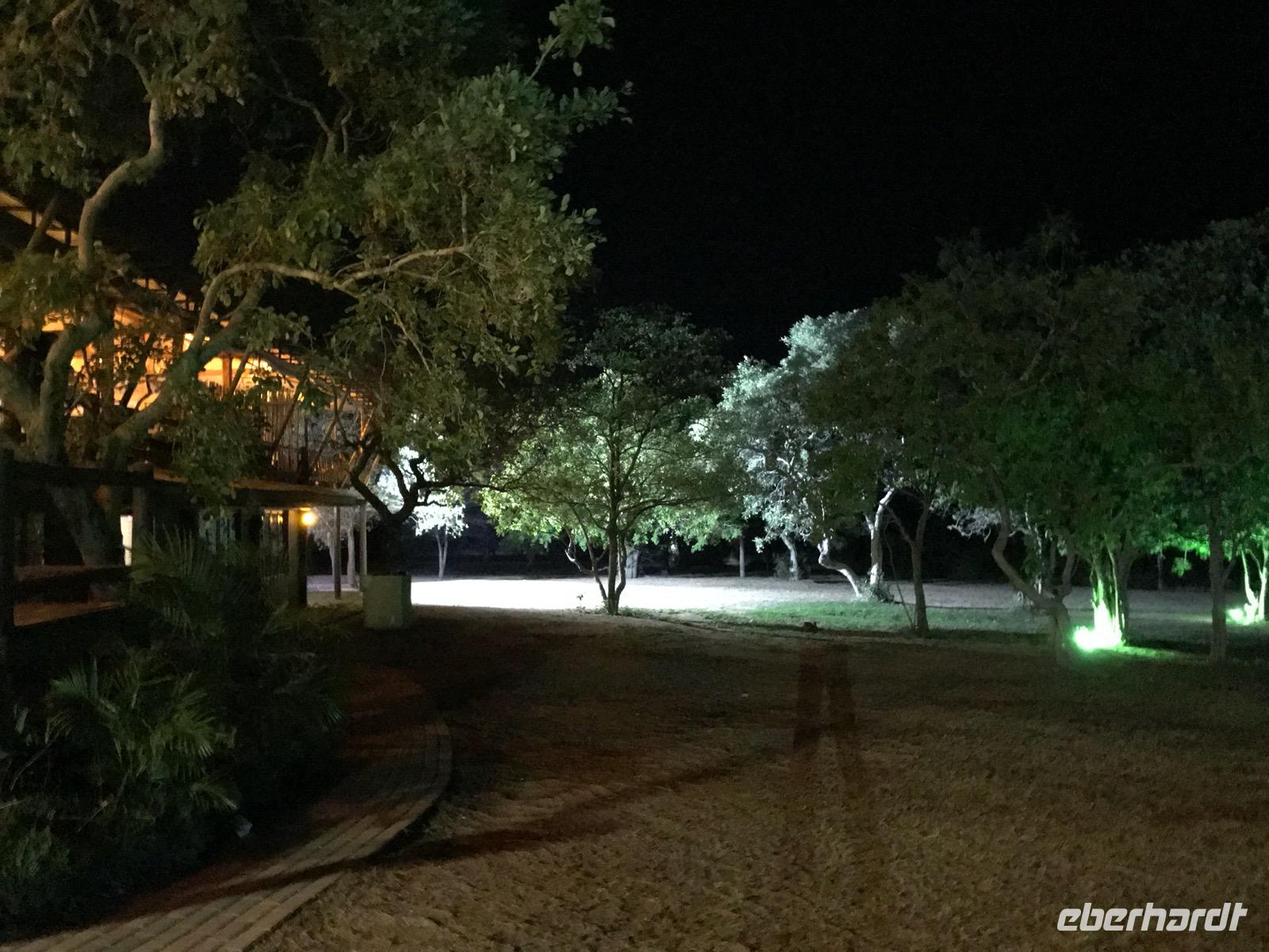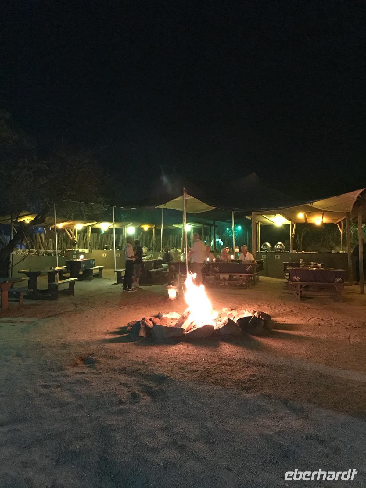 Das Abendessen haben wir diesmal nicht im Speisesaal, sondern draußen in einer Boma, an einem mit Palisadenwänden befriedeten Ort, als Braai (Grillfest). Es schmeckt vortrefflich, und gegrillte Würste gibt es auch, aber eben keine Thüringer.