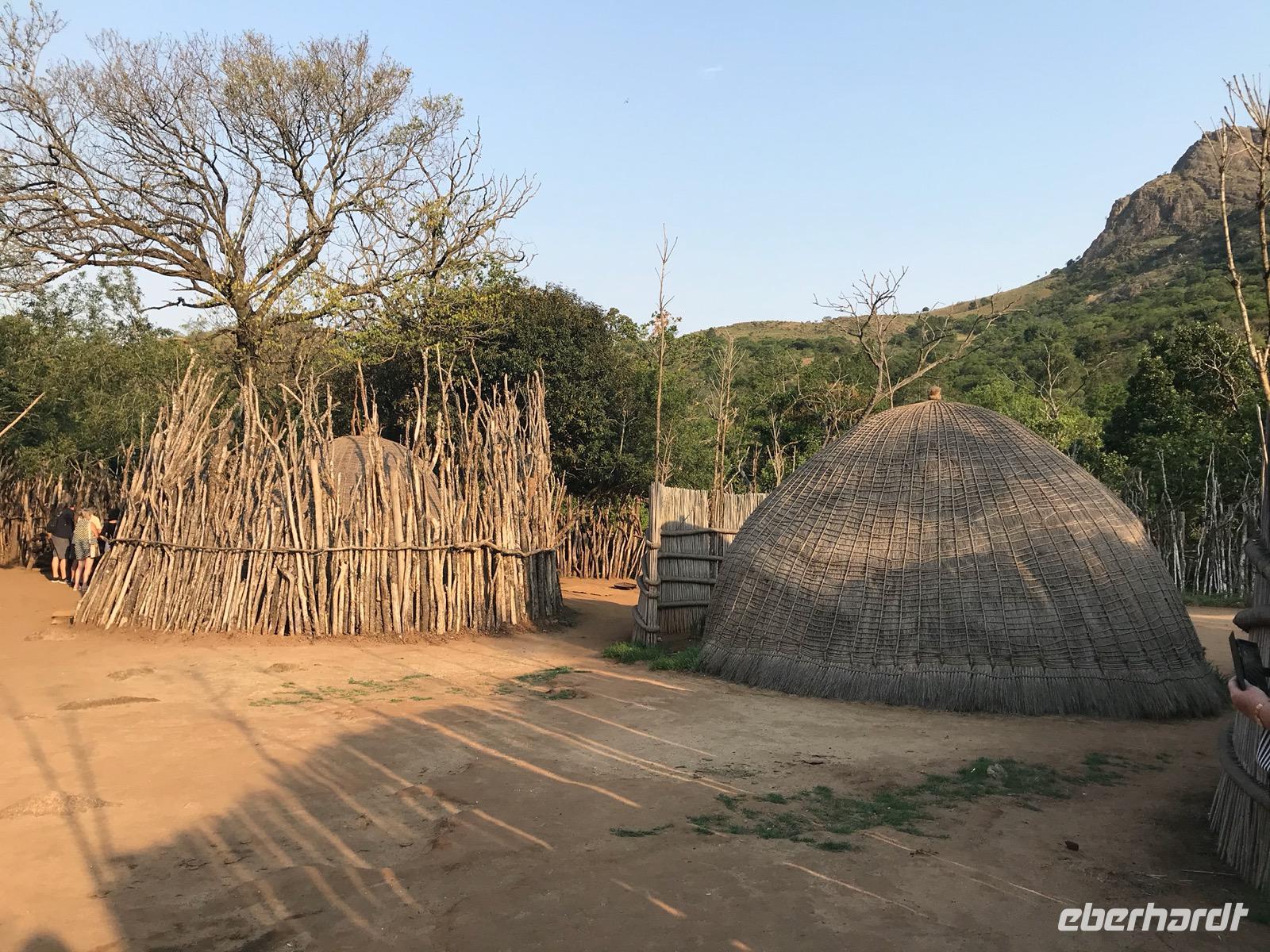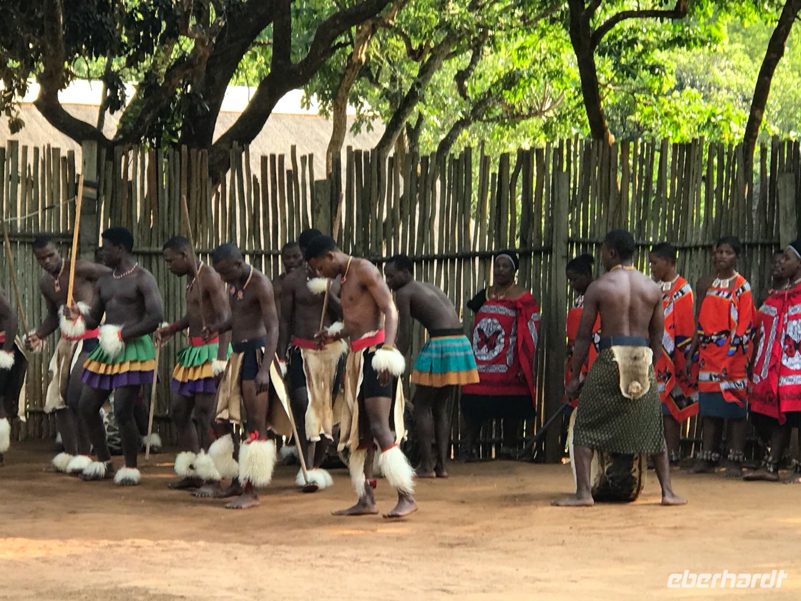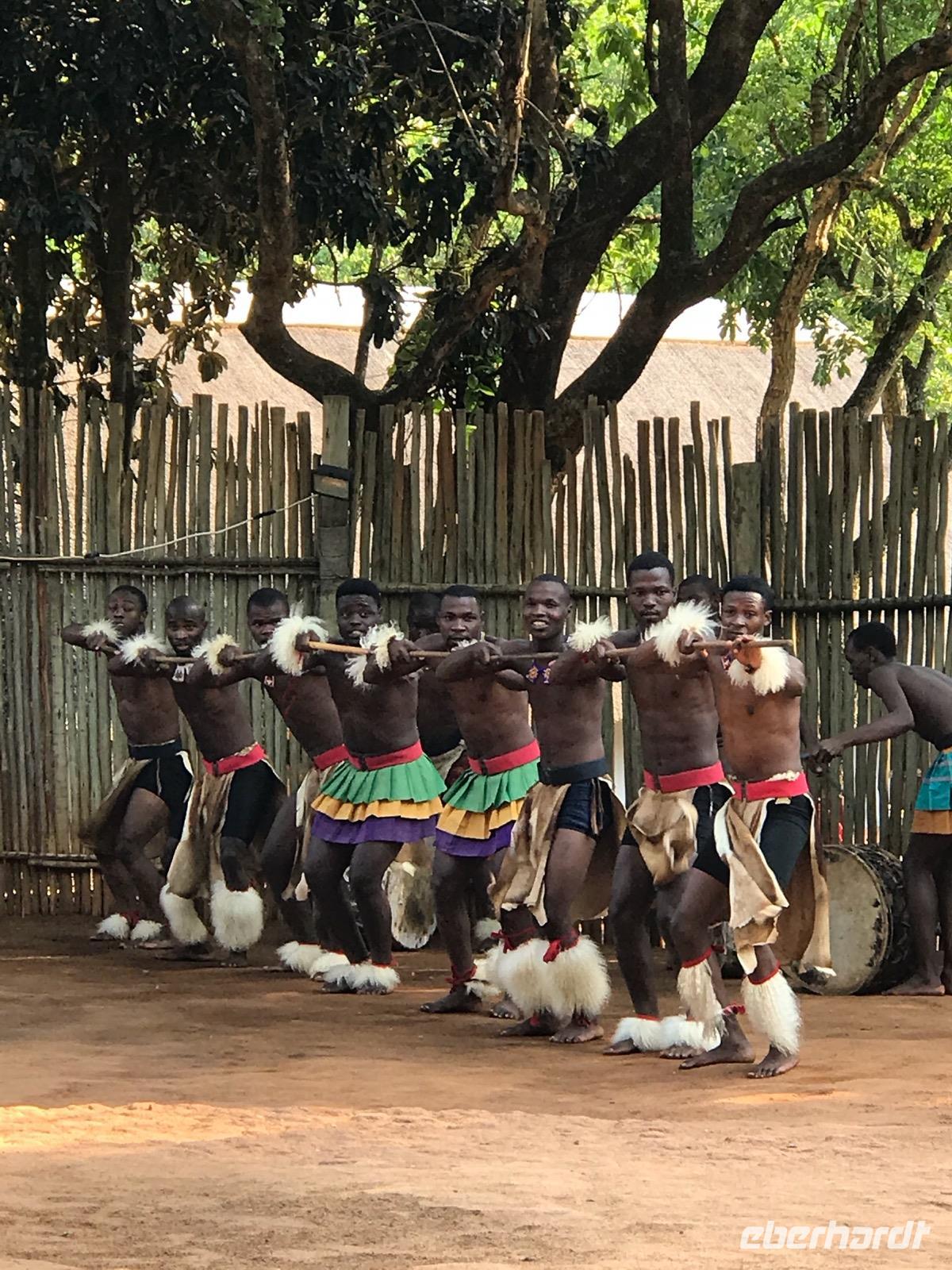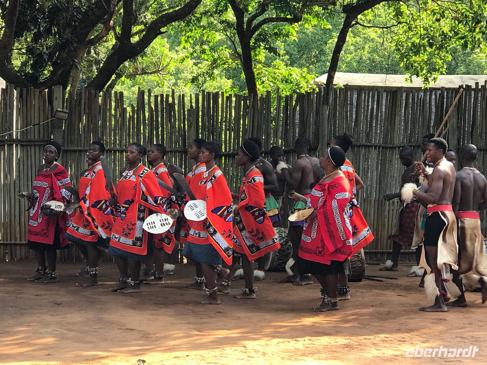Dann reisen wir weiter nach Manzini, wo wir eine Mittagspause haben und den lokalen, so farbenprächtigen Swazi-Markt besuchen. Da kann man den vielen potentiellen Mitbringsels dann doch nicht widerstehen. Weiter geht es vorbei am Sitz der Königin Mutter und der Hauptstadt Mbabane nach Mantenga Village. Hier befindet sich im Grunde das Freilichtmuseum eines typischen Dorfes, wie es tatsächlich bei den Swazi üblich war. Wir erleben zunächst eine Tanz- und Gesangsgruppe in ihrer farbenfrohen, traditionellen Bekleidung. Und es ist ein bleibendes Erlebnis, diese Menschen singen und tanzen zu sehen. Die kraftvollen Tänze erzählen Geschichten oder Legenden, die wir leider nur schwer verstehen. Dann führt uns eine junge Swazi-Frau durch das Dorf, das in Wahrheit aus den Zimmern einer einzigen Familie besteht, und erklärte die einzelnen runden Häuser, die verschiedenen Symbole und die Traditionen der Menschen. Wir lernen etwas über die Rolle der Frauen und der Großmutter in einer solchen Gemeinschaft. Wenn es auch nicht so bequem in diesen Häusern ist, so wäre uns doch eine derart gut organisierte Familie in unserer heutigen Gesellschaft ganz lieb.