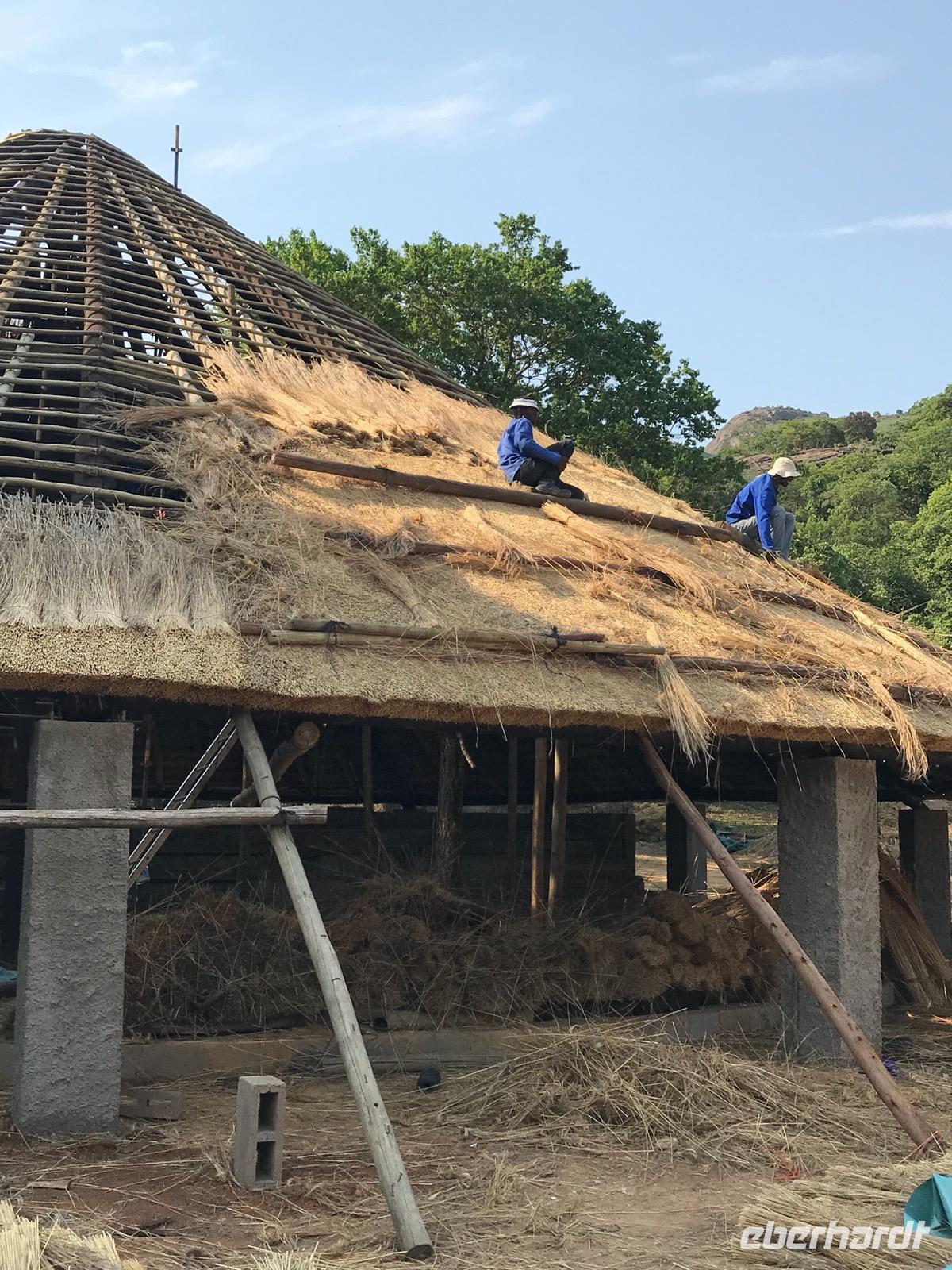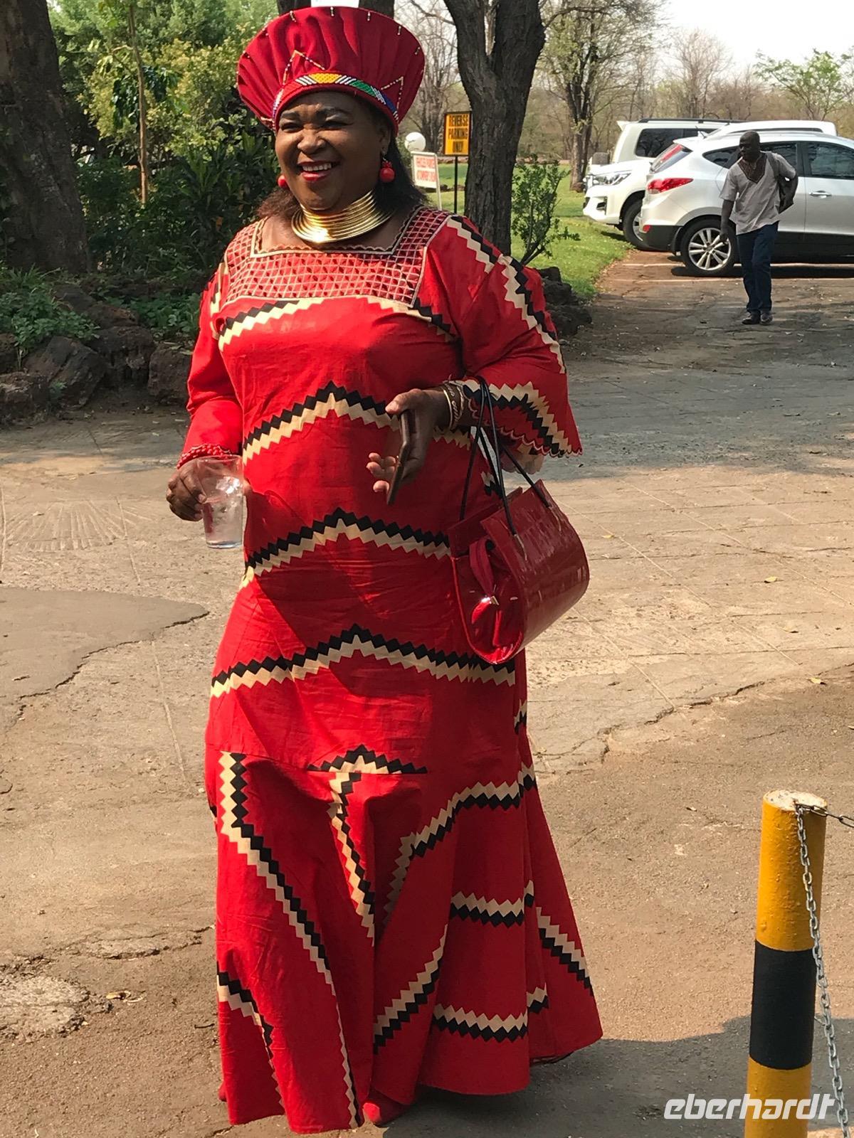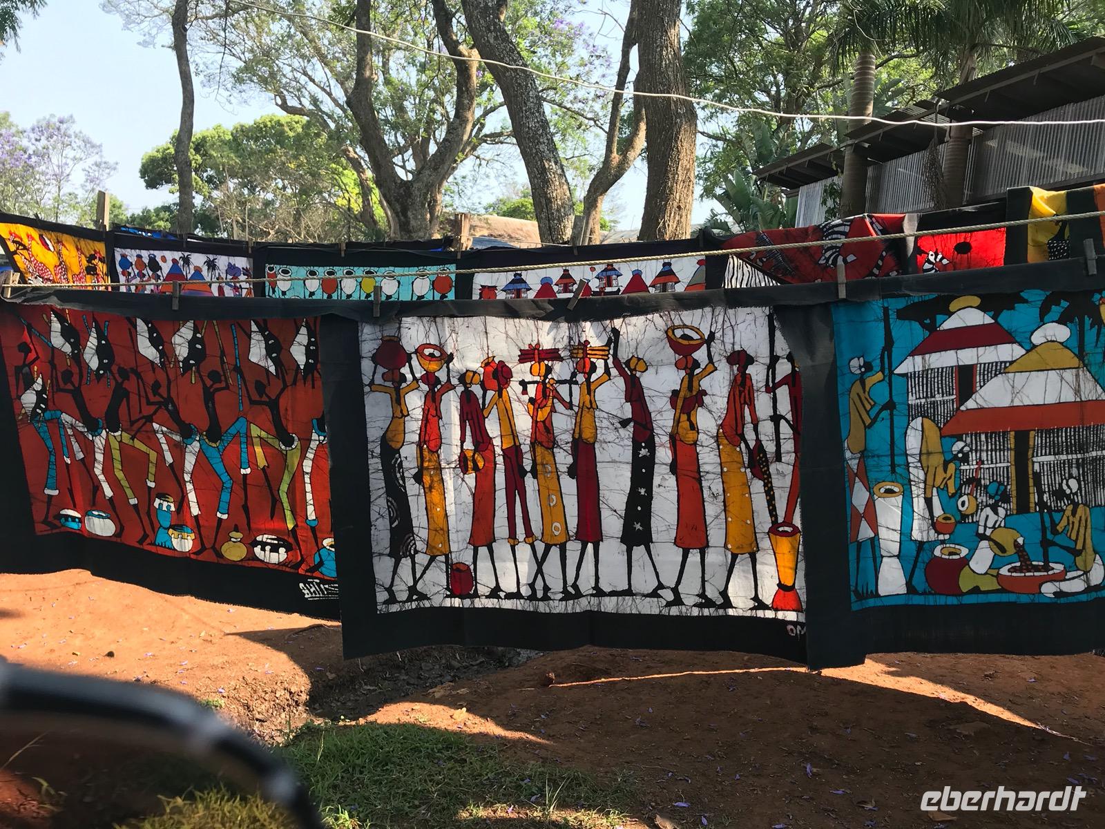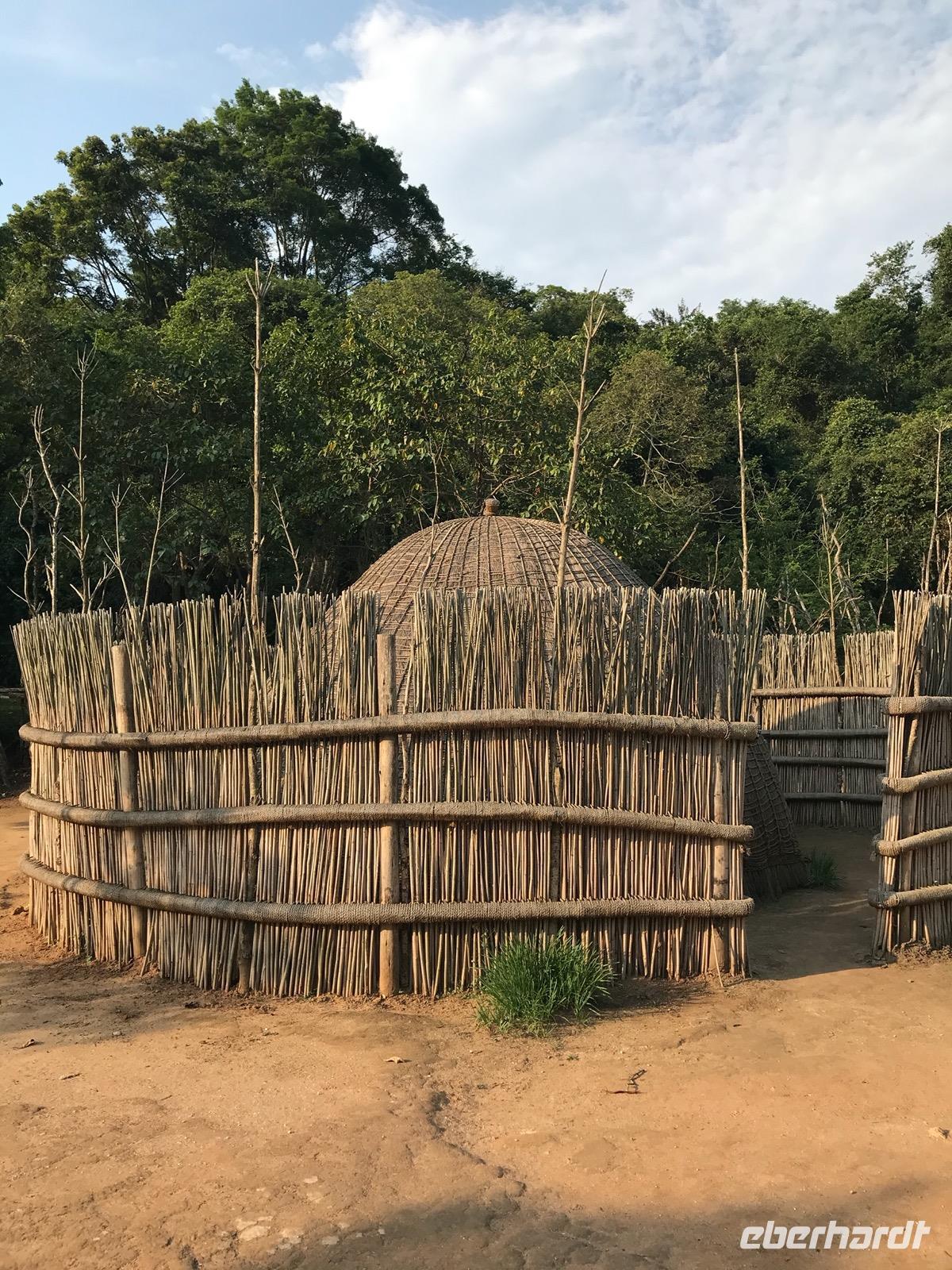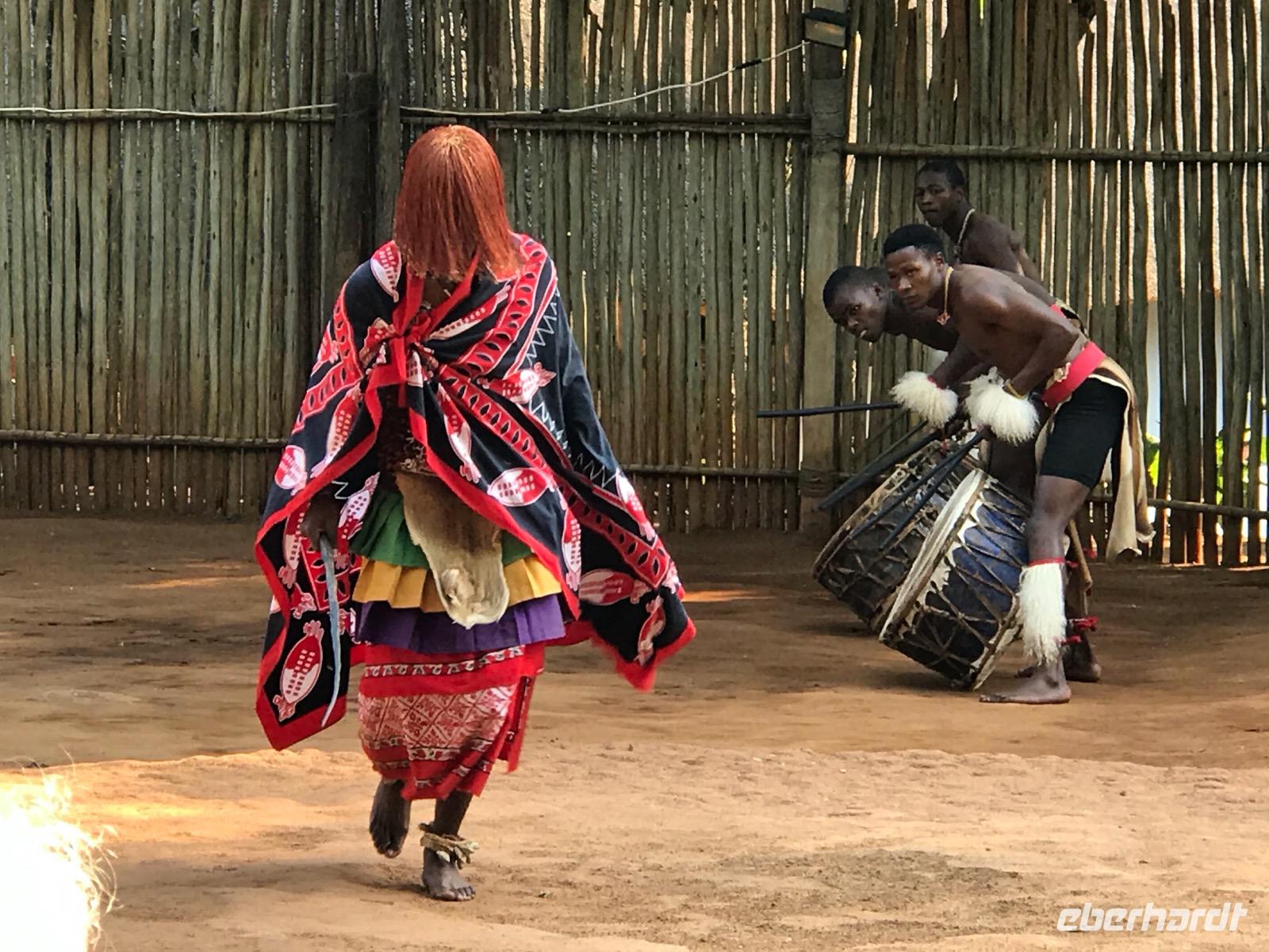 Dann reisen wir weiter nach Manzini, wo wir eine Mittagspause haben und den lokalen, so farbenprächtigen Swazi-Markt besuchen. Da kann man den vielen potentiellen Mitbringsels dann doch nicht widerstehen. Weiter geht es vorbei am Sitz der Königin Mutter und der Hauptstadt Mbabane nach Mantenga Village. Hier befindet sich im Grunde das Freilichtmuseum eines typischen Dorfes, wie es tatsächlich bei den Swazi üblich war. Wir erleben zunächst eine Tanz- und Gesangsgruppe in ihrer farbenfrohen, traditionellen Bekleidung. Und es ist ein bleibendes Erlebnis, diese Menschen singen und tanzen zu sehen. Die kraftvollen Tänze erzählen Geschichten oder Legenden, die wir leider nur schwer verstehen. Dann führt uns eine junge Swazi-Frau durch das Dorf, das in Wahrheit aus den Zimmern einer einzigen Familie besteht, und erklärte die einzelnen runden Häuser, die verschiedenen Symbole und die Traditionen der Menschen. Wir lernen etwas über die Rolle der Frauen und der Großmutter in einer solchen Gemeinschaft. Wenn es auch nicht so bequem in diesen Häusern ist, so wäre uns doch eine derart gut organisierte Familie in unserer heutigen Gesellschaft ganz lieb.