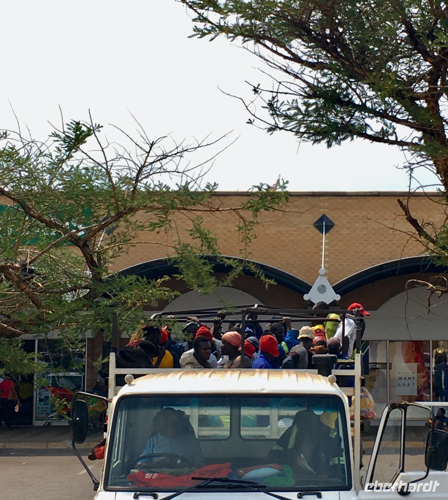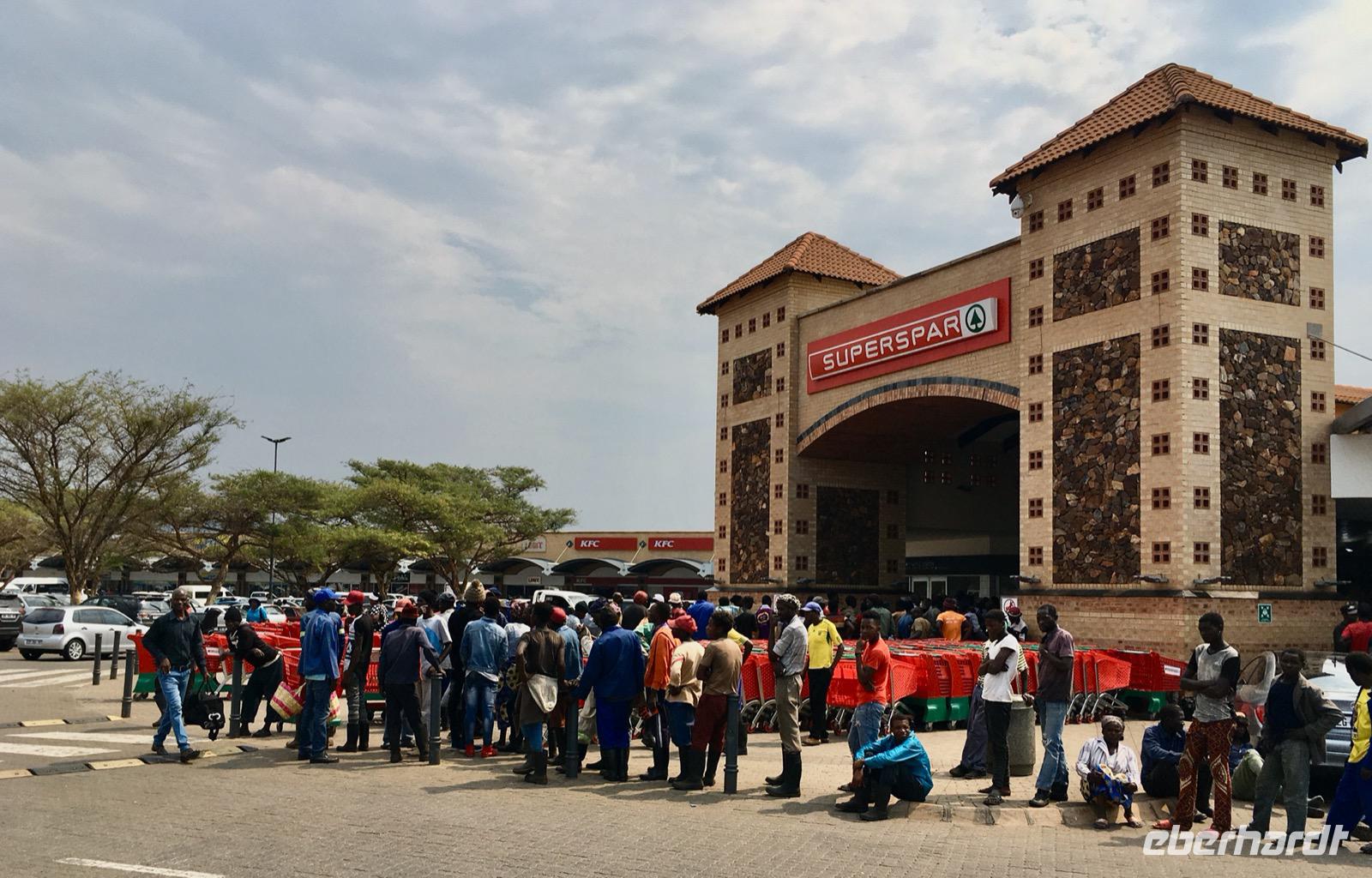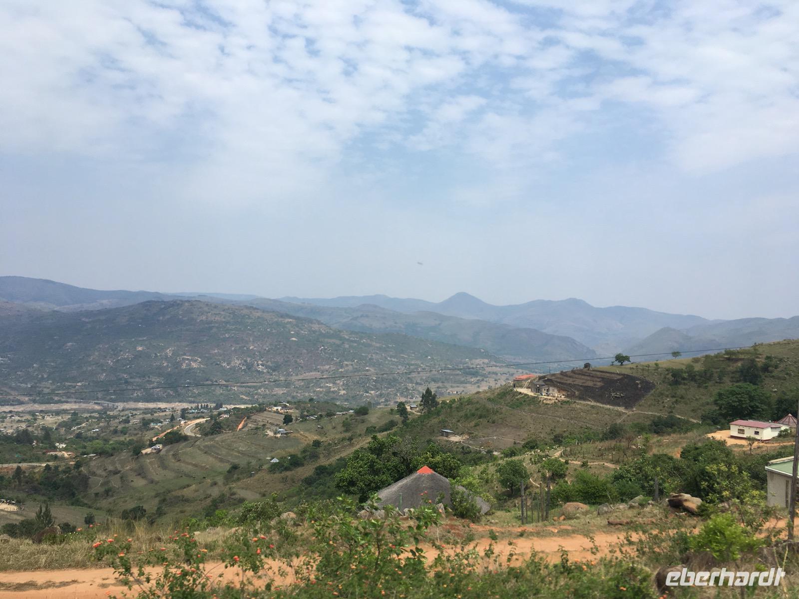 Weiter geht unsere Fahrt über Pigg's Peak zum Grenzposten Jeppe's Reef. Nun folgt das gleiche Prozedere wie bei der Einreise. Alles halb so schlimm und schon passieren wir die Grenze, um unsere Fahrt fortzusetzen, jetzt in Mpumalanga, im Nordosten Südafrikas. Es sind Landschaften mit prächtigen Panoramablicken, mit dichtem Waldbestand an den Berghängen. Hier liefern riesige Kiefern- und Eukalyptuswälder das Holz für das Land. Unterwegs halten wir an einer großen Mall mit vielen Einkaufsmöglichkeiten, um uns eine Mittagspause zu gönnen. Der Platz ist voller Geschäfte und am „Spar" gibt es eine endlose Schlange. Was ist heute los? Es ist Freitagnachmittag. Die Tagelöhner von den Zuckerrohrplantage werden mit Lkw's gebracht, wo sie auf den Ladeflächen stehen, müde und erschöpft von der harten Arbeit sind. Sie holen hier ihren Wochenlohn ab. In diesem Moment denkt man dann darüber nach, wie reich wir doch im Leben beschenkt worden sind.