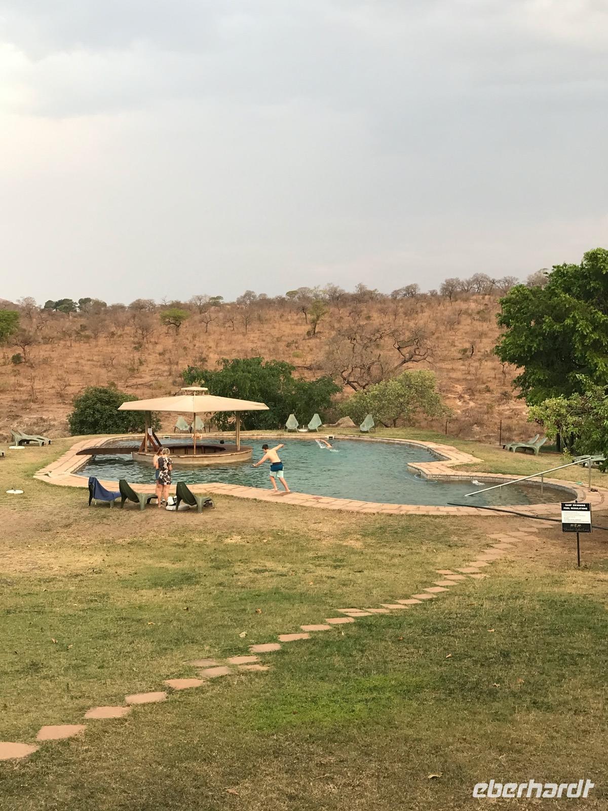 Gegen Mittag stehen die Tiere in Gruppen unter den großen Schirmbäumen und suchen Schatten. Für uns ein bleibend schöner Anblick. Wir fahren am Nachmittag zurück zum Camp und genießen die Zeit am Pool oder auf der Terrasse. Schon morgen geht es weiter.