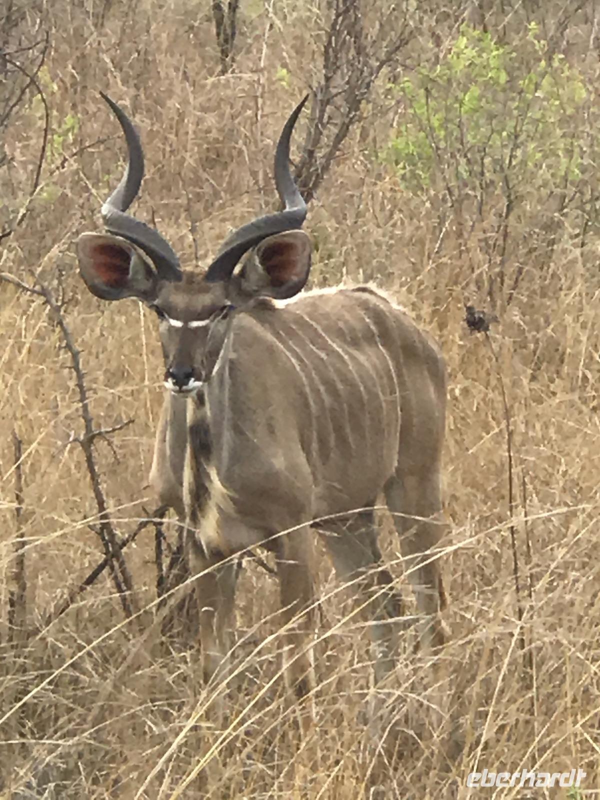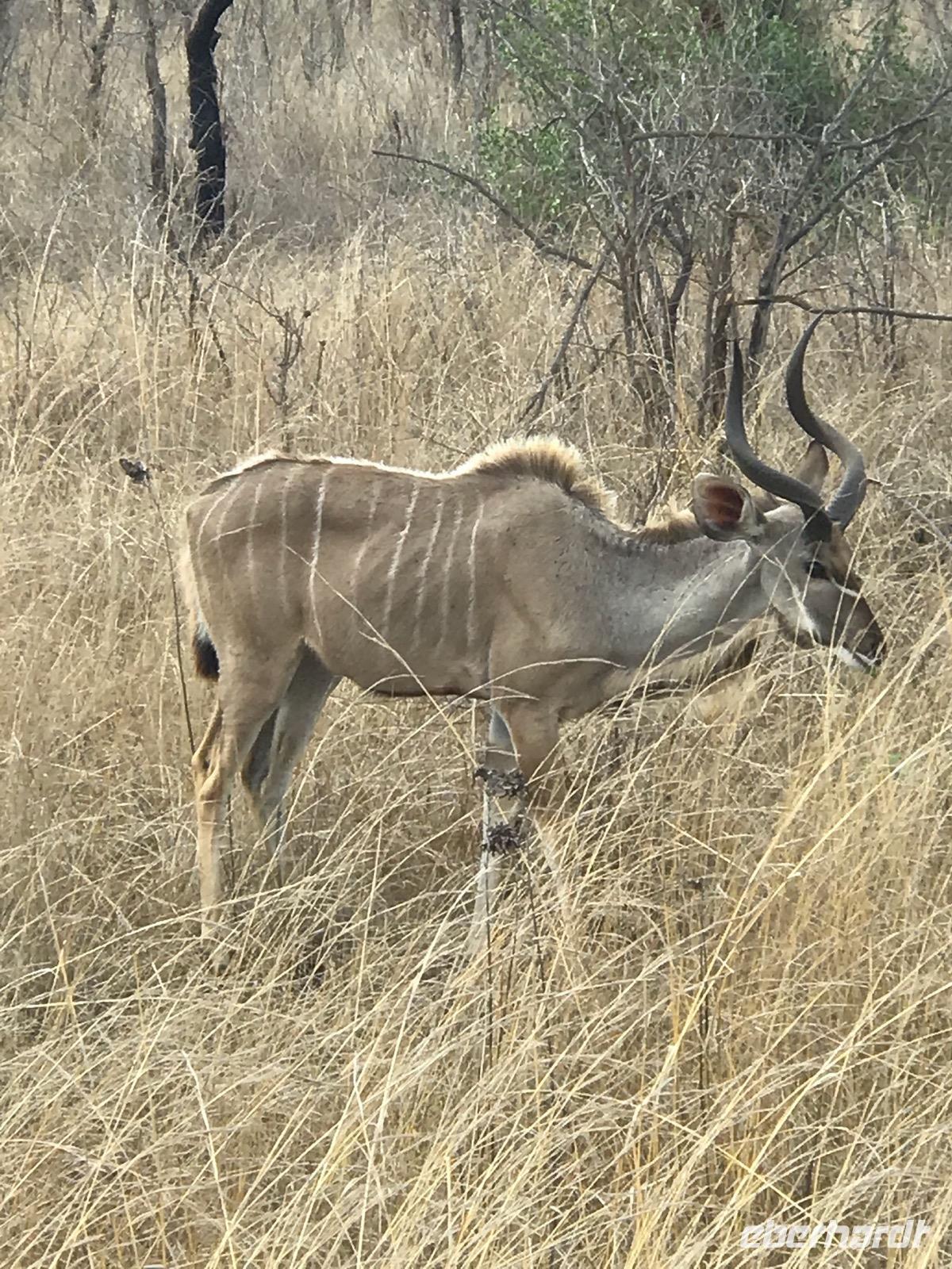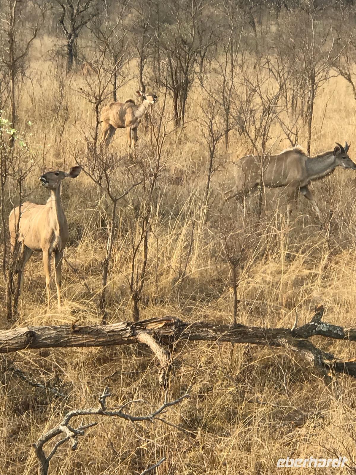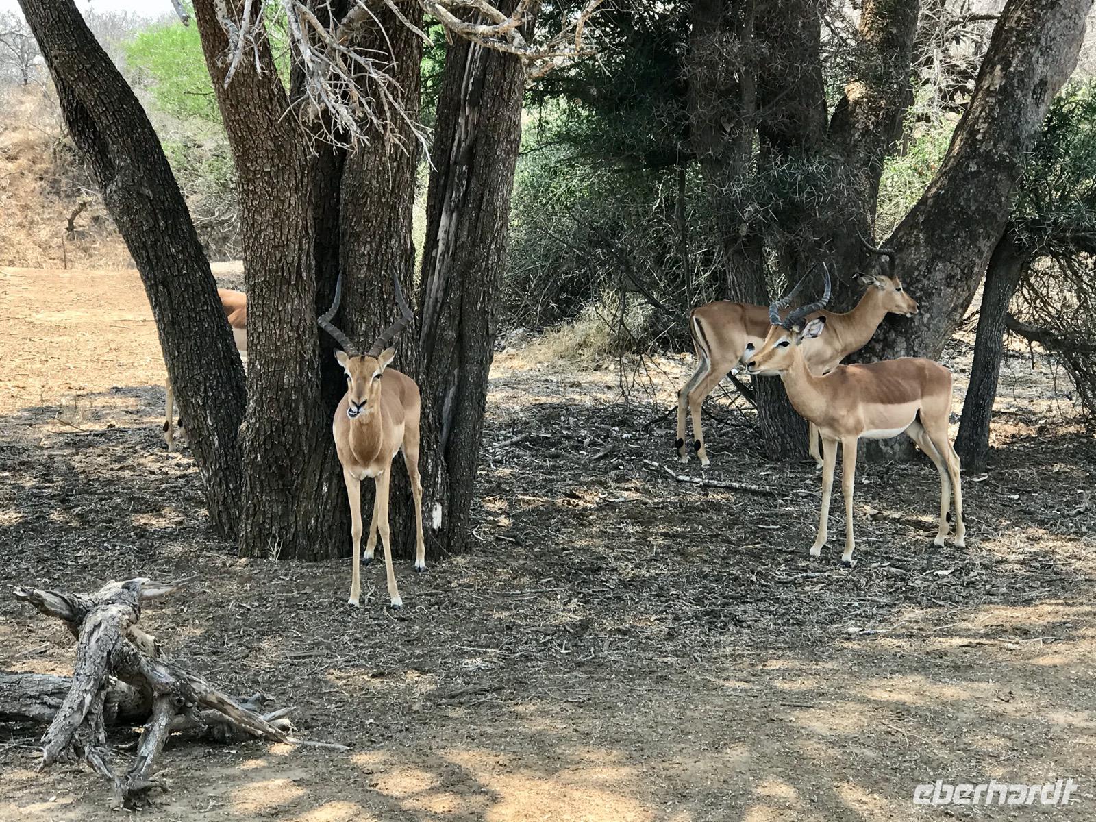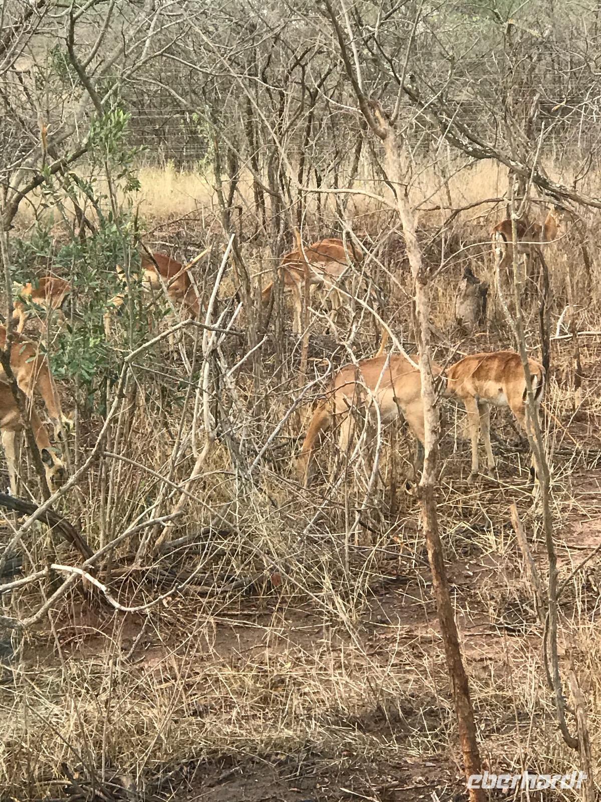 Es geht wieder zeitig zum Frühstück. Um 6 Uhr fahren wir mit dem Bus zum Numbi Tor und steigen dann in drei Jeeps um. Noch ist es kühl. Aber es wird ein Tag, an dem wir es an der frischen Luft kaum noch aushalten. Selbst Sonet meint, diese Temperaturen hätte sie noch nie erlebt. Es wird eine Pirschfahrt auf unbefestigten Wegen. Die Fahrer stehen untereinander in Funkkontakt und so wissen sie stets, wo Tiere ganz nahe zu sehen sind. Zunächst begleiten uns die Impala-Antilopen. Sie sind überaus zahlreich im Nationalpark. Aber wir sehen auch andere Antilopen, wie Kudu mit dem Schraubengehörn bei den Männchen und den weißen Streifen im Gesicht, Wasserböcke, die sich stets in Wassernähe aufhalten, um der Attacke von Löwen zu entkommen, Springböcke, die ziemlich klein sind und voller Angst davonlaufen, und viele andere kleine Hornträger, die wir nicht zu unterscheiden wissen.