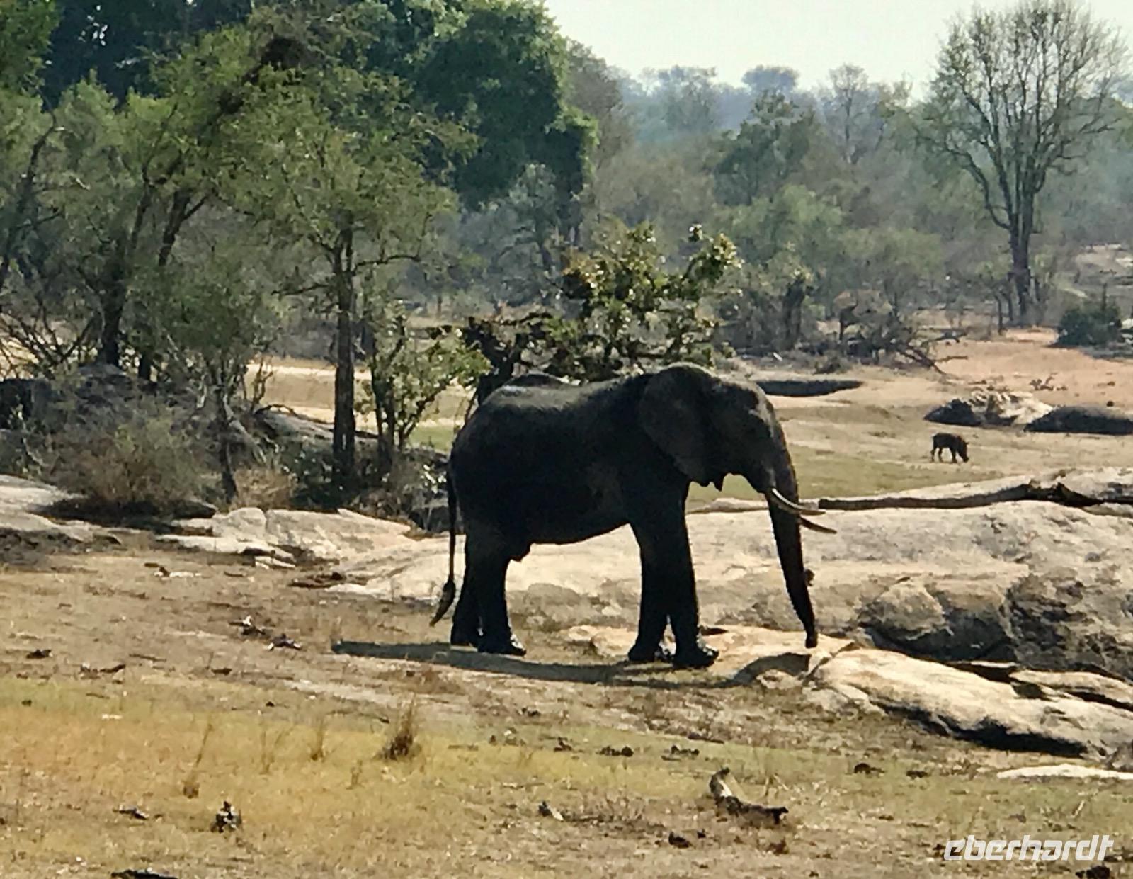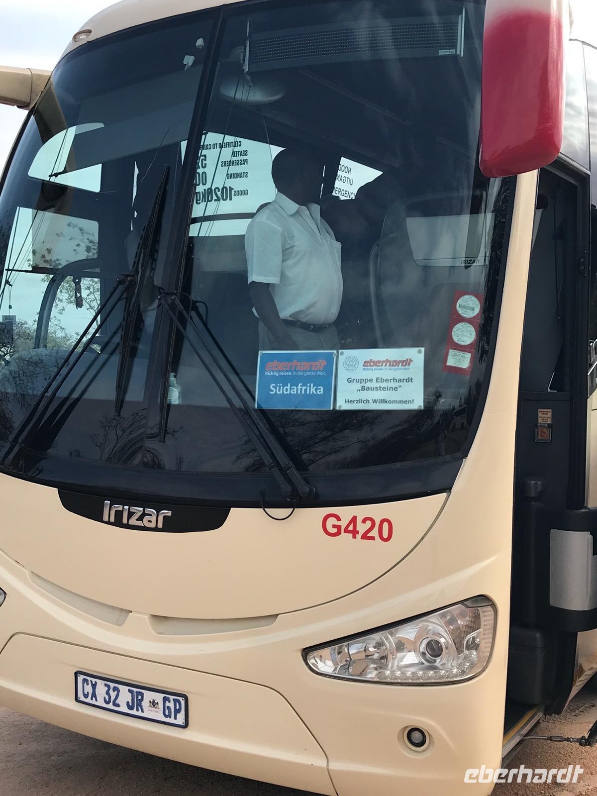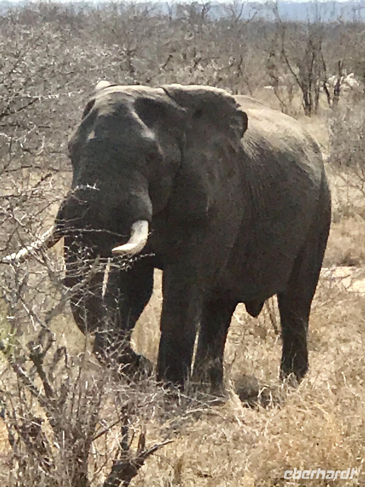 Es heißt frühzeitig aus den Betten, Frühstück ab 5:30 Uhr, Abfahrt 6:30 Uhr. Wir wollen Tiere sehen und die schlafen nicht so lange. Unsere heutige Safari findet mit dem Bus statt und wir fahren nur entlang der Asphaltstraßen. Ob man da etwas zu Gesicht bekommt, zweifelt so mancher. Aber wir sind dann doch überrascht. Wir sind auf der Suche nach den großen Tieren der „Big Five", Elefant, Löwe, Leopard, Büffel und Nashorn. Am Abend dann stellen wir fest, dass wir bis auf den Löwen alles gesehen haben, und noch viel mehr Säugetiere, Reptilien und Vögel.