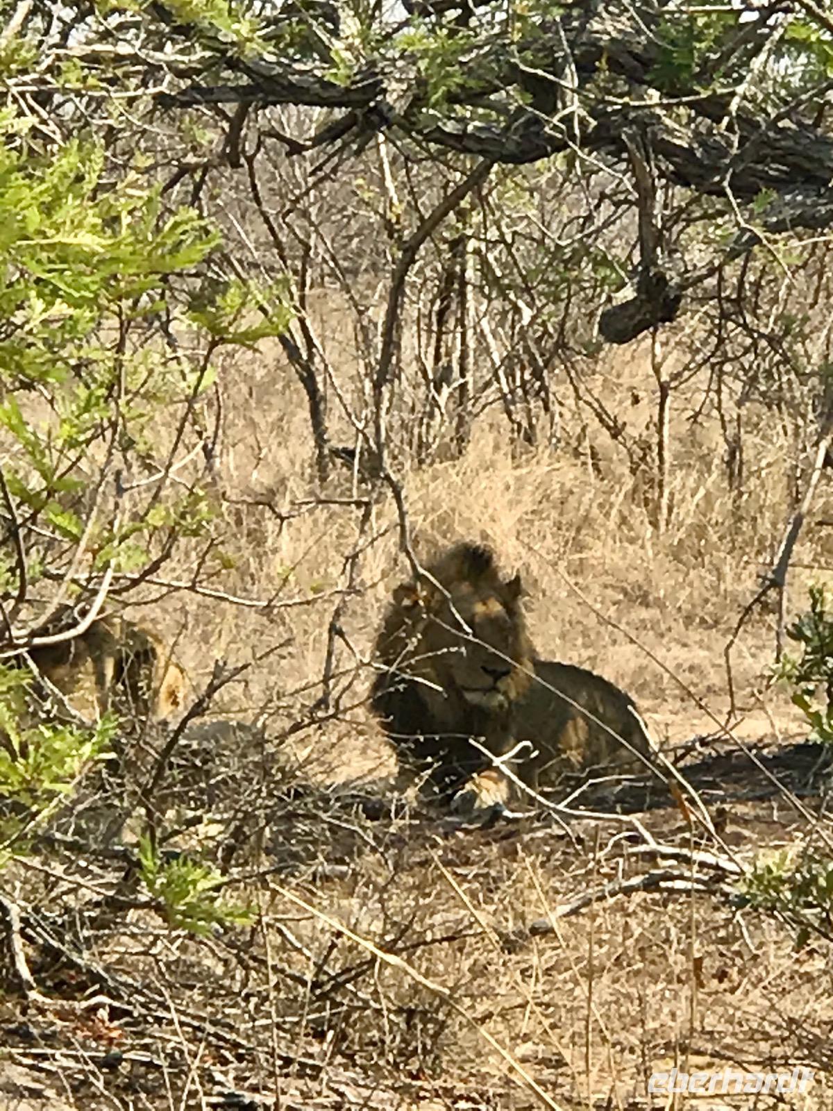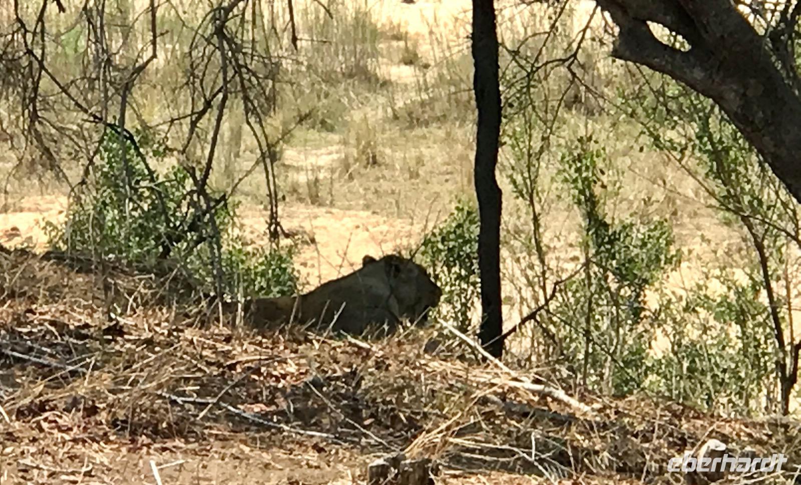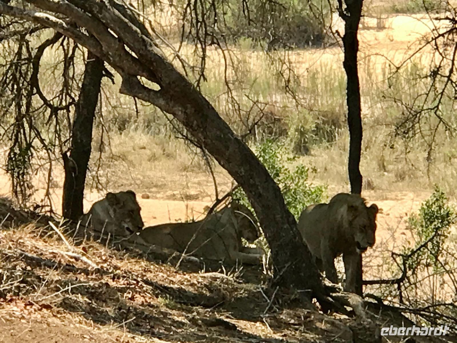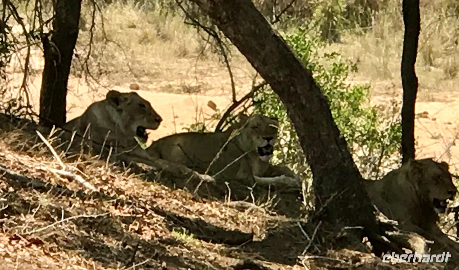 Bald schon treffen wir wieder auf die massigen Büffel mit ihren großen gebogenen Hörnern, die uns misstrauisch ansehen. Aber diesmal sehen wir auch Giraffen, allein oder zu zweit. Lange schauen wir ihnen zu, wie sie den Hals recken, um noch ganz oben ein Blättchen pflücken zu können, dass sie mit ihrer 15 cm langen Zunge quasi umschlängen. Da gibt es auch Zebras mit den hellbraunen Streifen zwischen den schwarzen. Sie sind in Herden und die neugeborenen Jungtiere brauchen eine Woche, um sich das Streifenmuster der Mutter gut einprägen zu können. Zu unseren Lieblingen zählen wieder die Elefanten, so kraftvoll wirken sie, so vereint in einer Gruppe von 30-50 Tieren leben sie. Sie haben Spaß, sich mit Wasser und Erde zu bespritzen. Und dann der Höhepunkt, die Löwen. Wir haben sie wirklich zu Gesicht bekommen. Sie ruhen in Gruppen unter Bäumen, fast friedlich und gemütlich. Sie warten auf den Abend, die Kühle. Und dann werden sie jagen. Jetzt aber sind die Antilopen nicht allzu weit und es scheint, als ob sie keine Angst vor den Löwen hätten.