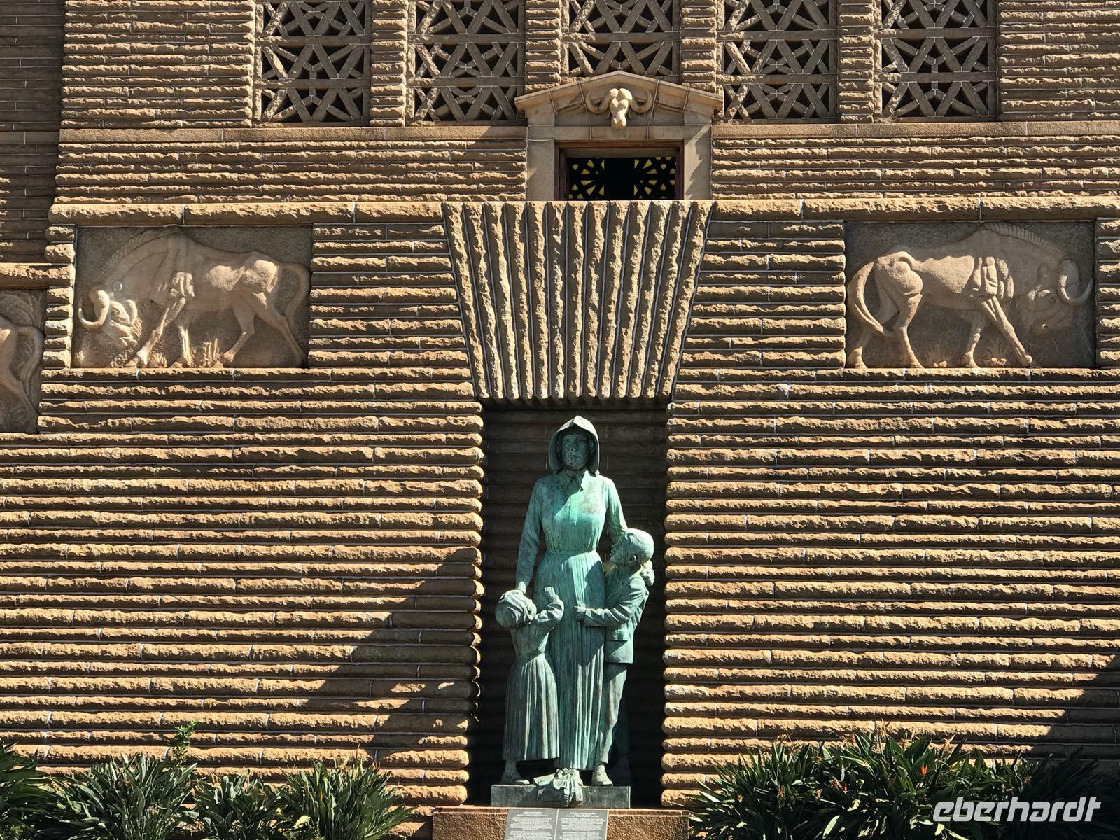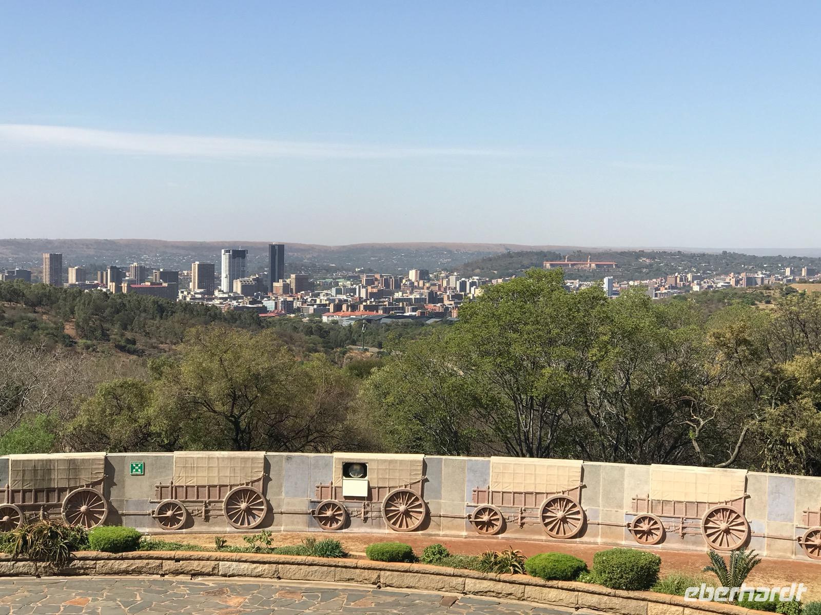 Zunächst fahren wir nach Pretoria, in die Regierungshauptstadt. Wir kommen zügig voran auf der Straße N4, vorbei an Nelspruit, Belfast und halten schließlich für einen längeren Aufenthalt am Voortrekker Monument. Es erinnert an die Burenpioniere, die um 1830 der britischen Vorherrschaft am Kap entflohen. Das Monument wurde 1938 erbaut, 100 Jahre nach der Schlacht am Blood River und ist ein Symbol für die Einheit der Buren. Es müssen sehr mutige Menschen gewesen sein, gottvertrauend und unerschrocken, die sich auf den Großen Treck in eine neue Heimat begeben haben. Das Museum im Monument gibt ein wenig Einblick in diese Zeit der kolonialen Eroberung Südafrikas.