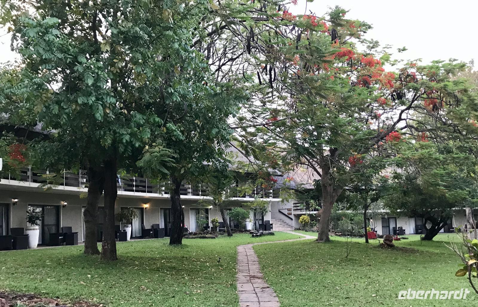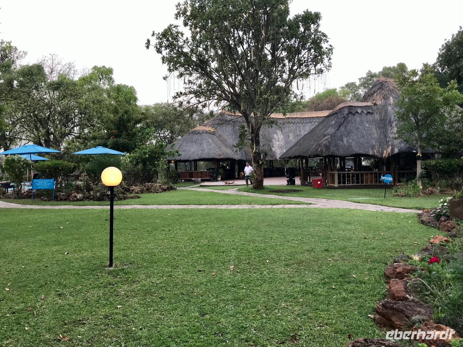 Weiter geht es dann zur A ZAMBEZI RIVER LODGE, wo wir übernachten. Eine Lodge direkt am Fluss. Schilder weisen auf Krokodile hin. Aber wir sehen sie nur im Wasser. Die Hotelanlage ist traumhaft, mit Pool und wilden Tieren, zum Entspannen. Das Abendessen findet im Freien statt. Das Buffet ist umfangreich und man findet da Steaks vom Springbock, Fleisch vom Krokodilschwanz, Gebratenes vom Kudu... Und die besondere Einlage ist eine Tanz- und Gesangsshow der ortsansässigen Afrikaner. Beeindruckend und Freude vermittelnd.