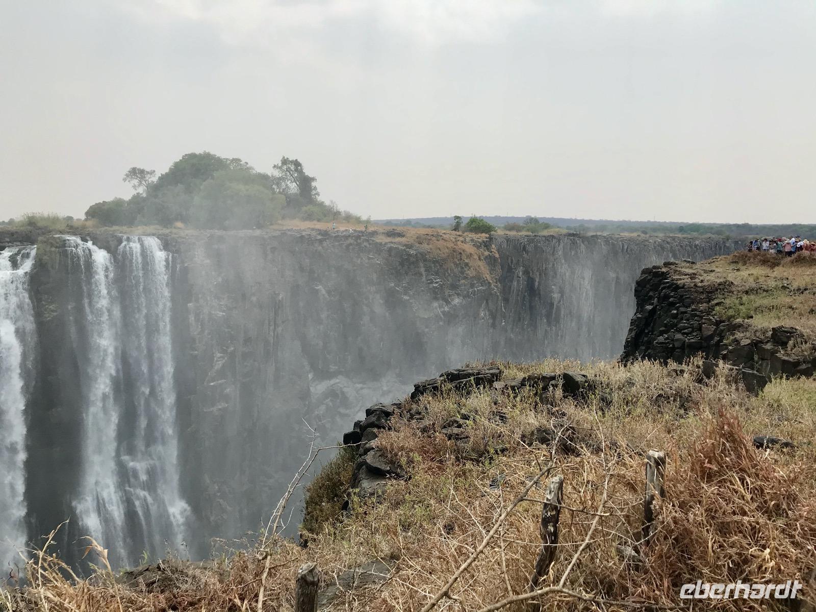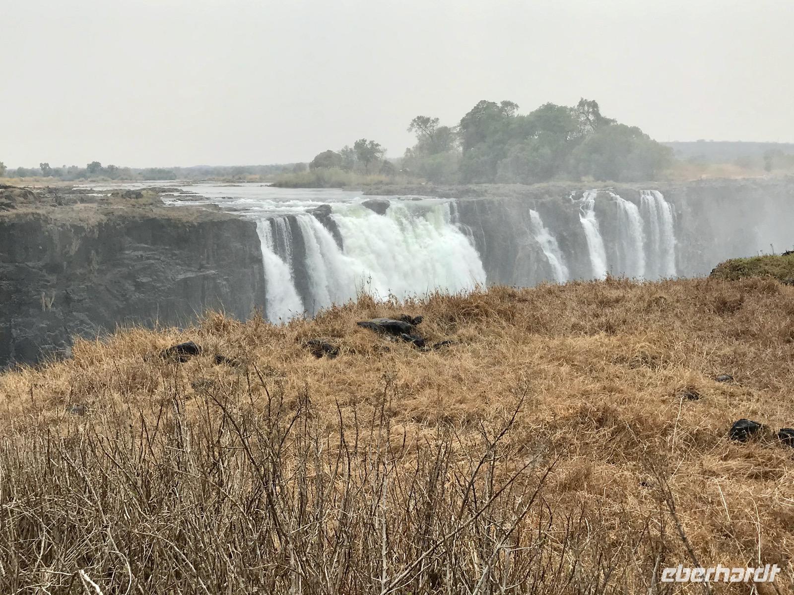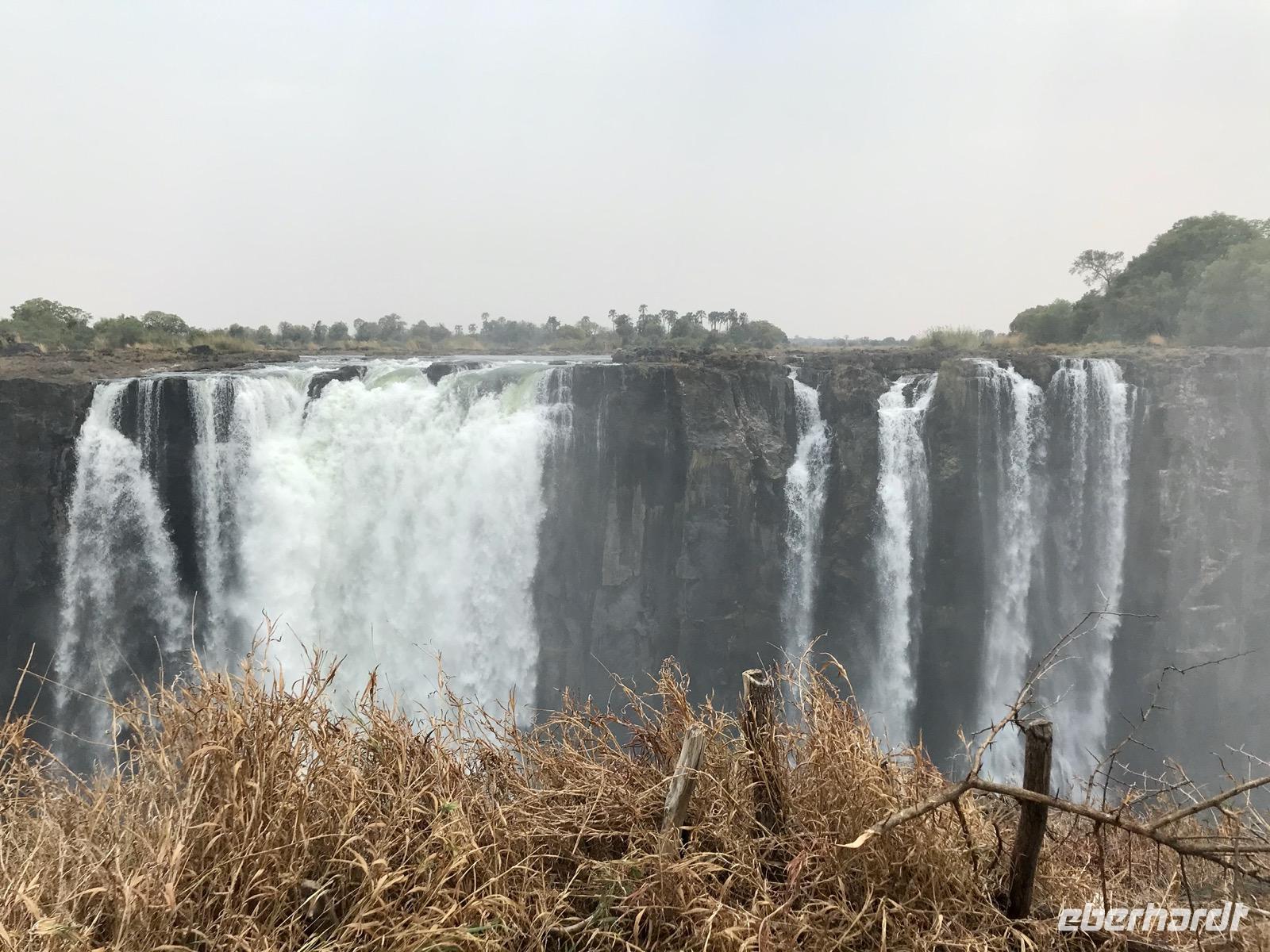 Wir werden am Morgen von unserem Guide Mafios, der gleichzeitig der Fahrer des Busses ist, abgeholt und zu den Victoriafällen gebracht. Die Wasserfälle liegen zwischen Victoria Falls in Simbabwe und Livingston in Sambia in einem Naturschutzpark, in dem man auf Wegen durch den Regenwald entlang der Wasserfälle geleitet wird. Unser Guide erzählt uns über die Entdeckung der Wasserfälle durch David Livingston im Jahr 1855 und geleitet uns auf den Wegen. Die Gicht des Wassers ist nicht allzu stark, den im Mittelteil und im östlichen Teil sind die Victoriafälle ohne Wasser und man kann die schroffen und steilen Basaltfelswände sehen, an denen normalerweise das Wasser über 100 Meter in die Tiefe stürzt. Wir gehen bis zur Brücke über den Sambesi, der sich hier eher als Rinnsal zeigt, und die hinüber nach Sambia führt.