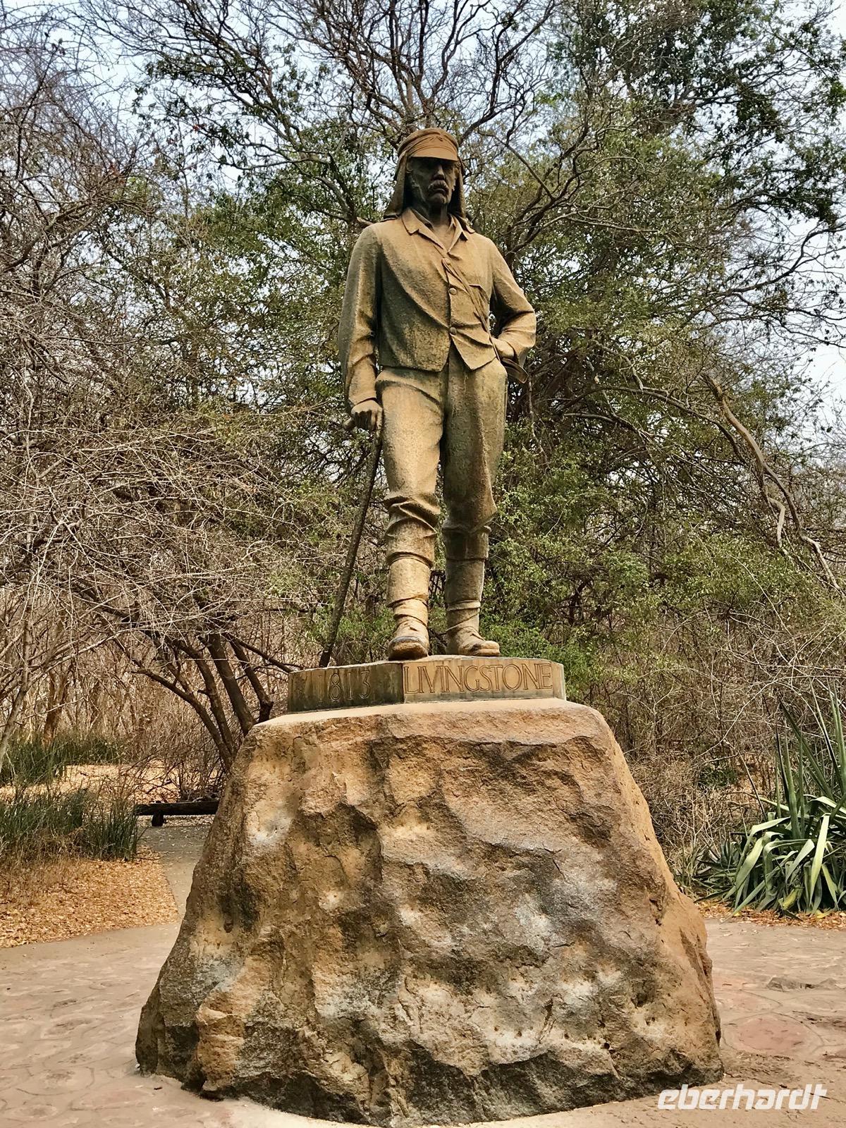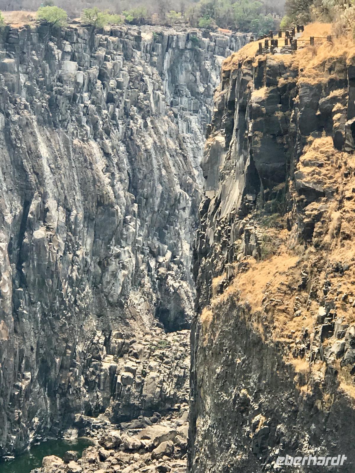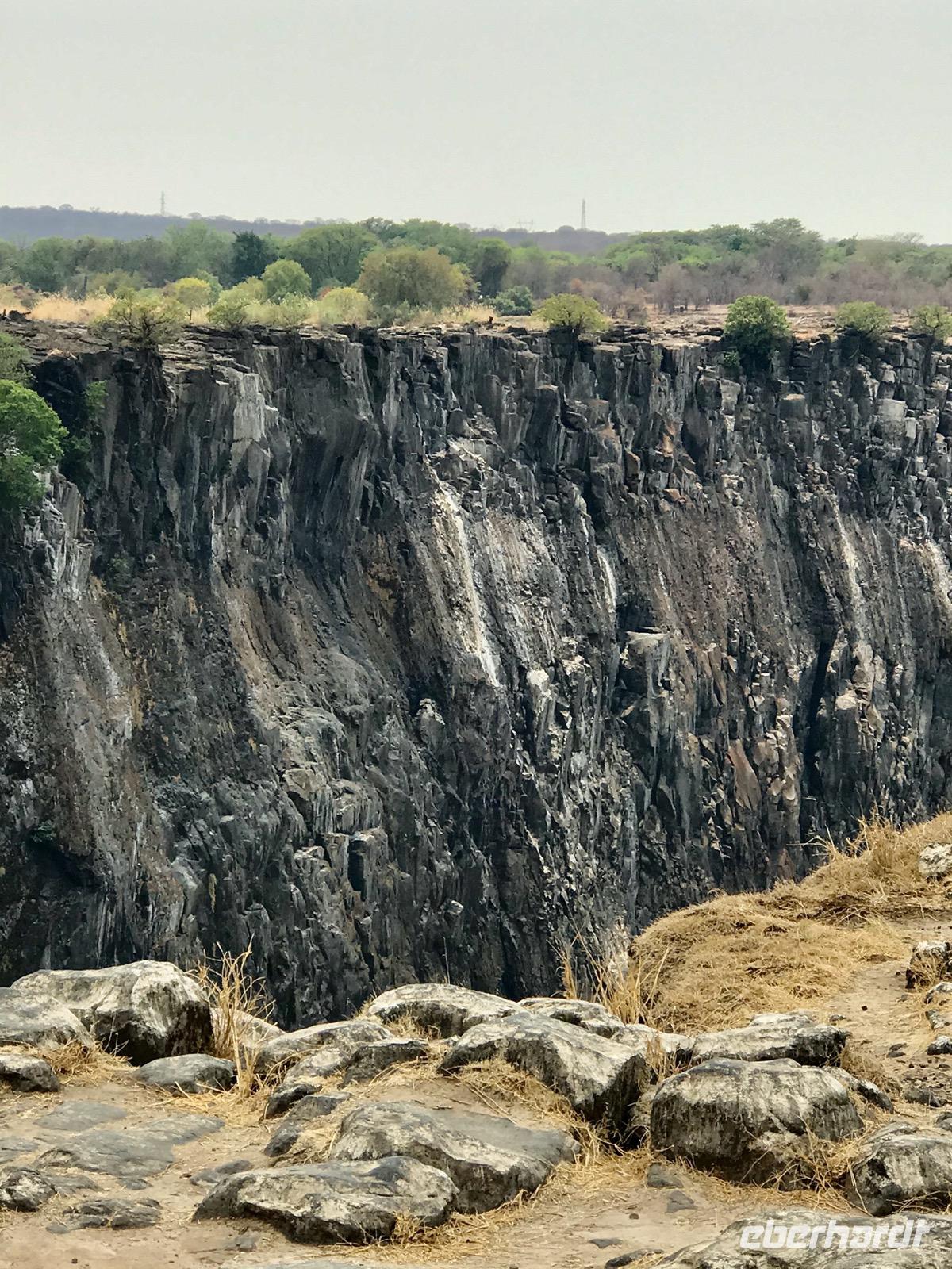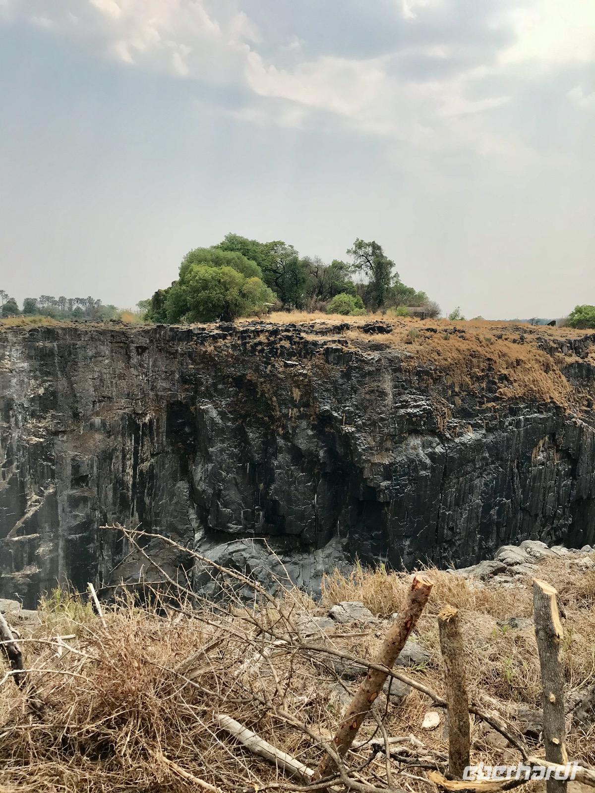 Wir werden am Morgen von unserem Guide Mafios, der gleichzeitig der Fahrer des Busses ist, abgeholt und zu den Victoriafällen gebracht. Die Wasserfälle liegen zwischen Victoria Falls in Simbabwe und Livingston in Sambia in einem Naturschutzpark, in dem man auf Wegen durch den Regenwald entlang der Wasserfälle geleitet wird. Unser Guide erzählt uns über die Entdeckung der Wasserfälle durch David Livingston im Jahr 1855 und geleitet uns auf den Wegen. Die Gicht des Wassers ist nicht allzu stark, den im Mittelteil und im östlichen Teil sind die Victoriafälle ohne Wasser und man kann die schroffen und steilen Basaltfelswände sehen, an denen normalerweise das Wasser über 100 Meter in die Tiefe stürzt. Wir gehen bis zur Brücke über den Sambesi, der sich hier eher als Rinnsal zeigt, und die hinüber nach Sambia führt.