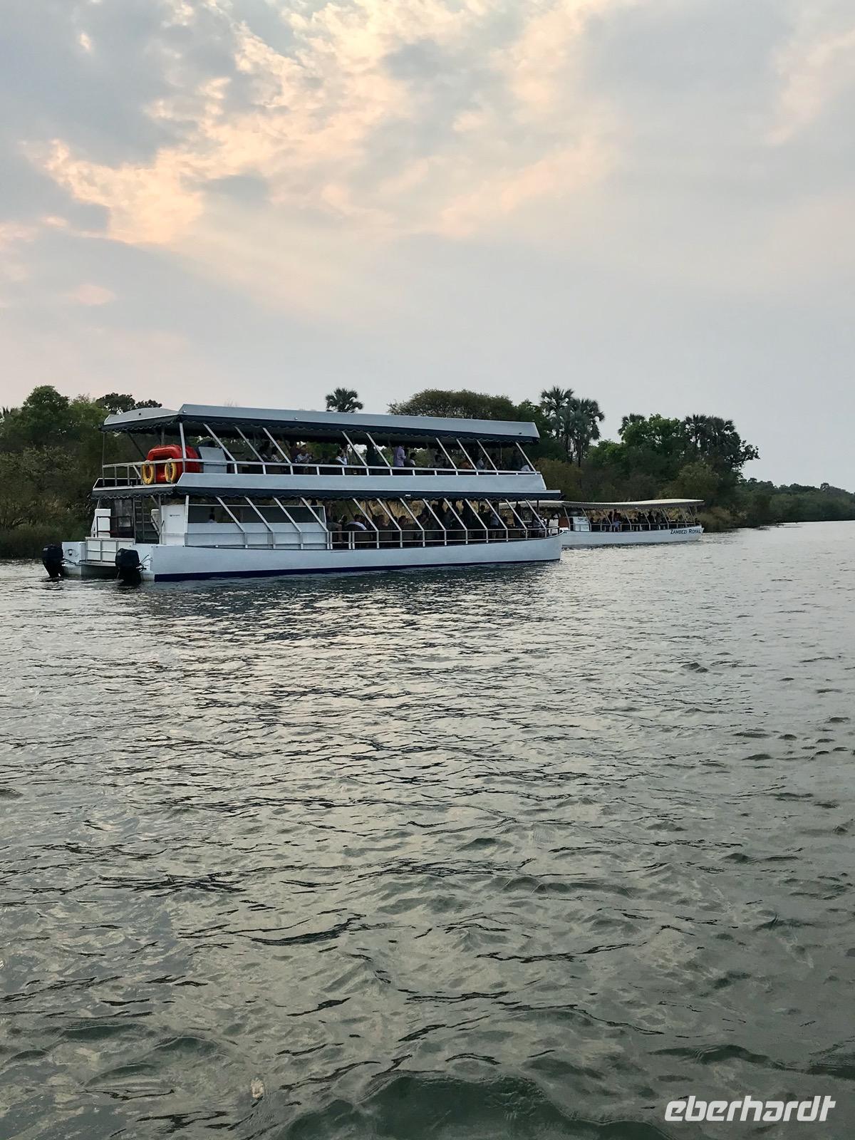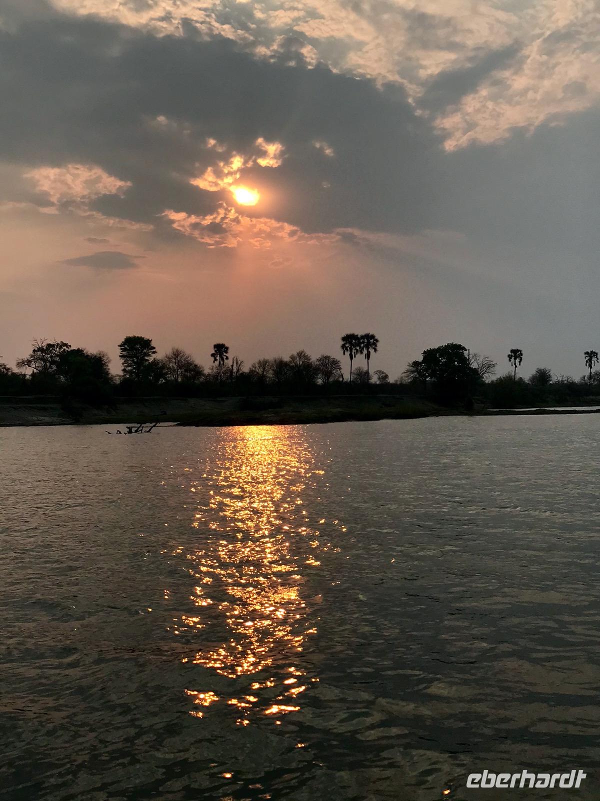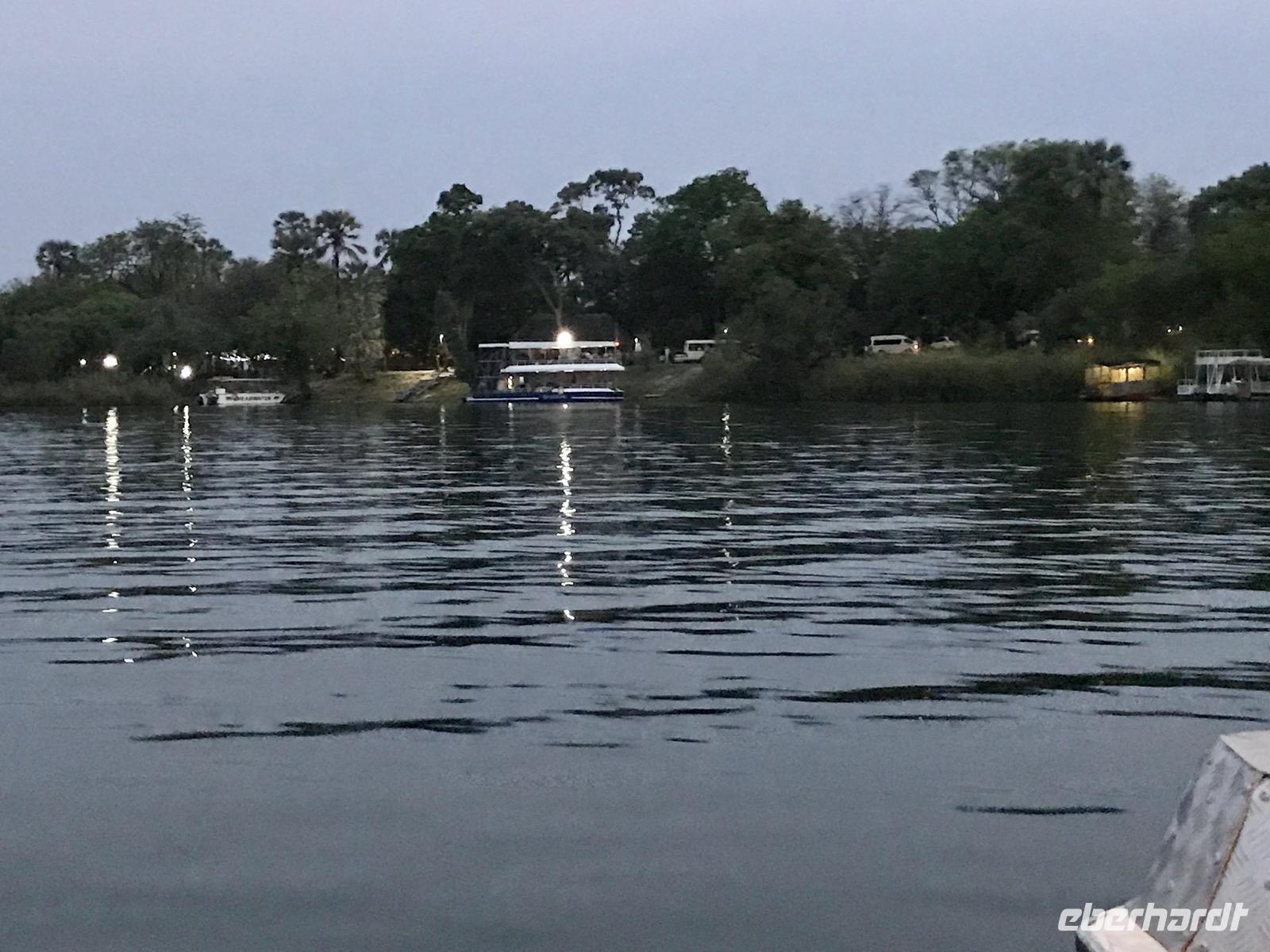 Am späten Nachmittag haben wir dann eine Sonnenuntergangsfahrt mit dem Boot auf dem oberen, breiten Sambesi, bevor er sich in die Schlucht stürzt. Es ist für alle Gäste ein unvergesslich schöner Abend als Abschluss unserer Reise. Der gewältige Sambesi, viertgrößter Fluss Afrikas, die Tiere am Ufer bei Sonnenuntergang, die sich von der Hitze des Tages erfrischen, die Flusspferdfamilien im Wasser, die auf Sandbänken ruhen und selbst nicht schwimmen können, aber im Wasser bleiben müssen, damit die Haut nicht verbrennt, Krokodile, die uns nur ihre Nasen zeigen und doch da sind, glückliche Menschen an Bord, die Afrika gesucht und gefunden haben, freundliche Afrikaner, die uns die Facetten ihrer Heimat und ihre Gastfreundschaft nahebringen und dann die untergehende Sonne am Horizont, schnell und endgültig. Wir danken für den schönen Abend.