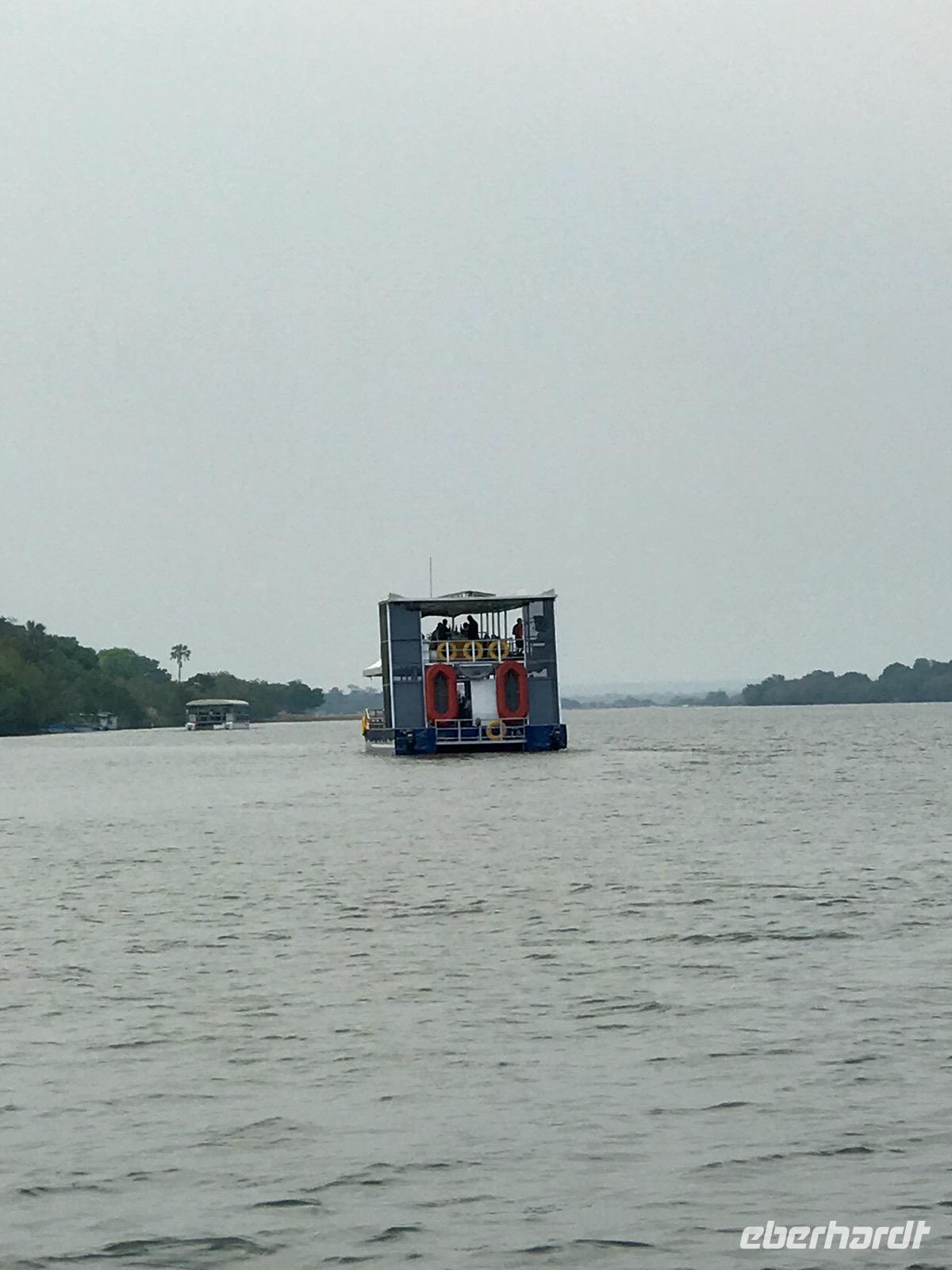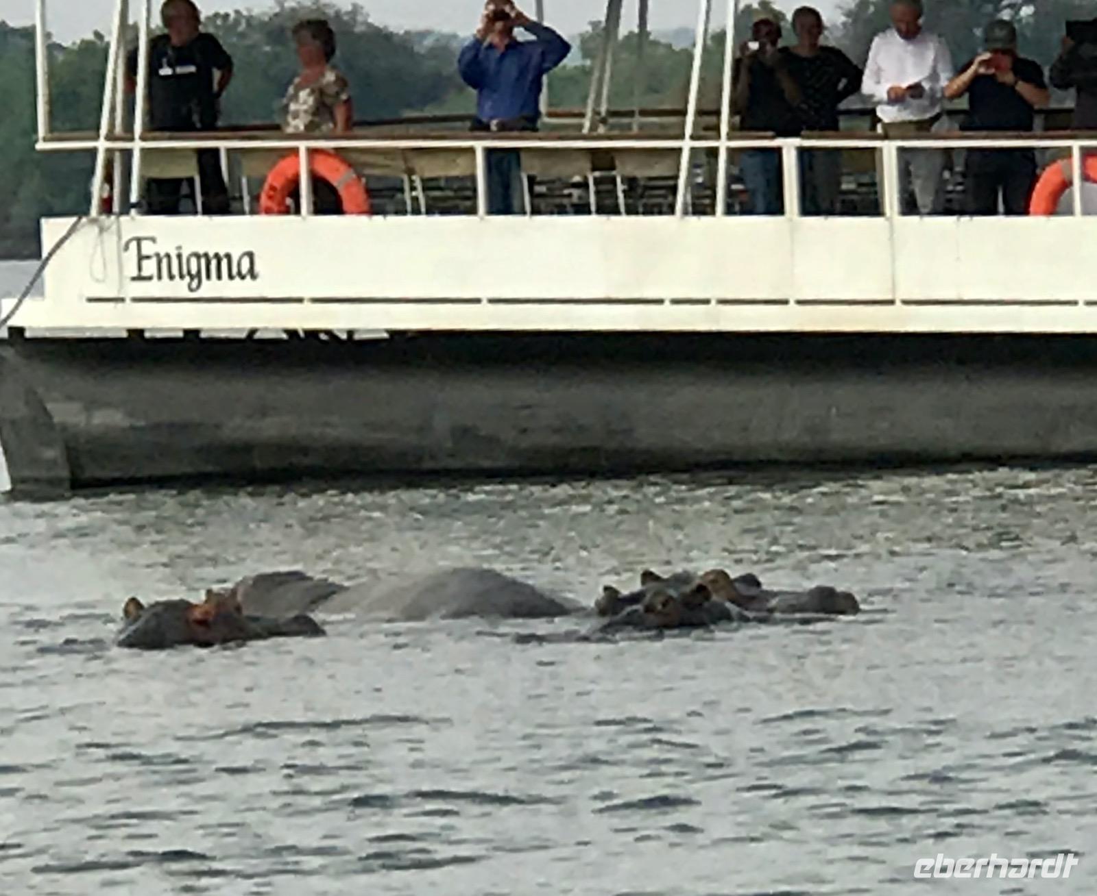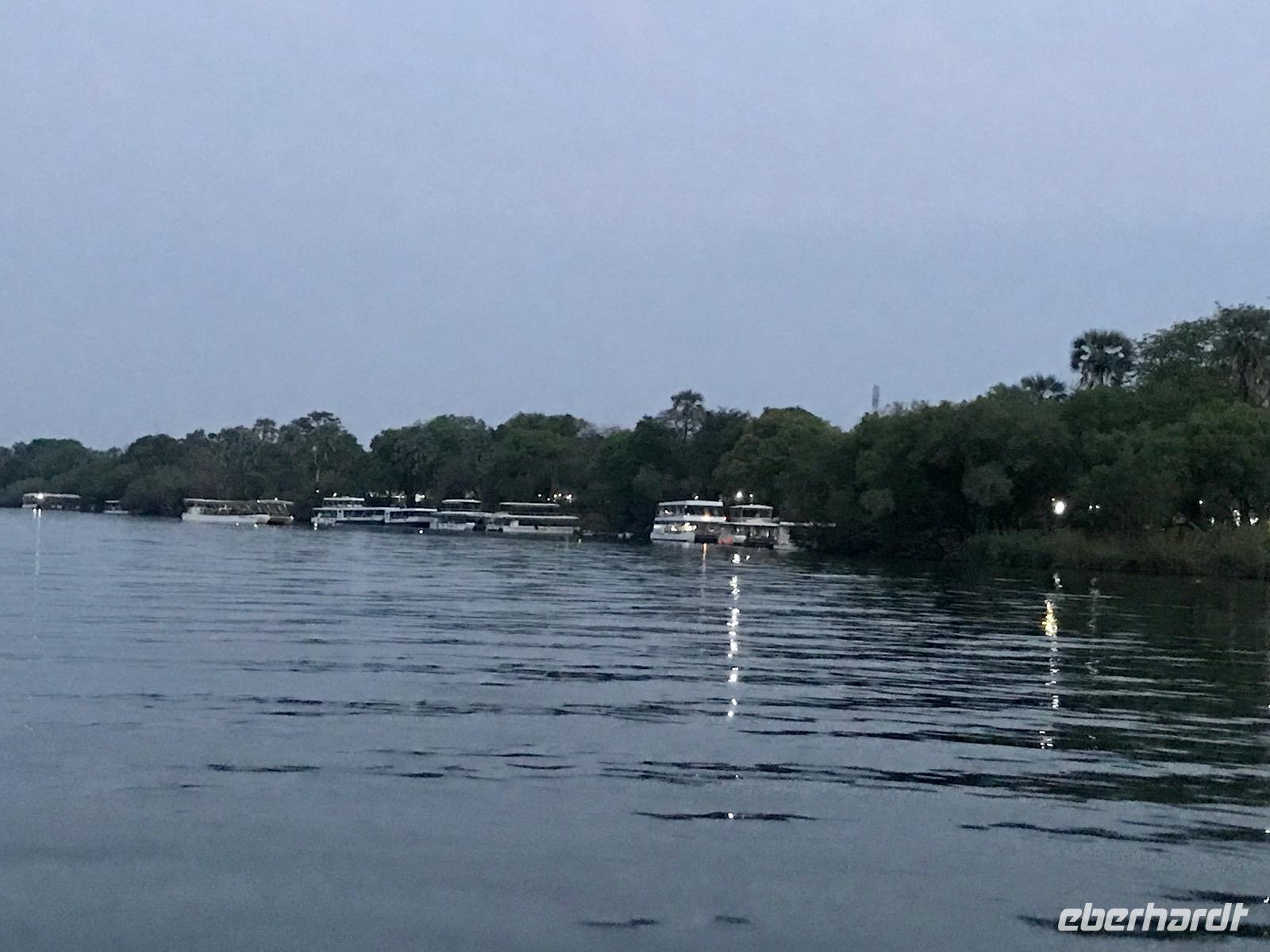 Am späten Nachmittag haben wir dann eine Sonnenuntergangsfahrt mit dem Boot auf dem oberen, breiten Sambesi, bevor er sich in die Schlucht stürzt. Es ist für alle Gäste ein unvergesslich schöner Abend als Abschluss unserer Reise. Der gewältige Sambesi, viertgrößter Fluss Afrikas, die Tiere am Ufer bei Sonnenuntergang, die sich von der Hitze des Tages erfrischen, die Flusspferdfamilien im Wasser, die auf Sandbänken ruhen und selbst nicht schwimmen können, aber im Wasser bleiben müssen, damit die Haut nicht verbrennt, Krokodile, die uns nur ihre Nasen zeigen und doch da sind, glückliche Menschen an Bord, die Afrika gesucht und gefunden haben, freundliche Afrikaner, die uns die Facetten ihrer Heimat und ihre Gastfreundschaft nahebringen und dann die untergehende Sonne am Horizont, schnell und endgültig. Wir danken für den schönen Abend.
