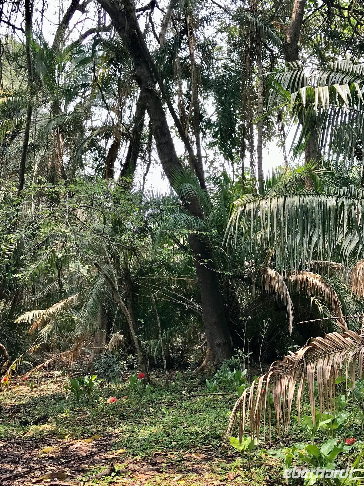 Nicht sehr weit vom Dorf befindet sich die MANTENGA LODGE, unser zuhause für eine Nacht. Wir befinden uns inmitten eines sehr diversen Waldes mit blühenden Bäumen und Sträuchern, in direkter Nachbarschaft zu den Grünen Meerkatzen und haben einen weiten Blick hinüber zu den Bergen und in den Regenwald. Das Abendessen dann draußen unter der Pergola, mit der Natur im Einklang.