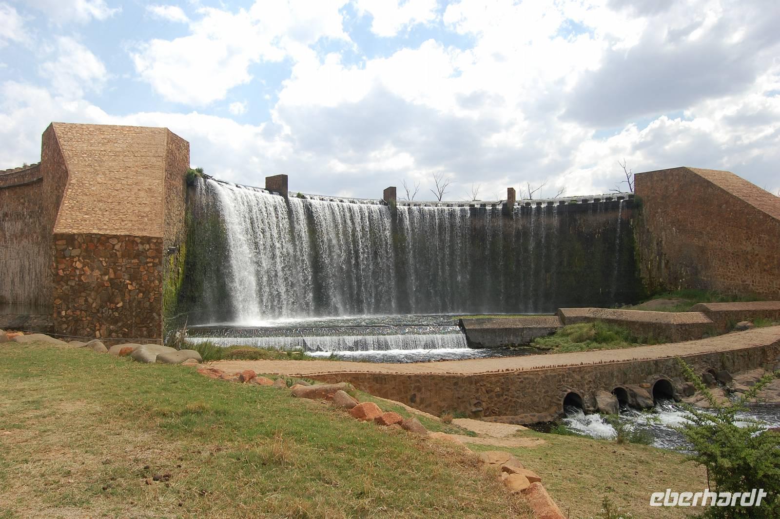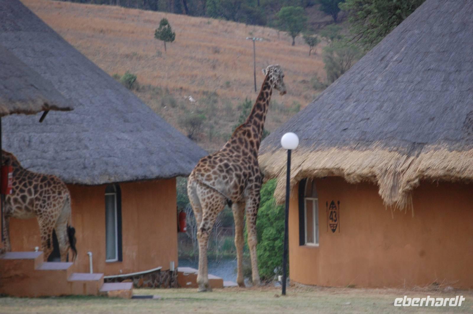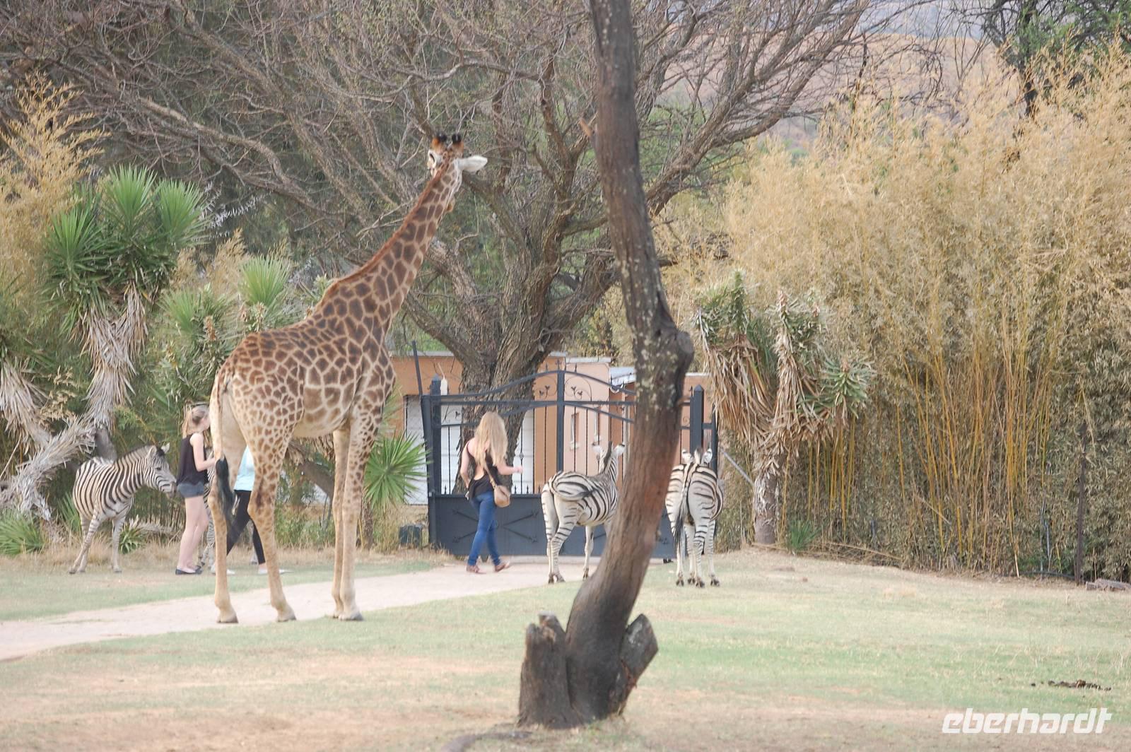 Im Flughafen Johannesburg passieren wir die Passkontrolle, nehmen unsere Koffer entgegen, tauschen etwas Bargeld und finden am Ausgang unseren Fahrer, der uns mit einem klimatisierten Minibus in Richtung Norden zu unserem Hotel bringt. Während der zweistündigen Fahrt müssen wir auf Umgehungsstraßen ausweichen, da der Freeway überfüllt ist. Vorbei an der Downtown von Johannesburg und vorbei an Soweto, kommen wir in der Heia Safari Ranch an, wo schon ein Esel an der Rezeption wartet. Tatsächlich laufen auch Zebras, Gnus, Giraffen und verschiedene Antilopen zwischen den typisch afrikanischen Rundhütten der Hotelanlage frei herum. Nach einer Einweisung und einem Begrüßungsdrink beziehen wir unsere Zimmer und haben am Nachmittag etwas Freizeit.