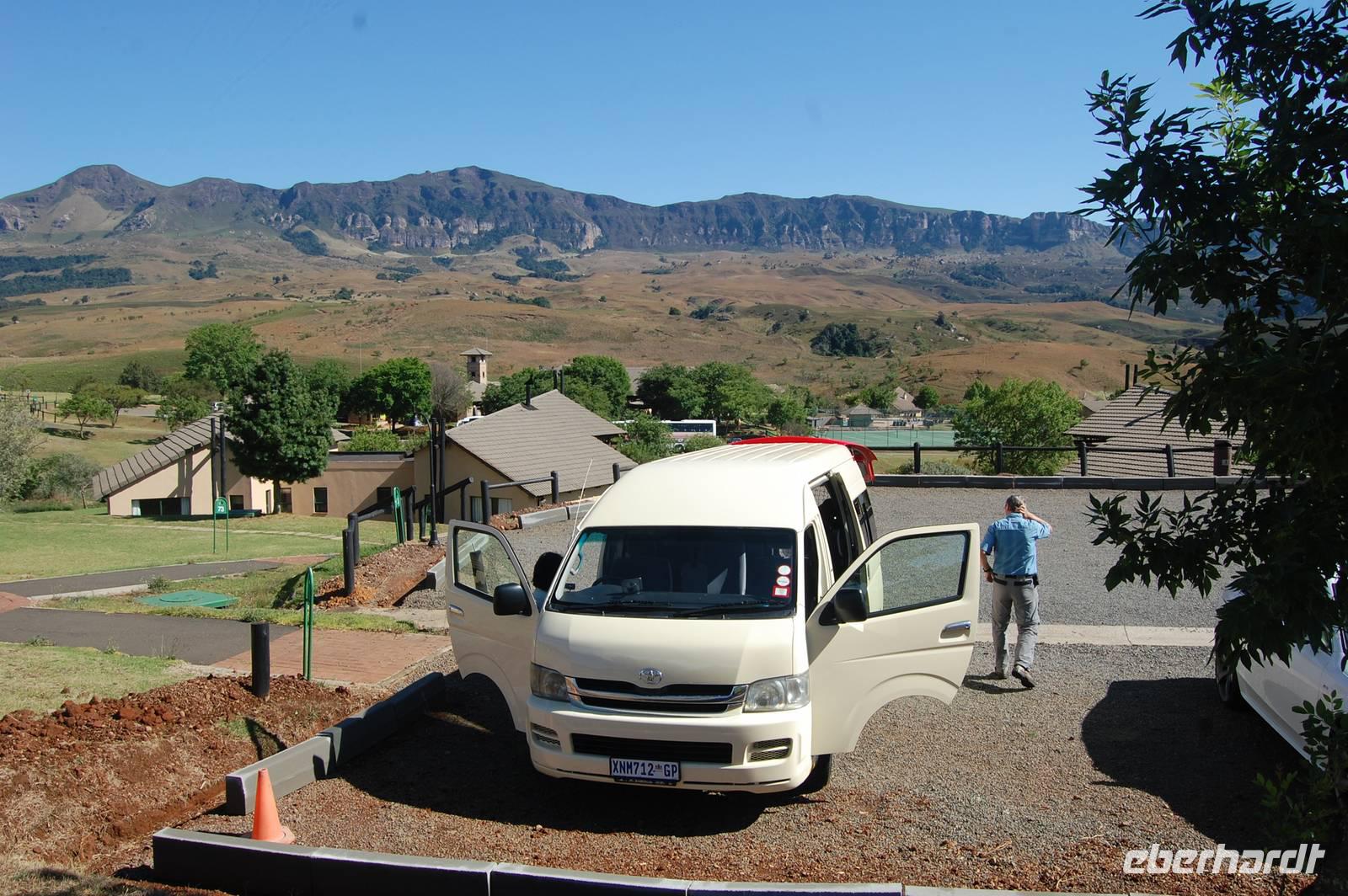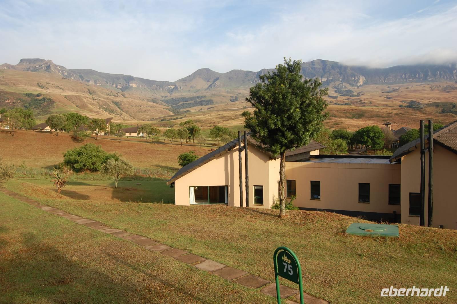 Bereits um 06.30 Uhr verabreden wir uns zum gemeinsamen Frühstück, wo wir auch unsere Reiseleiterin für die nächsten Tage kennenlernen werden. Michaela spricht perfekt deutsch, denn sie ist erst vor drei Jahren nach Südafrika ausgewandert. Beim Kaffee erläutert sie uns kurz den Ablauf des heutigen Tages. Da uns ein recht weiter Weg auf teilweise schlechten Straßen bevor steht, verlassen wir um 07:30 Uhr die amüsante Heia Safari Ranch und nehmen eine nord-östliche Umgehung von Johannesburg. Unser Toyota-Kleinbus bringt uns unaufhaltsam in Richtung Süden und bald sind die gigantischen Drakensberge in Sicht. Mit zwei technischen Pausen erreichen wir gegen 13.00 Uhr unsere Unterkunft für die nächsten drei Nächte. Das „Alpine Heath Resort" liegt sehr weit abseits von allen Verkehrswegen in einem grünen Tal der nördlichen Drakensberge. Nach unserer Ankunft bekommen wir zum Lunch Toast mit Pommes und wir beziehen die hübschen Chalets. Jeweils zwei Personen nutzen ein Ferienhaus mit drei Schlafzimmern, zwei Bädern mit WC und Wohnbereich mit Kamin und offener, komplett eingerichteter Küche. Die Chalets sind in Siedlungen mit max. 10 Häusern im weitläufigen Gelände nett angelegt. Die gesamte Anlage beherbergt einen Minimarkt, Restaurant und bietet viele Outdoor-Aktivitäten.