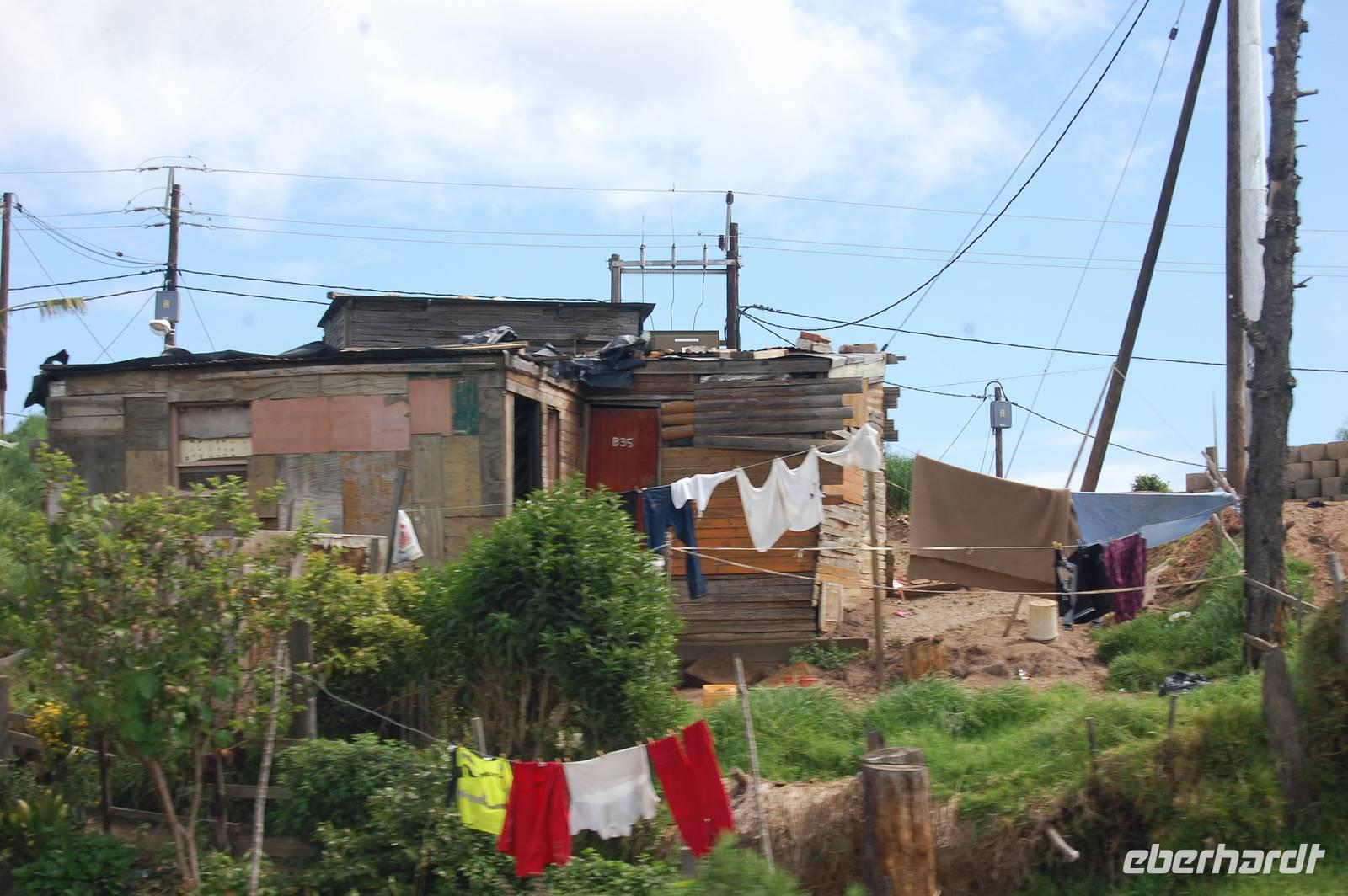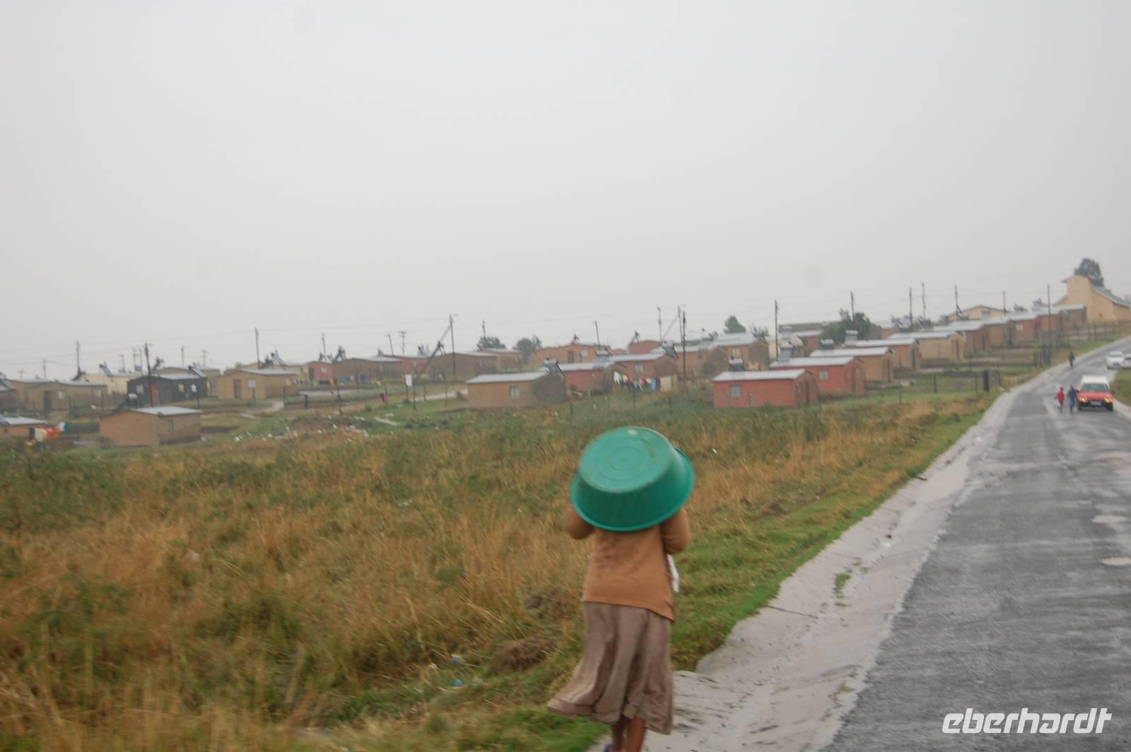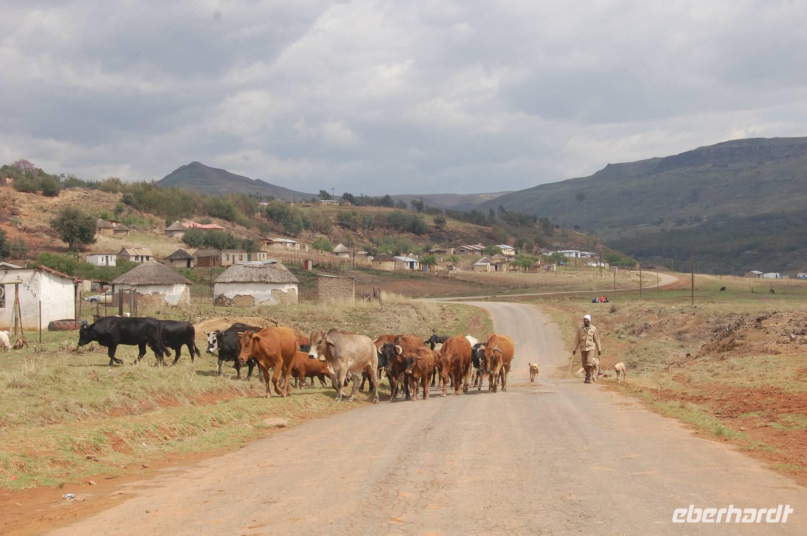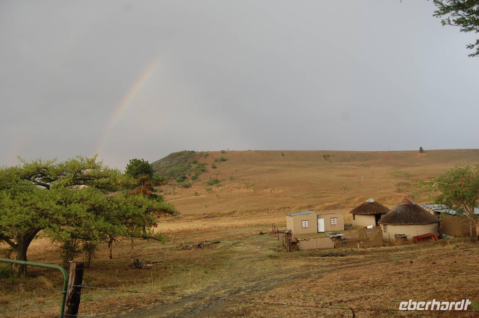 Auch ohne den bestellten Weckruf treffen wir uns pünktlich um 06.15 Uhr zum Frühstück im Restaurant. Unser Tisch ist liebevoll vorbereitet. Jeder hat ein Holzbrettchen mit etwas Käse, Wurst und frischem, aufgeschnittenen Obst vor sich, dazu ein Glas mit Müsli und Joghurt. Der Kaffee wird gereicht und man kann aus der Karte ein Eiergericht auswählen. Nach dem üppigen Frühstück starten wir in Richtung Durban und umfahren die Drakensberge östlich, um ins Wandergebiet „Giant´s Castle" zu gelangen. Unterwegs stoppen wir in einem Bergdorf und sofort ist unser Kleinbus von netten Kindern umringt, die nach etwas Süßem betteln. Wir verteilen die Süßigkeiten, das Knabberzeug und die viel zu süßen Getränkedosen unserer Lunchpakete, die wir in unserer Ferienanlage als Wegzehrung erhalten hatten.