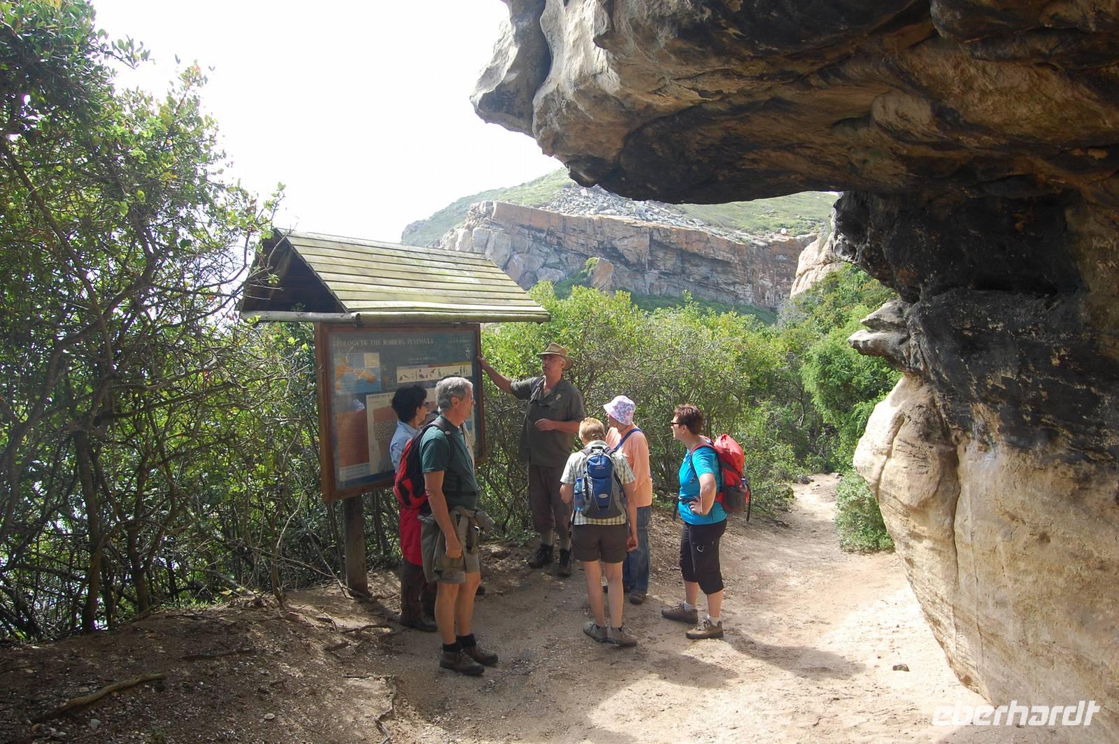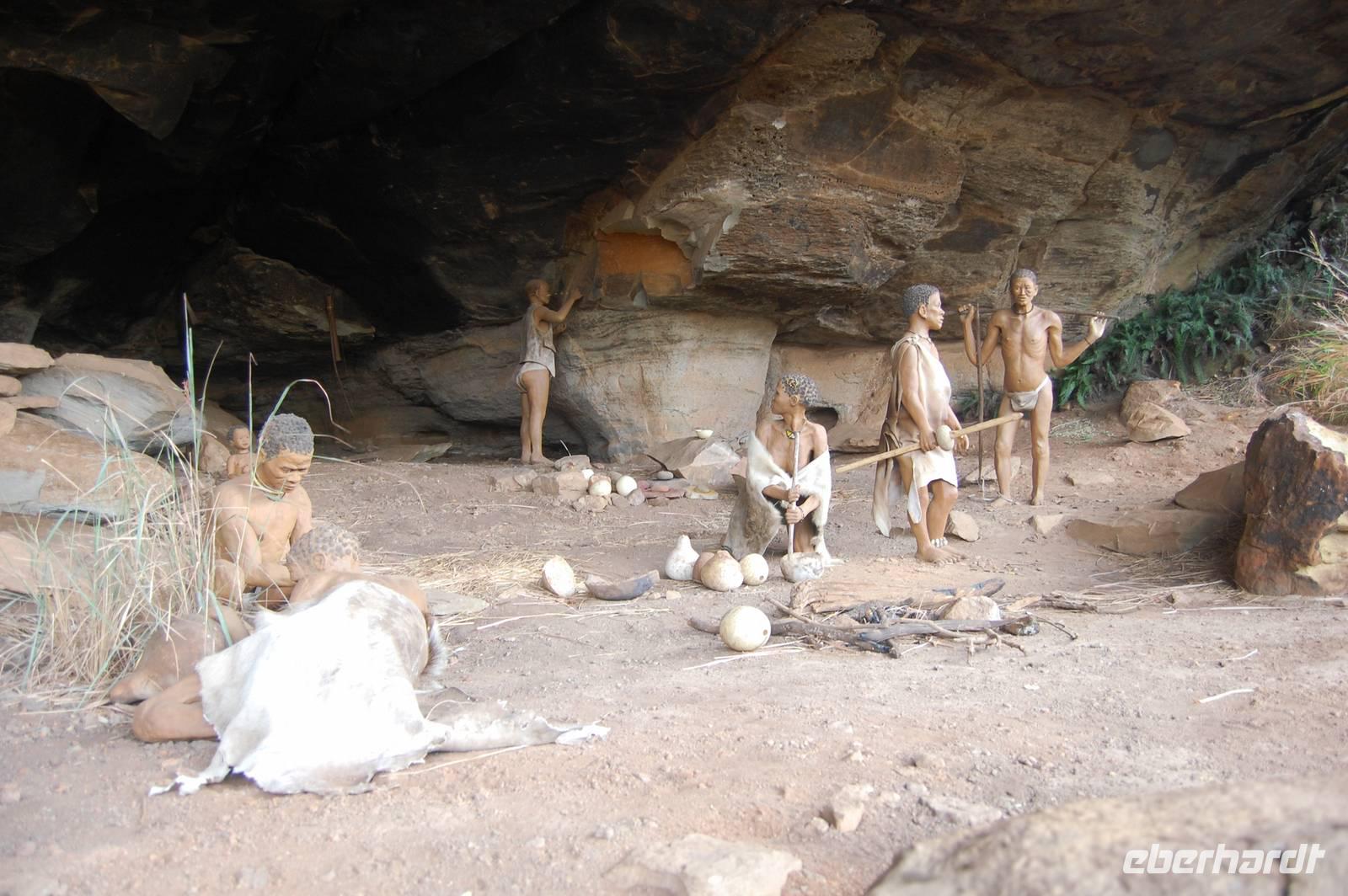 Um 10:30 Uhr treffen wir am Eingang des Nationalparkes "Gaint´s Castle" unseren heutigen Wanderguide Selby, der uns eine Wanderung zu den „Main Caves" (Haupthöhlen) empfiehlt. Die Wanderung führt uns ca. 2 km bergab und bergauf. Das riesige Felsmassiv vor uns wirkt wie eine große Festungsmauer, wo auch der Name „Giant´s Castle" herrührt. Hinter diesem Bergmassiv erstreckt sich bereits das, von Südafrika umschlossene, Territorium von Lesotho. Über gut befestigte Wanderwege erreichen wir nach 90 Minuten die Haupthöhlen, eine große Sandstein-Boofe. Detailgetreu wird eine Sippe der San dargestellt, die vor 3000 Jahren als Normaden durch dieses Tal zogen. Im Schutz der Höhlen wohnten die nur 1,50 m großen Buschmenschen und hinterließen jede Menge farbige Felsenzeichnungen an den Sandsteinwänden. Unser Wanderguide Selby empfiehlt uns auf dem Rückweg einen Picknickplatz am Bushman´s River, den wir für unser Mittagsbrot aus den Lunchpaketen gern in Anspruch nehmen. Leider beginnt ein leichter Regen, so dass wir uns nur für eine kleine Schleife zurück zum Camp entscheiden.