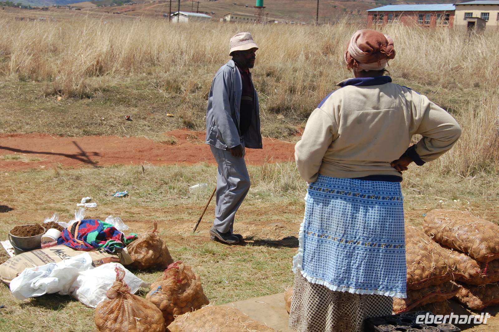 Heute bringt uns Michaela mit dem Kleinbus in die Cathedral Peak-Region der Drakensberge. Auf der 2-stündigen Fahrt stoppen wir in einem kleinen Bergdorf, um spontan eine Schule zu besuchen. Nachdem Michaela am Eingang der High School fragt, stellt uns der Direktor einen englisch sprechenden Lehrer zur Seite, der uns durch einige Klassen führt. Die ausschließlich dunkelhäutigen 8- bis 12-Klässler begrüßen uns im Chor und werden anschließend nach Ihrem Wissen über Deutschland befragt. Nur die Automarken Mercedes und BMW wurden genannt und sind offenbar das einzige wissenswerte Detail über Deutschland. Unser kurzer Rundgang endet in der ärmlichen, kargen "Schulküche", wo eine Köchin aus Kohlköpfen und Maismehl am offenen Feuer das heutige Gericht zubreitet.