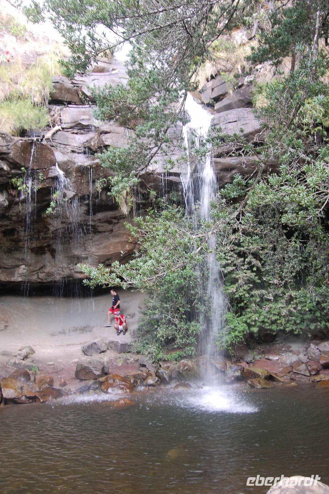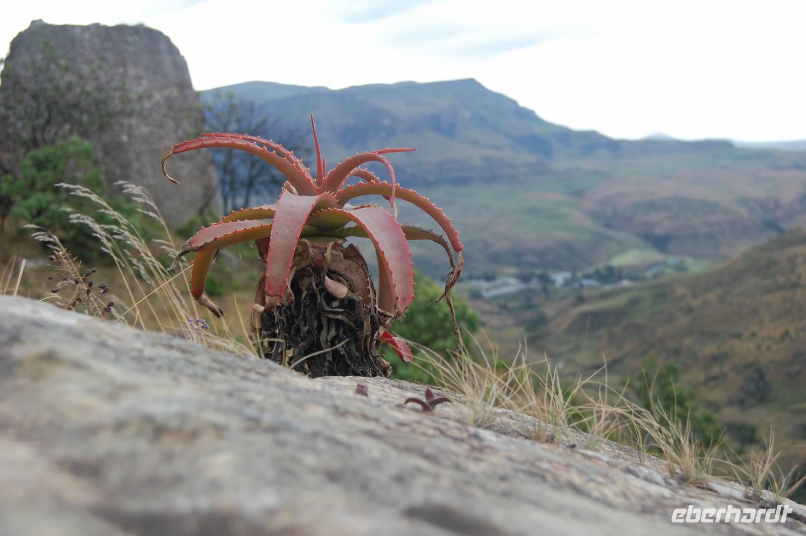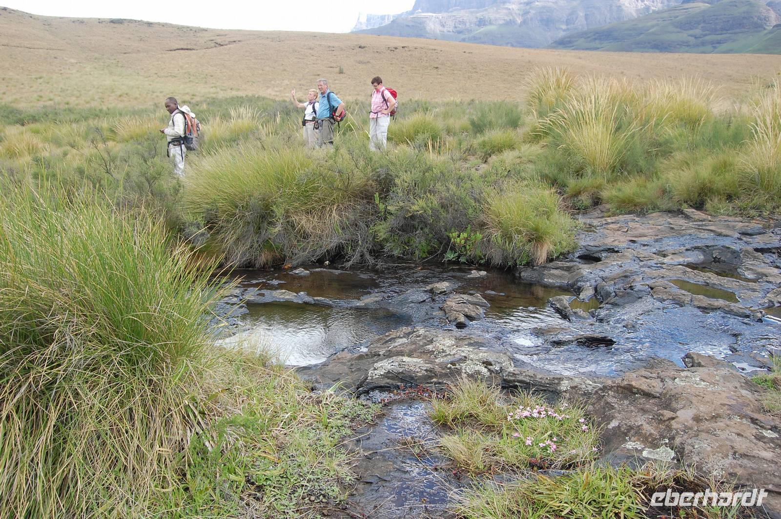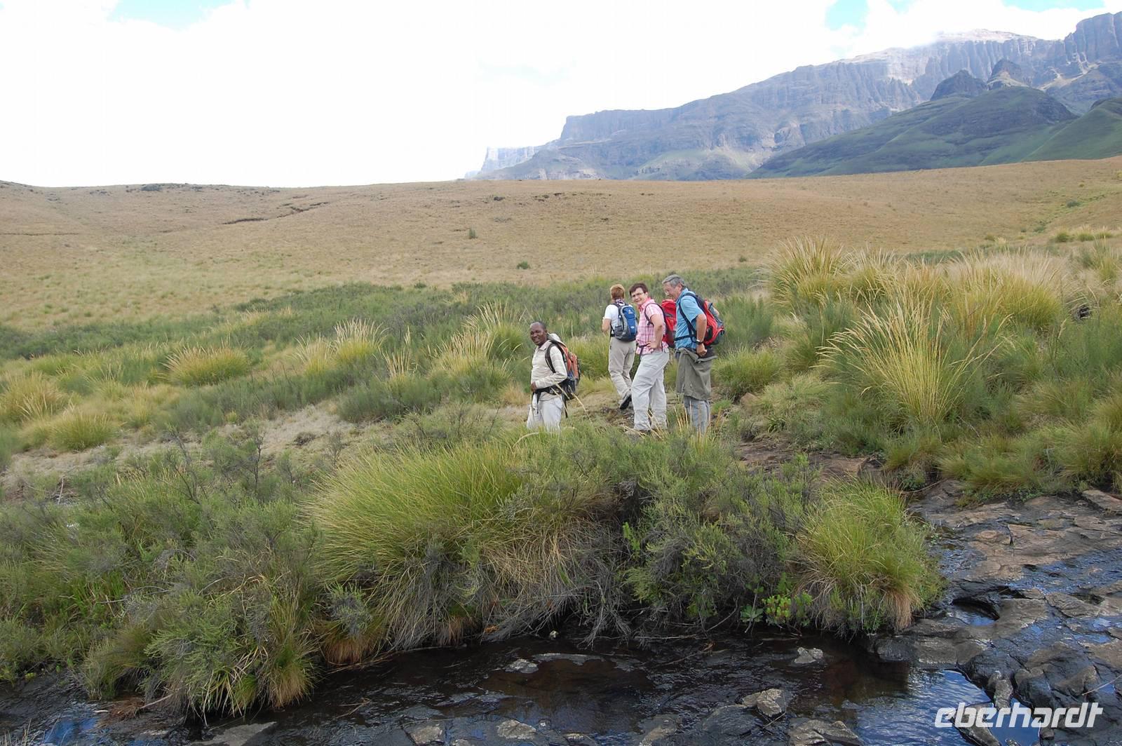 Nach kurzer Weiterfahrt erreichen wir um 11:15 Uhr das Cathedral Peak Resort und begrüßen unseren heutigen Wanderführer Apsolom. Er möchte mit uns zum „Mushroom Rock". Auf dem knapp 2 km langen Anstieg bewältigen wir 300 Höhenmeter. Erschöpft aber glücklich erreichen wir alle unser Ziel in 1.700 m Höhe und werden mit einem herrlichen Rundblick belohnt. Auf unserem Weg haben wir neben prächtigen Proteen, hübschen Schmucklilien und verschiedenen Gladiolen eine artenreiche Flora genießen können. Am Mushroom Rock angekommen, legten wir unsere Picknickpause ein und verzehrten unseren heutigen Proviant aus den Lunchpaketen. Da unser Wanderguide den für 16 Uhr angekündigten Regen befürchtet, teilen wir die Gruppe. Um 13:00 Uhr geht Michaela mit mit den Genußwanderern direkt zurück zum Cathedral Peak Hotel. Die anderen Wanderfreunde entschließen sich, schnelleren Schrittes die große Runde abzuwandern. Eine Entscheidung, die angesichts des herrlichen Sonnenscheins richtig war. Über eine Hochebene wandern wir auf Trampelpfaden und steigen schließlich Stück für Stück wieder ab. Unser Guide führt uns zu einem kleinen Wasserfall, die "Doreen-Falls". Um 15.45 Uhr, nach 4 Stunden erreichen wir wieder den Ausgangspunkt unserer Wanderung.