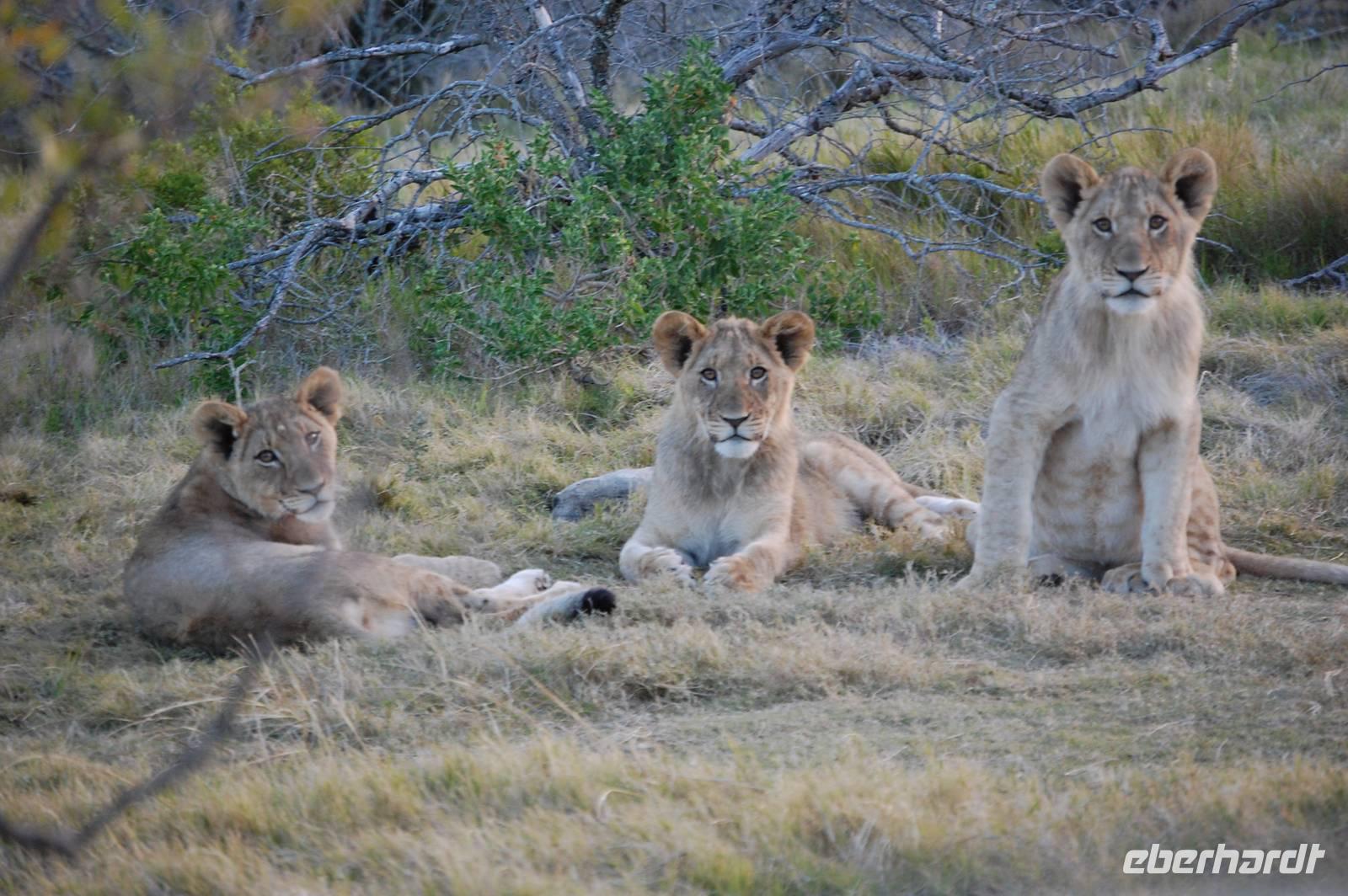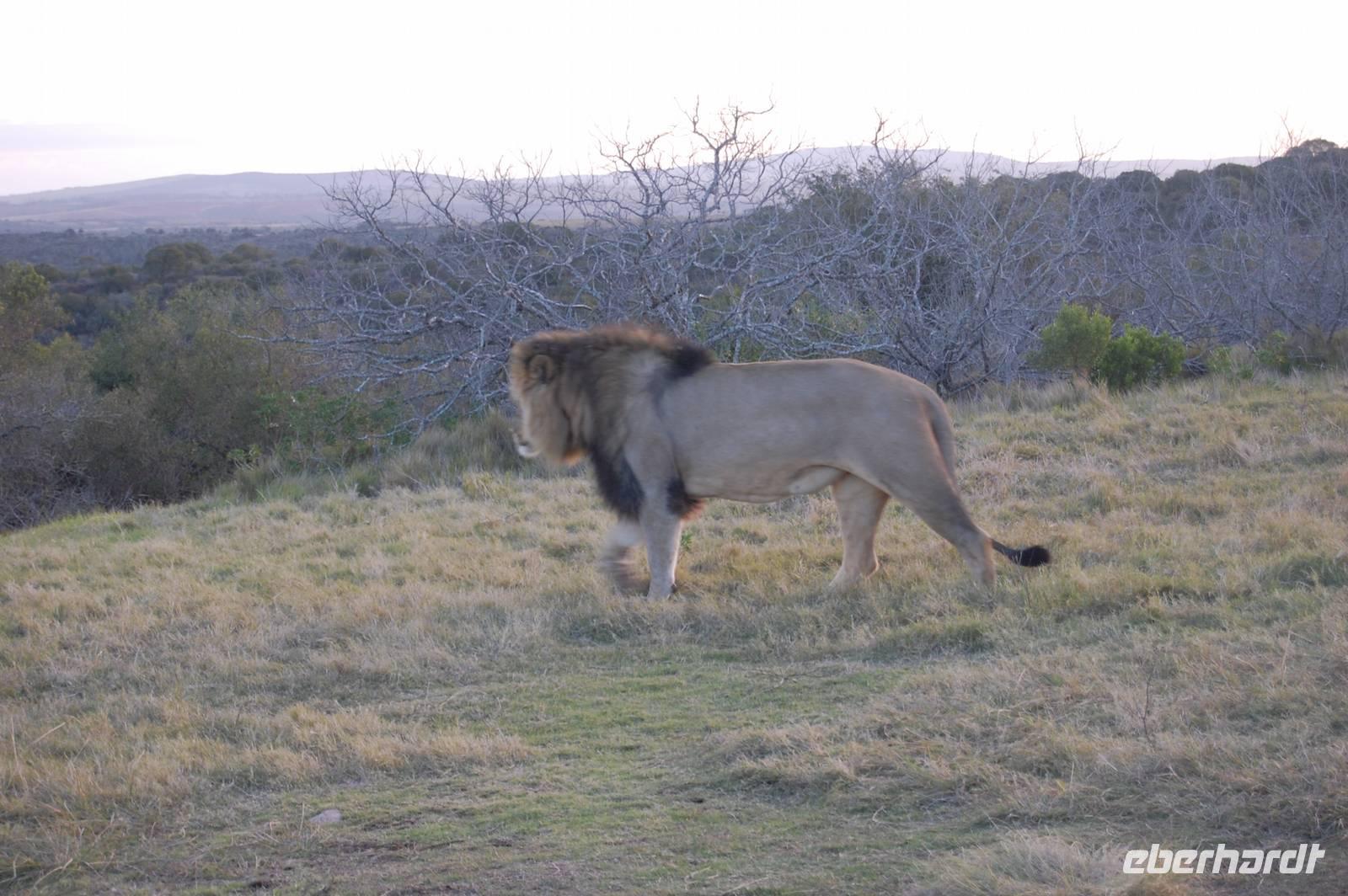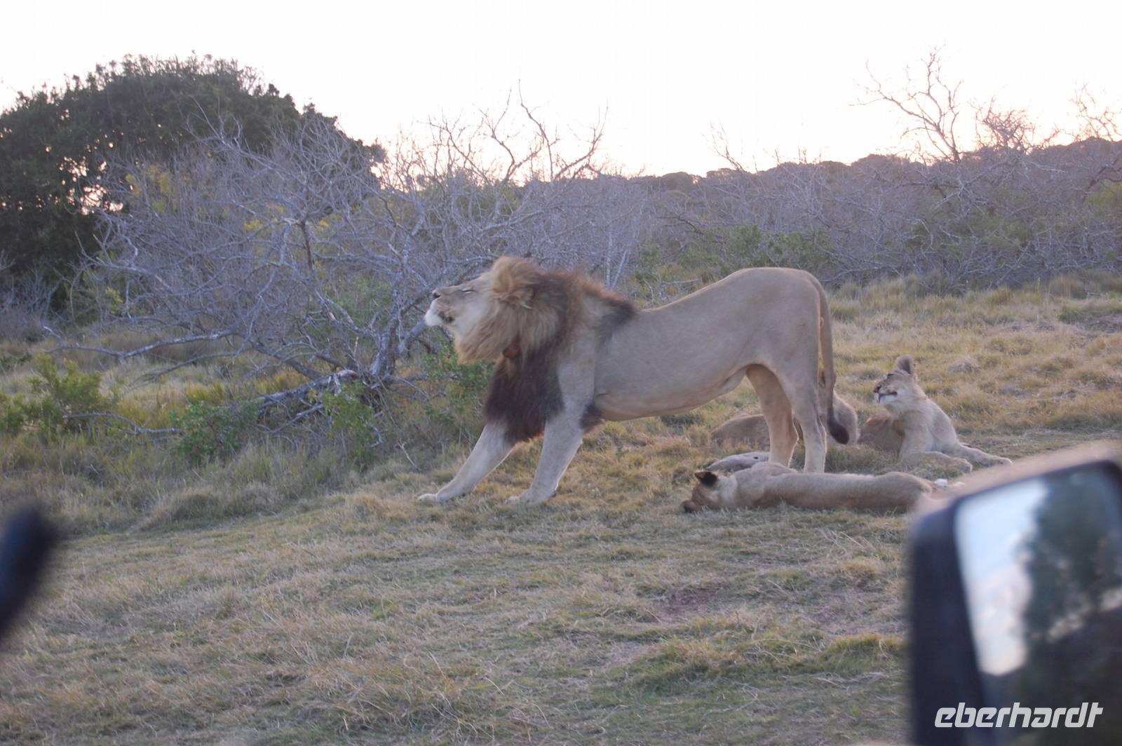 Mit einer kleinen Maschine fliegen wir in Richtung Port Elizabeth, wo wir wie geplant um 15:00 Uhr landen. Unser Transfer-Fahrer erwartet uns bereits, so dass wir umgehend in Richtung Kariega Game Resort aufbrechen. Pünktlich um 17 Uhr treffen sind wir am Ziel und werden an der Rezeption mit einem Welcome-Drink von Alicia begrüßt. Sie stellt sich uns vor und wir freuen uns, dass wir mit Ihr als Rangerin die täglichen Jeep-Safaris unternehmen werden. Mit ihrem mächtigen Toyota-Jeep bringt sie uns umgehend zu unseren Chalets. Wir verabreden uns auf 17:30 Uhr und machen eine erste kleine Safari, um die Löwen zu suchen. Tatsächlich finden wir die Löwenfamilie auf einer Anhöhe, in der Abendsonne liegend. Den schlafenden männlichen Löwen necken drei posierliche Jungkatzen, die ganze Löwenfamilie wird komplettiert von zwei Löwinnen, die aufmerksam in die Runde schauen, fast als wollten sie gemeinsam ein Beutetier jagen.