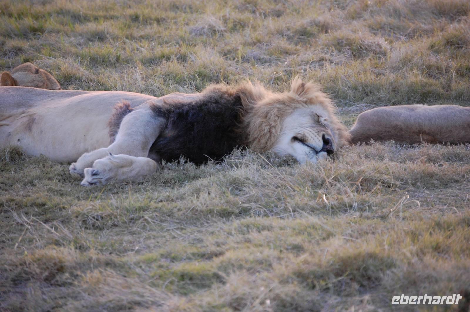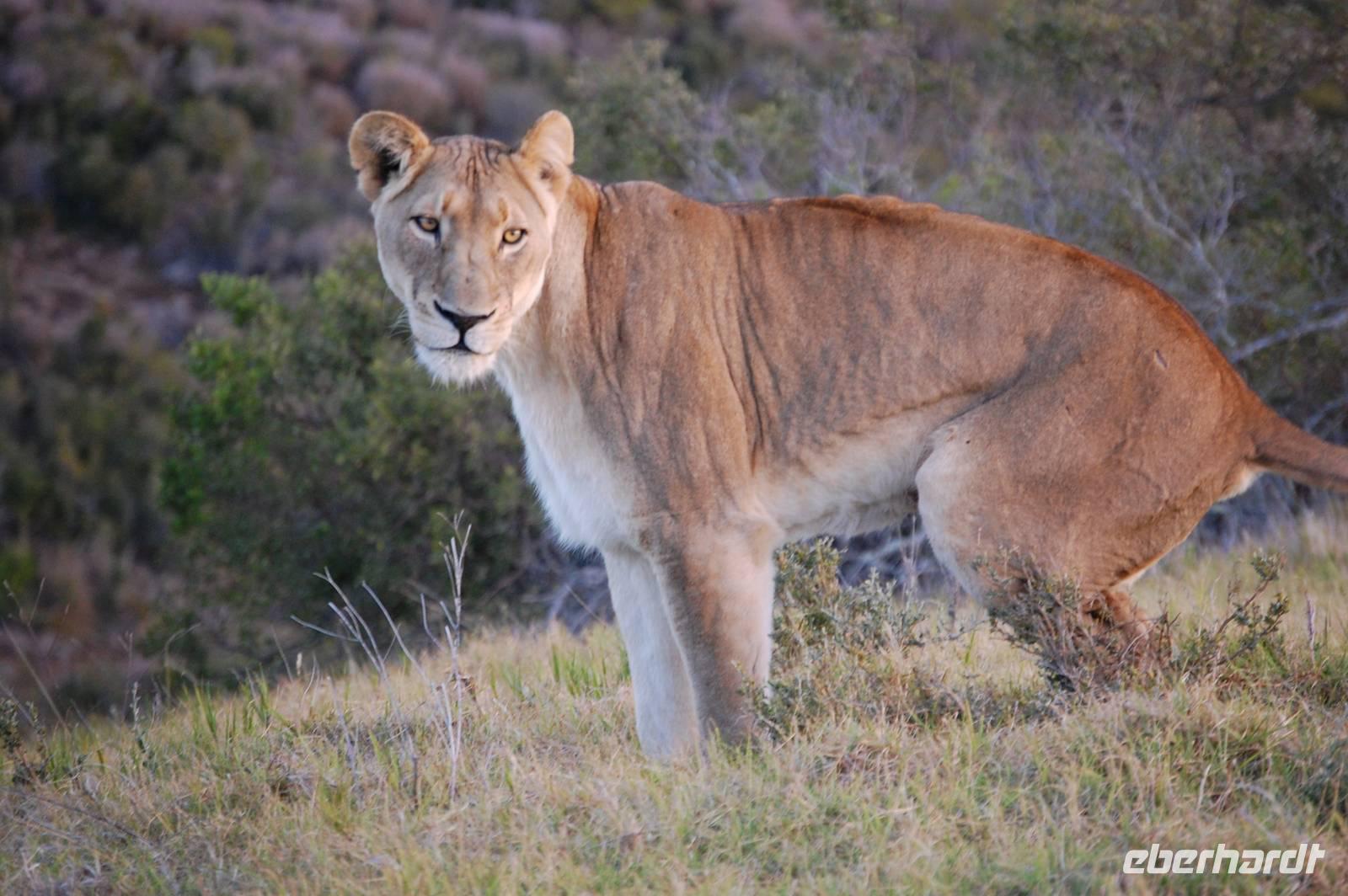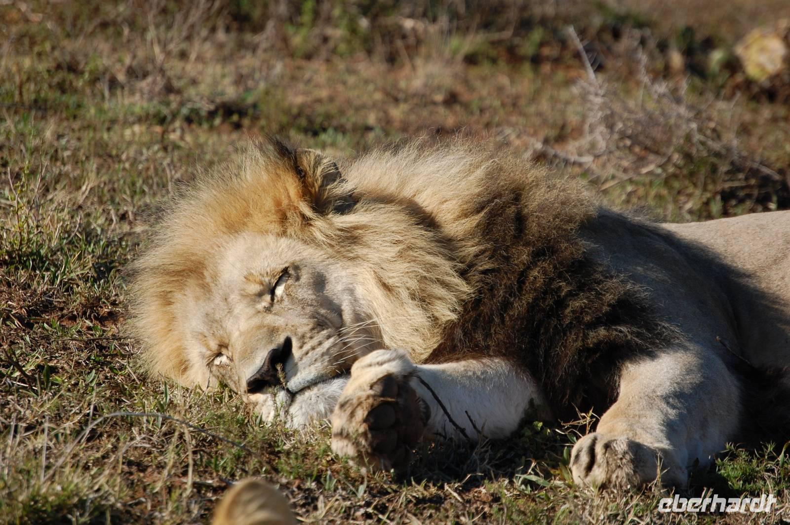 Mit einer kleinen Maschine fliegen wir in Richtung Port Elizabeth, wo wir wie geplant um 15:00 Uhr landen. Unser Transfer-Fahrer erwartet uns bereits, so dass wir umgehend in Richtung Kariega Game Resort aufbrechen. Pünktlich um 17 Uhr treffen sind wir am Ziel und werden an der Rezeption mit einem Welcome-Drink von Alicia begrüßt. Sie stellt sich uns vor und wir freuen uns, dass wir mit Ihr als Rangerin die täglichen Jeep-Safaris unternehmen werden. Mit ihrem mächtigen Toyota-Jeep bringt sie uns umgehend zu unseren Chalets. Wir verabreden uns auf 17:30 Uhr und machen eine erste kleine Safari, um die Löwen zu suchen. Tatsächlich finden wir die Löwenfamilie auf einer Anhöhe, in der Abendsonne liegend. Den schlafenden männlichen Löwen necken drei posierliche Jungkatzen, die ganze Löwenfamilie wird komplettiert von zwei Löwinnen, die aufmerksam in die Runde schauen, fast als wollten sie gemeinsam ein Beutetier jagen.