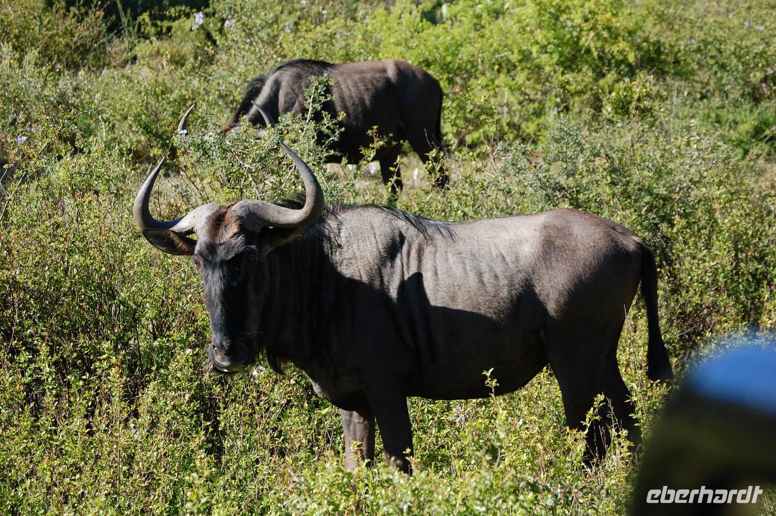 Kurz nach Sonnenaufgang starten wir zu unserer heutigen Morgensafari. Auf den Wiesen liegt der Morgentau, es steigen kleine Nebelschwaden auf. Die Sonne ist noch jung an diesem Morgen und kommt nur schwach gegen die Kühle der Nacht an. Das machen sich die vielen Tiere zu Nutze und kommen in Herden aus der Sicherheit der Buschlandschaften, um im saftigen Gras der Freiflächen zu äsen. Wir sehen Gnus, Zebras, viele verschiedene Antilopen, Strauße, Giraffen, ein Warzenschwein und einen einzelnen Elefantenbullen, der sich schüchtern in die Dornenhecken zurückzieht, als er uns entdeckt.