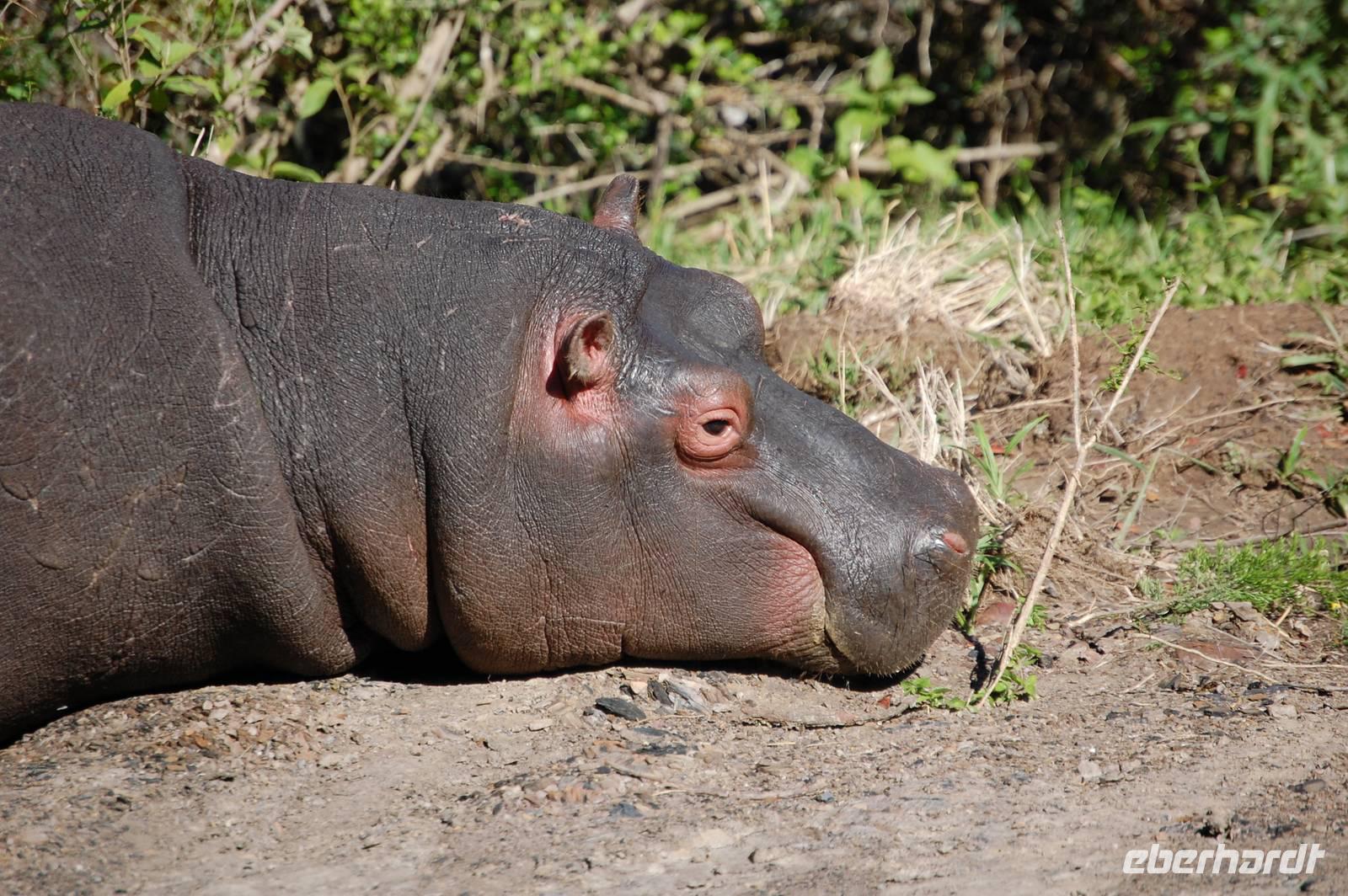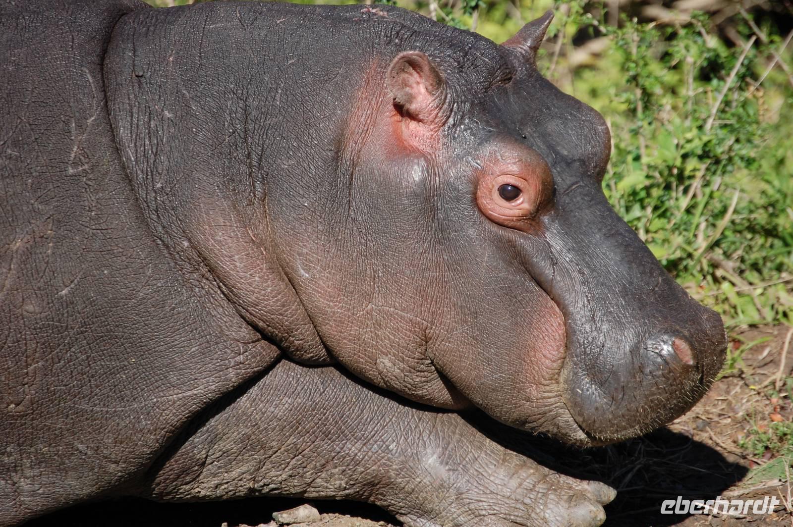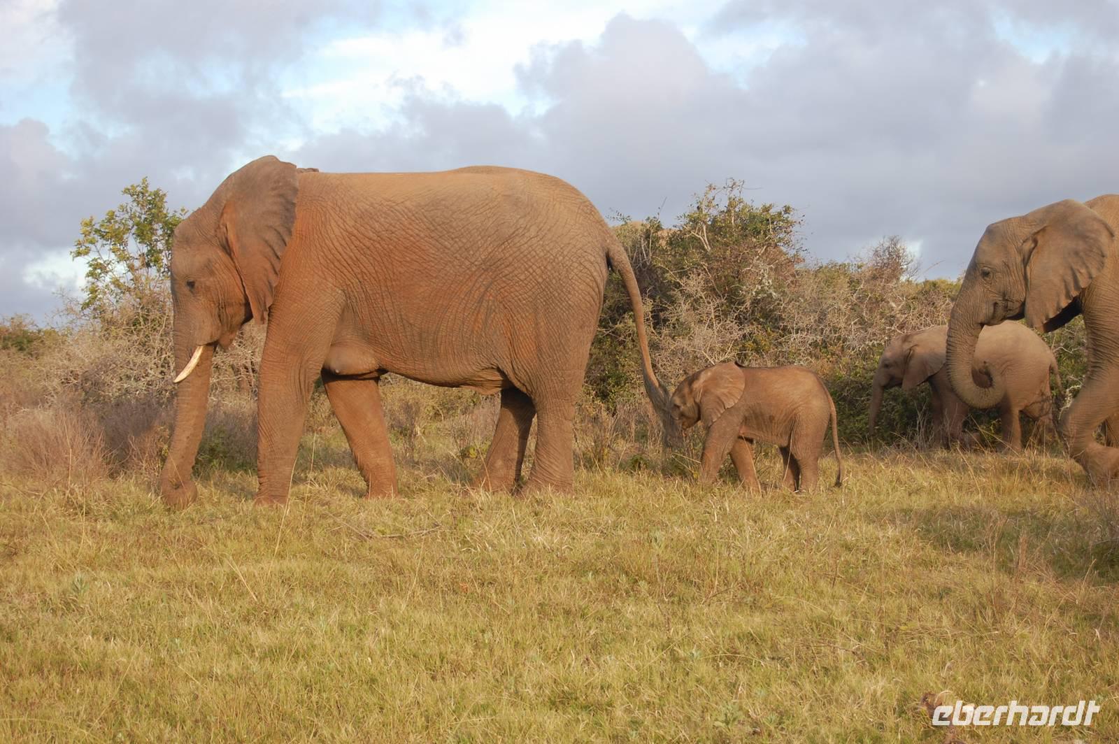 An einem sicheren, sonnigen Platz verlassen wir den Jeep um eine kleine Kaffeepause einzulegen. Dazu hatte Alicia Kaffee und Muffins in ihren Picknickkorb gepackt. Nach dieser gelungenen Überraschung wechseln wir unsere Position, um wenig später an einem Flußufer zu stoppen. Dort treffen wir das 4 Monate alte Hippo-Baby beim Grasfressen an Land. Eigentlich gehen Flußpferde nur nachts zum Fressen ans Ufer und liegen tagsüber schlafend-faul im Wasser, so wie es auch die Flußpferd-Mama an diesem Morgen tut. Großes Glück für uns, das das Flußpferd-Baby so ungehorsam ist, denn es posiert fressend und später schlummernd vor unserem Jeep. Nach einer ganzen Weile verlassen wir die Wasserstelle. Auf unserem Weg verfolgen wir einen Rhino-Bullen und sehen eine brütende Straußendame, die Ihren langen Hals nach uns reckt. Später treffen wir auch eine komplette Straußenfamilie mit 10 Kücken. Nach 2,5 Stunden kehren wir zur Lodge zurück und bekommen um 10 Uhr ein kräftiges Frühstück gereicht. Bis zum Lunch um 14.30 Uhr ist genügend Zeit für eigene Aktivitäten am Pool oder im weitläufigen Gelände der Anlage. Nach dem gemeinsamen Mittagessen im Restaurant haben wir noch etwas Freizeit, bis wir uns um 16.00 Uhr zur Nachmittags-Safari treffen. Wir sehen noch einmal die Löwenfamilie, Elan-Antilopen und einen einzelnen Rhino-Bullen, der sehr nah an unser Auto kommt. Als Alicia das Breitmaulnashorn anspricht, wird mir etwas ängstlich. Als der mächtige Bulle langsam und friedlich von der freien Fläche ins Dickicht trottet, kommen die Elefanten aus einer Talsenke auf diese Wiese. Es sind über 10 Elefantendamen mit deren Nachwuchs. Besonders posierlich sind die beiden 2 Wochen alten Babys. Wir bleiben sehr lang bei den Elefanten, die friedlich fressen und ganz langsam weiterziehen. Da immer mehr Jeeps zur Elefantenherde kommen, verlassen wir unsere Stellung und stoppen an einer übersichtlichen Stelle des Parkes. Bei untergehender Sonne gibt es Rotwein und Bier und jede Menge Fotomotive. Anschließend werden wir zurück zu unseren Chalets gebracht. Um 19.30 verabreden wir uns zum gemeinsamen Abendessen, diesmal als südafrikanisches BBQ „Boma" unter freiem Himmel. Um ein Lagerfeuer stehen die eingedeckten, rustikalen Sitzgruppen, am Grill sind südafrikanische Speisen aufgetafelt. Alles ist sehr schmackhaft und gut organisiert. Unser Guide für die kommenden Tage, Carsten, stellt sich kurz bei uns vor und spricht den nächsten Tag gleich mit uns ab. Als das gesamte schwarze Küchenpersonal und die Servicekräfte zu einem Gesang anstimmen und dazu tanzen, fühlt man sich wirklich gut betreut. Auf dem Heimweg zu unseren Chalets sehen wir einen prächtigen, südlichen Sternhimmel.