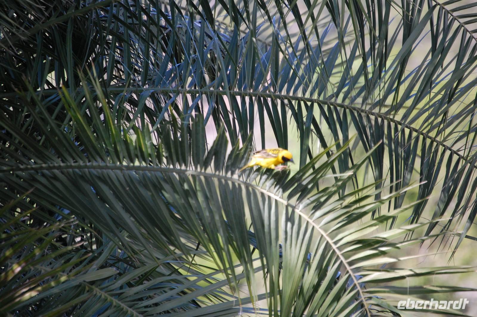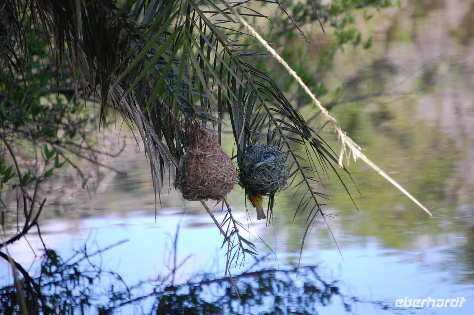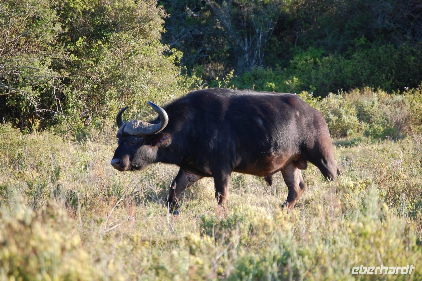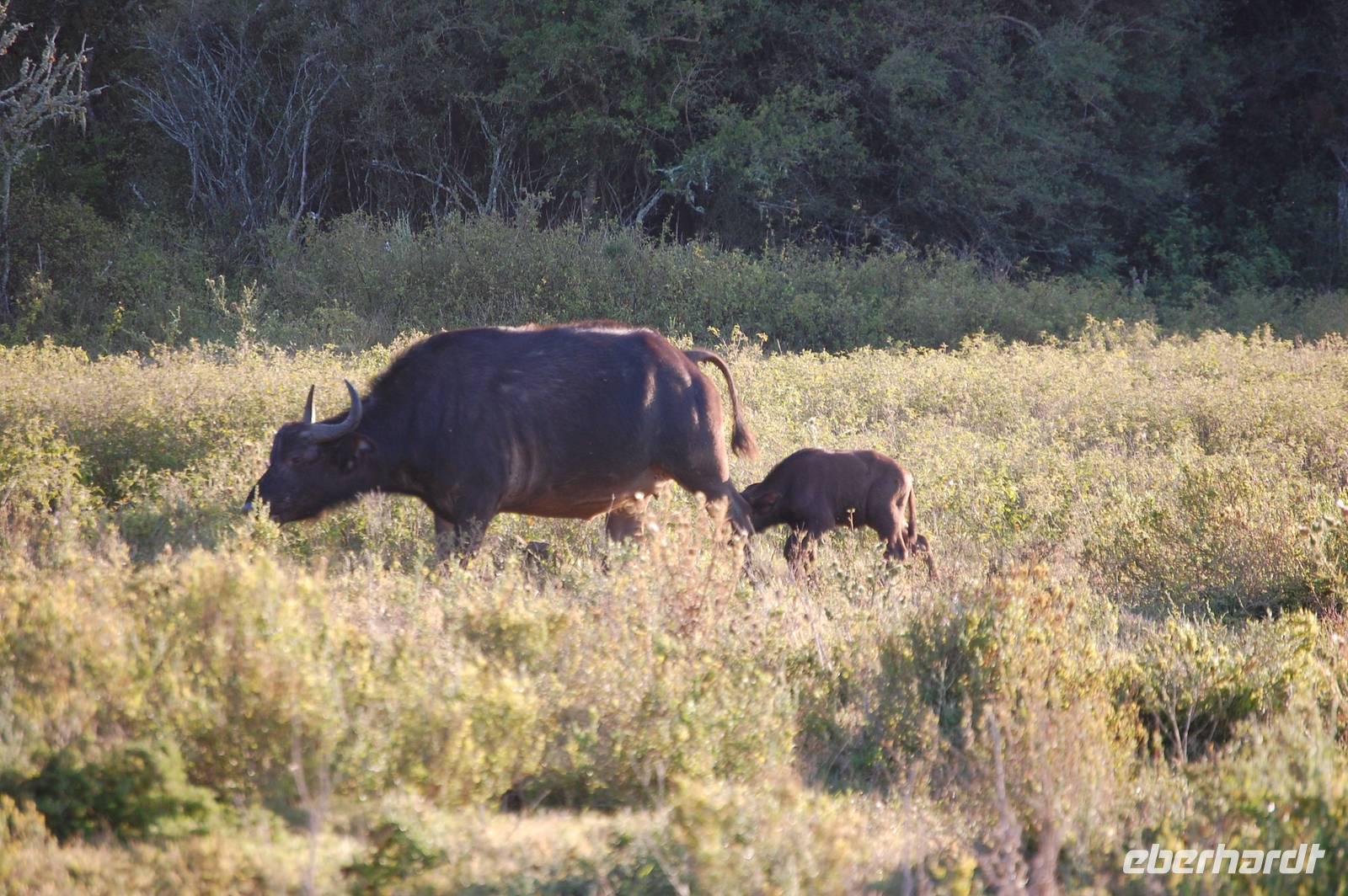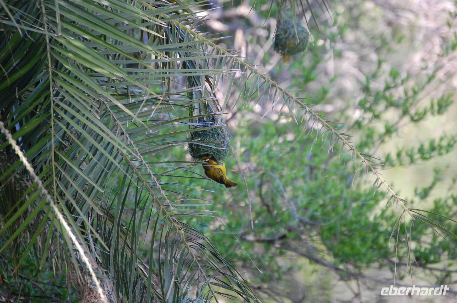 Um 06.00 Uhr holt uns unsere Rangerin Alicia mit ihrem Toyota LandCruiser-Jeep ab. Wir fahren eine kleine Weile und werden endlich fündig. In einer Talsenke treffen wir auf eine Herde weidender Büffel. Außerdem beobachten wir bei einer erneuten kleinen Kaffeepause eine Wasserbock-Familie. Nach der Weiterfahrt beobachten wir an einer Wasserdurchfahrt, wie einige männliche Webervögel emsig ihr Nest an den Wedeln einer Dattelpalme befestigen und ausbauen, denn sie müssen ihr Bauwerk vom Weibchen begutachten lassen. Bei Nichtgefallen wird es durch die Dame zerstört und sie flattert zum nächsten Bauherren. Dieses lustige Spiel konnten wir eine ganze Weile beobachten und es war sehr amüsant. Dennoch müssen wir aufbrechen, denn 8 Uhr ist für unsere Gruppe Frühstück geplant, um pünktlich 09.00 Uhr in Richtung Knysna aufzubrechen. Für den Weg bekommen wir Lunchpakete mit.