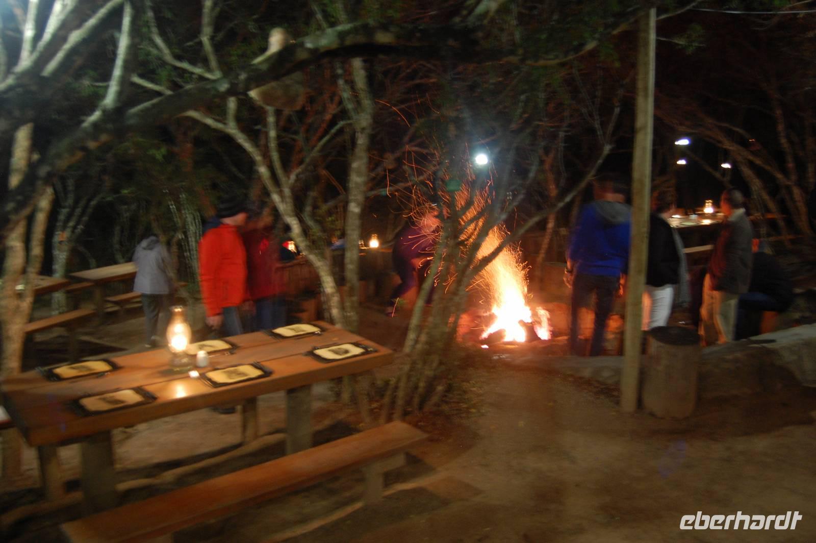 Nach unserer kurzen Wandertour fahren wir zum Besucher-Informationszentrum des Parks und decken uns mit Postkarten und Getränken ein. Da es dort auch Kaminholz und Amarula gibt, entschließe ich mich, unsere kleine Gruppe zum „Kaminabend" in mein Ferienhaus einzuladen. In Anbetracht der geschätzten 14 C° Außentemperatur halte ich das für eine gute Idee.
