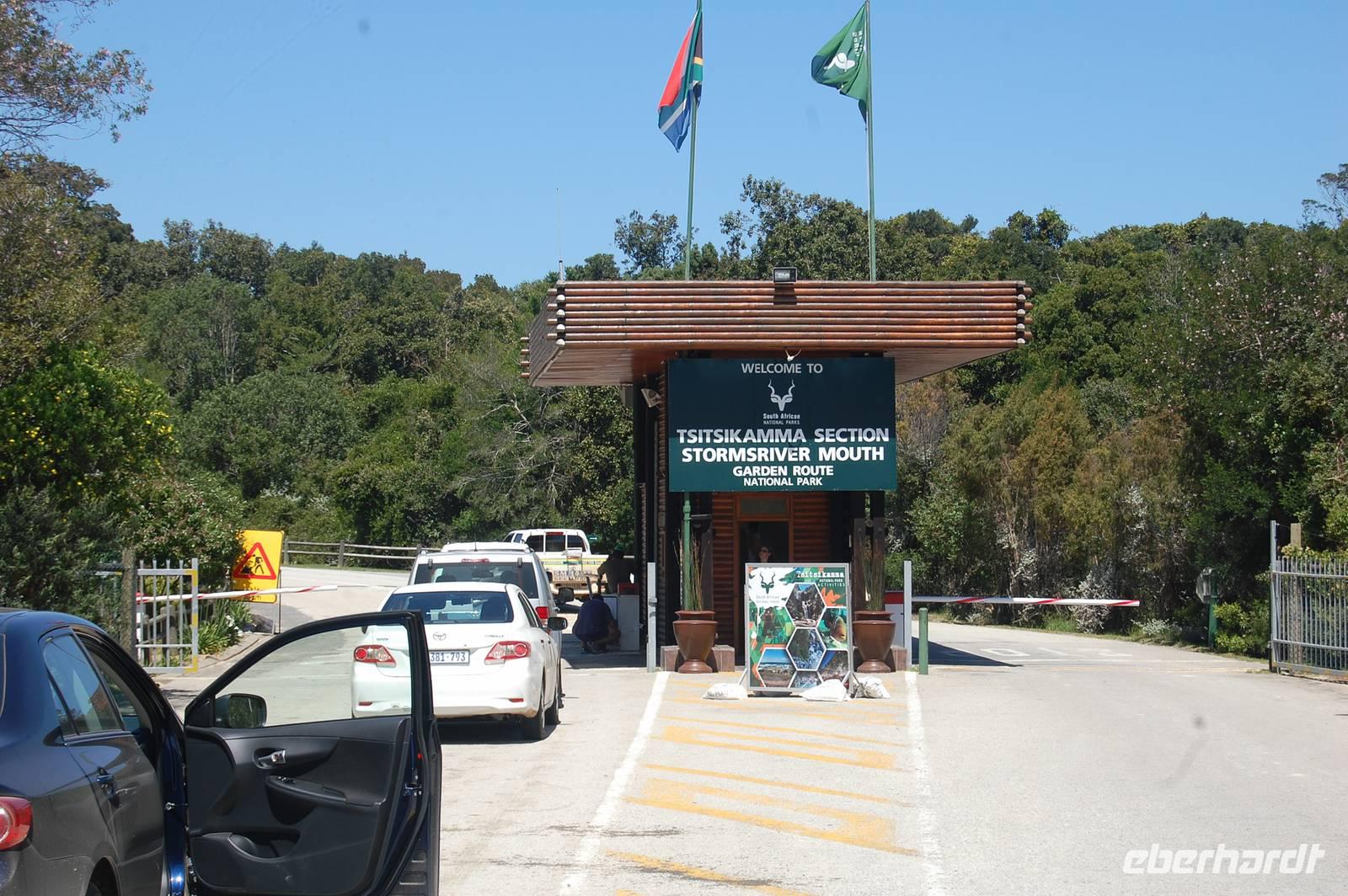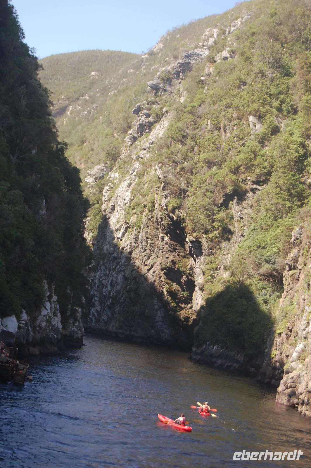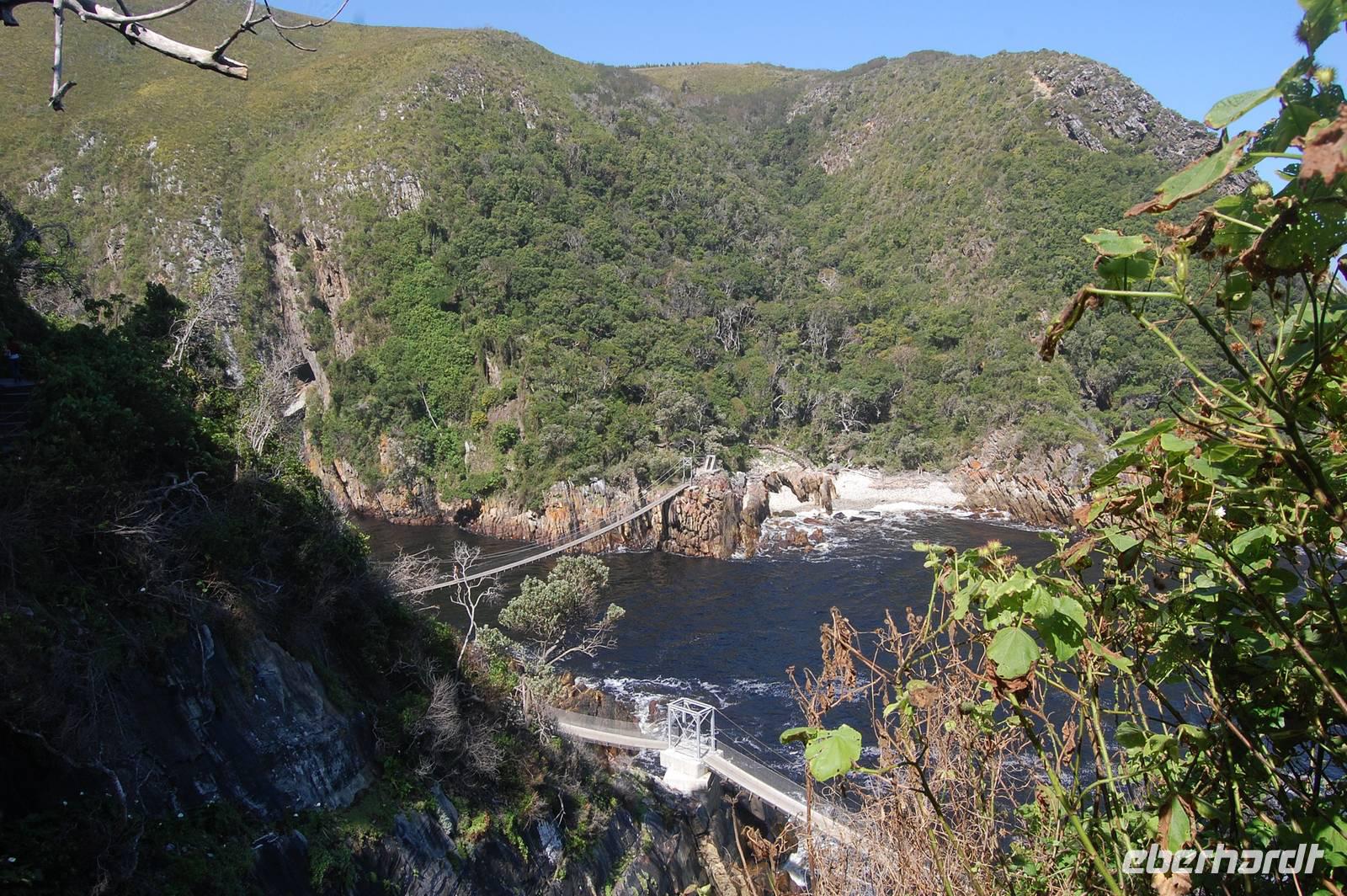 Wir verabschieden uns herzlich von Alicia und Carsten startet mit seinem Kleinbus in Richtung Port Elizabeth. Nach einer obligatorischen Pause erreichen wir den Park des „BigTree" gegen 13.00 Uhr. Wir unternehmen einen kurzen Rundgang zum 1000 Jahre alten Gelbholzbaum. Auf dem Weg erläutert uns Carsten sehr viel über die einheimische Flora. Nach kurzer Weiterfahrt erreichen wir um 14:30 Uhr den Eingang zum Tsitsikamma-Nationalpark, wo wir unser Picknick einnehmen. Dabei donnern die hohen Wellen des indischen Ozeans gegen das felsige Ufer und die Gischt schießt meterhoch. Nun machen wir uns auf die einstündige Wanderung zur Hängebrücke des Storm´s River und gelangen über zwei kleinere Hängebrücken und viele Stufen wieder auf unseren Ausgangsweg. Das schöne Sonnenwetter und die herrliche Landschaft des Nationalparkes machen Lust auf mehr, aber die Zeit ist fortgeschritten und so brechen wir um 15:30 Uhr nach Knysna auf, wo wir die nächsten drei Nächte bleiben werden. Nach einer kleinen übersichtlichen Stadtrundfahrt durch den "Lagunenort" erreichen wir um 17 Uhr das 2010 neu gebaute Rex-Hotel. Neben der sehr netten Rezeptionistin und einem Welcome-Drink empfängt uns ein sehr modernes Ambiente. Die Zimmer sind sehr geräumig und geschmackvoll eingerichtet.