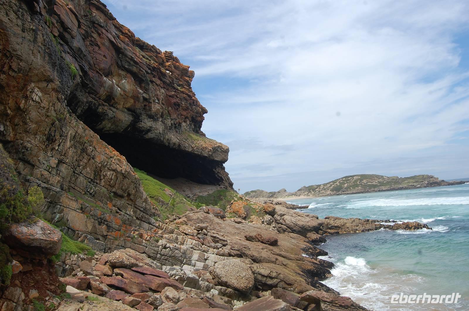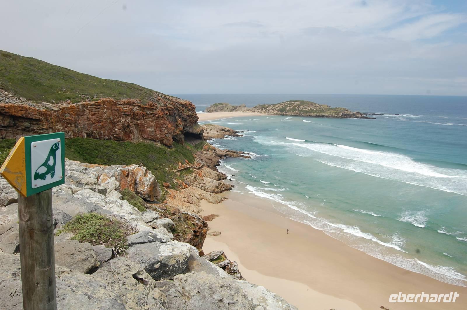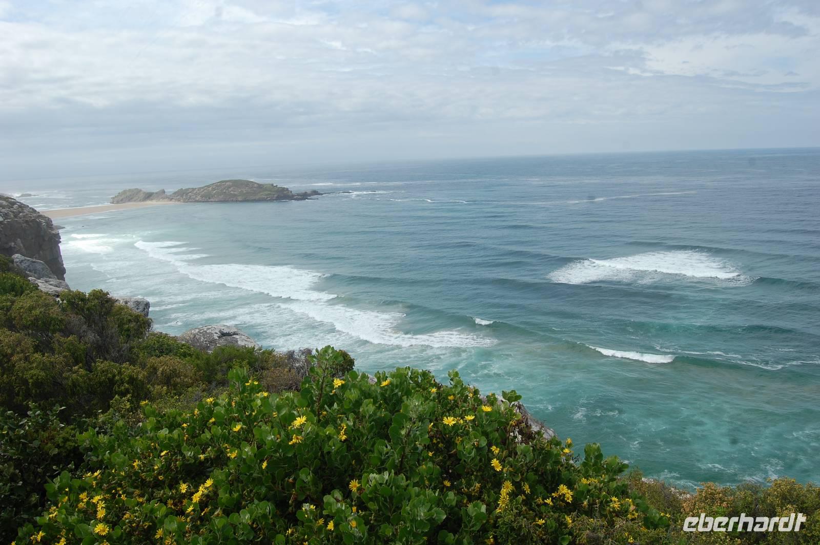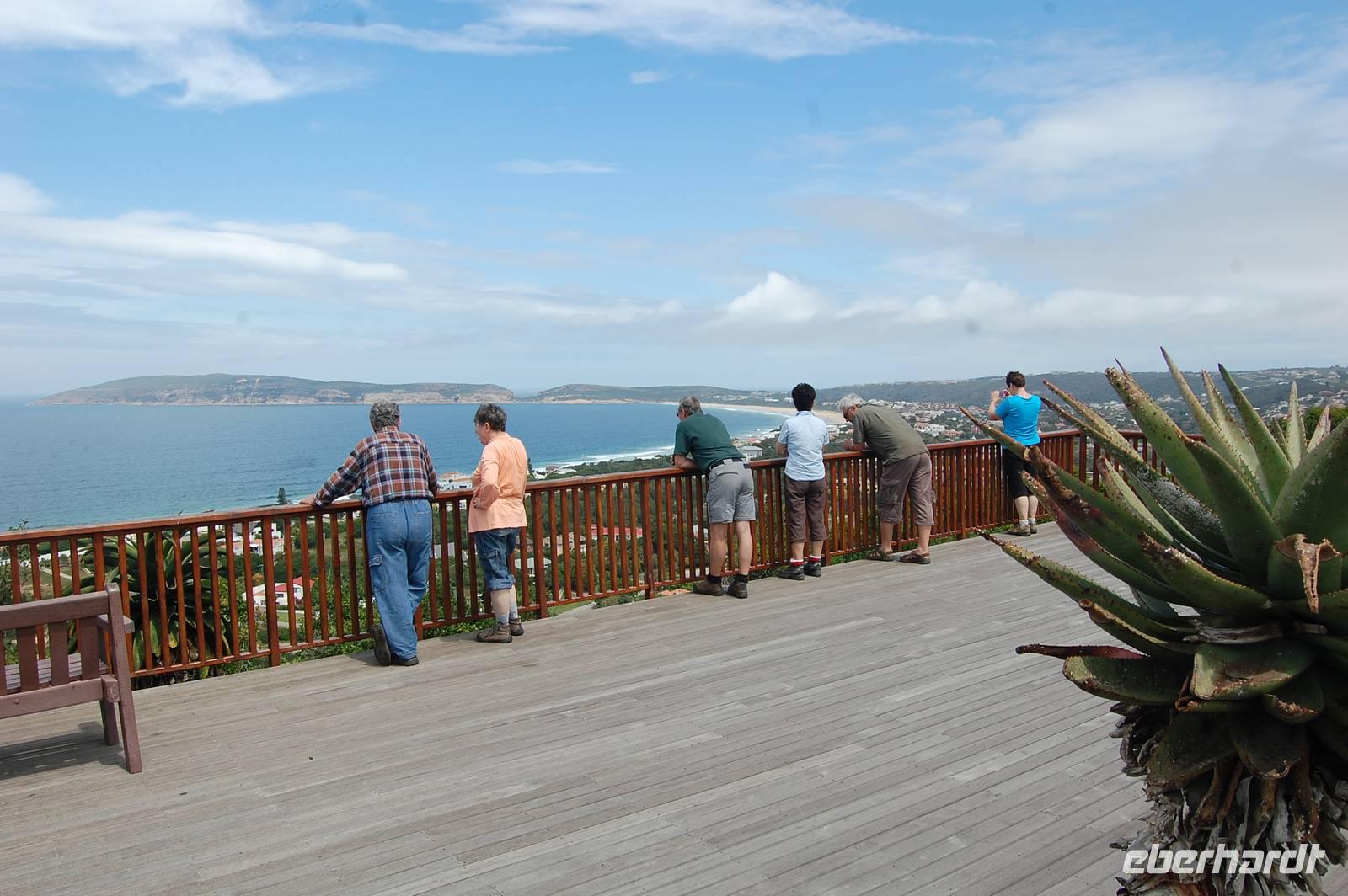 Wir frühstücken um 08.00 Uhr und fahren um 09.00 Uhr nach Osten in Richtung Plettenberg Bay. Um 09:45 Uhr am Robbberg-Naturreservat angekommen, parken wir ab, um die Halbinsel zu Fuß zu erkunden. Unterwegs konnten wir in der Brandung tummelnde Pelzrobben sehen und hören. Im offenen Meer sahen wir einen Wal. Nach 1,5 Stunden entlang der Klippen geht es wieder bergab. Über einen feinsandigen Hang erreichen wir eine Badebucht. Dort bietet sich endlich eine Möglichkeit, im Indischen Ozean zu baden (Wassertemperatur: ca. 18 °C). Nach einer knappen Stunde gehen wir am Strand der Bucht entlang und steigen wieder auf knapp 100 m. An mit Geländern gesicherten Klippen entlang kommen wir zu einem riesigen Felsvorsprung, wo vor 3000 - 4000 Jahren das Urvolk der Khoi lebte. Deren Hauptnahrung bestand aus Meeresfrüchten. Noch heute befinden sich in dieser Höhle meterhohe Schichten von Muschelschalen und Krabbenpanzern. Schließlich kommen wir gegen 13.00 Uhr zum Parkplatz zurück. Carsten hatte während der Wanderung sehr ausführlich über die Flora und Fauna erzählt. Bei strahlendem Sonnenschein war es eine landschaftlich sehr schöne Wanderung und der eingelegte Badestopp war ein Muss in diesem Urlaub. Gegen 13.00 Uhr fahren wir nach Plettenberg, wo uns Carsten nach einer kleinen Rundfahrt zu einem Aussichtspunkt bringt, von dem wir wunderbar auf die Plettenberg-Bucht schauen können. Nun machten wir uns auf die Heimreise zum Hotel, Carsten stoppte noch an einem Aussichtspunkt in Knysna, wo wir auf die Landzunge blicken konnten, auf der wir am Vortag die Feaderbed-Experience durchgeführt hatten. Um 14.30 Uhr erreichten wir unser Hotel, um 15.00 Uhr verabredeten wir uns zum Kaffeetrinken an der "Waterfront", um in Anschluss bei schönem Wetter noch eine kleine Runde über die Main Road nach Hause zu schlendern.