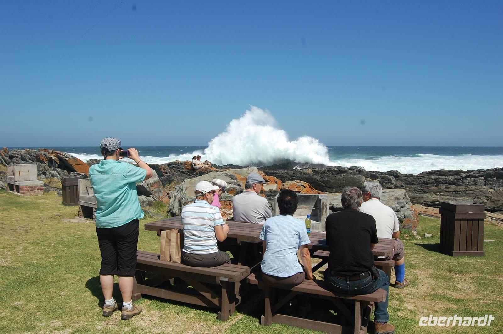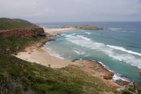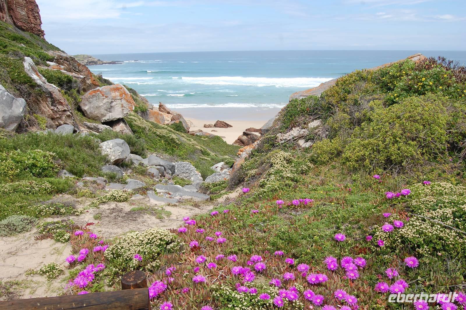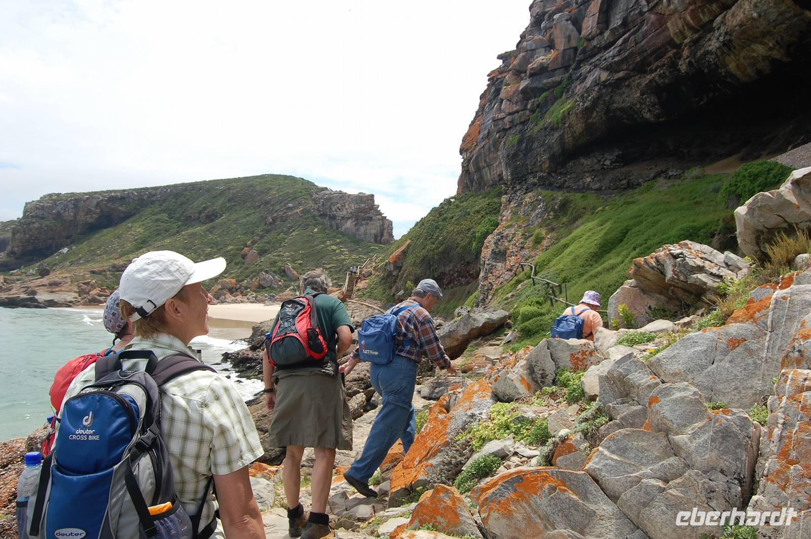 Wir frühstücken um 08.00 Uhr und fahren um 09.00 Uhr nach Osten in Richtung Plettenberg Bay. Um 09:45 Uhr am Robbberg-Naturreservat angekommen, parken wir ab, um die Halbinsel zu Fuß zu erkunden. Unterwegs konnten wir in der Brandung tummelnde Pelzrobben sehen und hören. Im offenen Meer sahen wir einen Wal. Nach 1,5 Stunden entlang der Klippen geht es wieder bergab. Über einen feinsandigen Hang erreichen wir eine Badebucht. Dort bietet sich endlich eine Möglichkeit, im Indischen Ozean zu baden (Wassertemperatur: ca. 18 °C). Nach einer knappen Stunde gehen wir am Strand der Bucht entlang und steigen wieder auf knapp 100 m. An mit Geländern gesicherten Klippen entlang kommen wir zu einem riesigen Felsvorsprung, wo vor 3000 - 4000 Jahren das Urvolk der Khoi lebte. Deren Hauptnahrung bestand aus Meeresfrüchten. Noch heute befinden sich in dieser Höhle meterhohe Schichten von Muschelschalen und Krabbenpanzern. Schließlich kommen wir gegen 13.00 Uhr zum Parkplatz zurück. Carsten hatte während der Wanderung sehr ausführlich über die Flora und Fauna erzählt. Bei strahlendem Sonnenschein war es eine landschaftlich sehr schöne Wanderung und der eingelegte Badestopp war ein Muss in diesem Urlaub. Gegen 13.00 Uhr fahren wir nach Plettenberg, wo uns Carsten nach einer kleinen Rundfahrt zu einem Aussichtspunkt bringt, von dem wir wunderbar auf die Plettenberg-Bucht schauen können. Nun machten wir uns auf die Heimreise zum Hotel, Carsten stoppte noch an einem Aussichtspunkt in Knysna, wo wir auf die Landzunge blicken konnten, auf der wir am Vortag die Feaderbed-Experience durchgeführt hatten. Um 14.30 Uhr erreichten wir unser Hotel, um 15.00 Uhr verabredeten wir uns zum Kaffeetrinken an der "Waterfront", um in Anschluss bei schönem Wetter noch eine kleine Runde über die Main Road nach Hause zu schlendern.