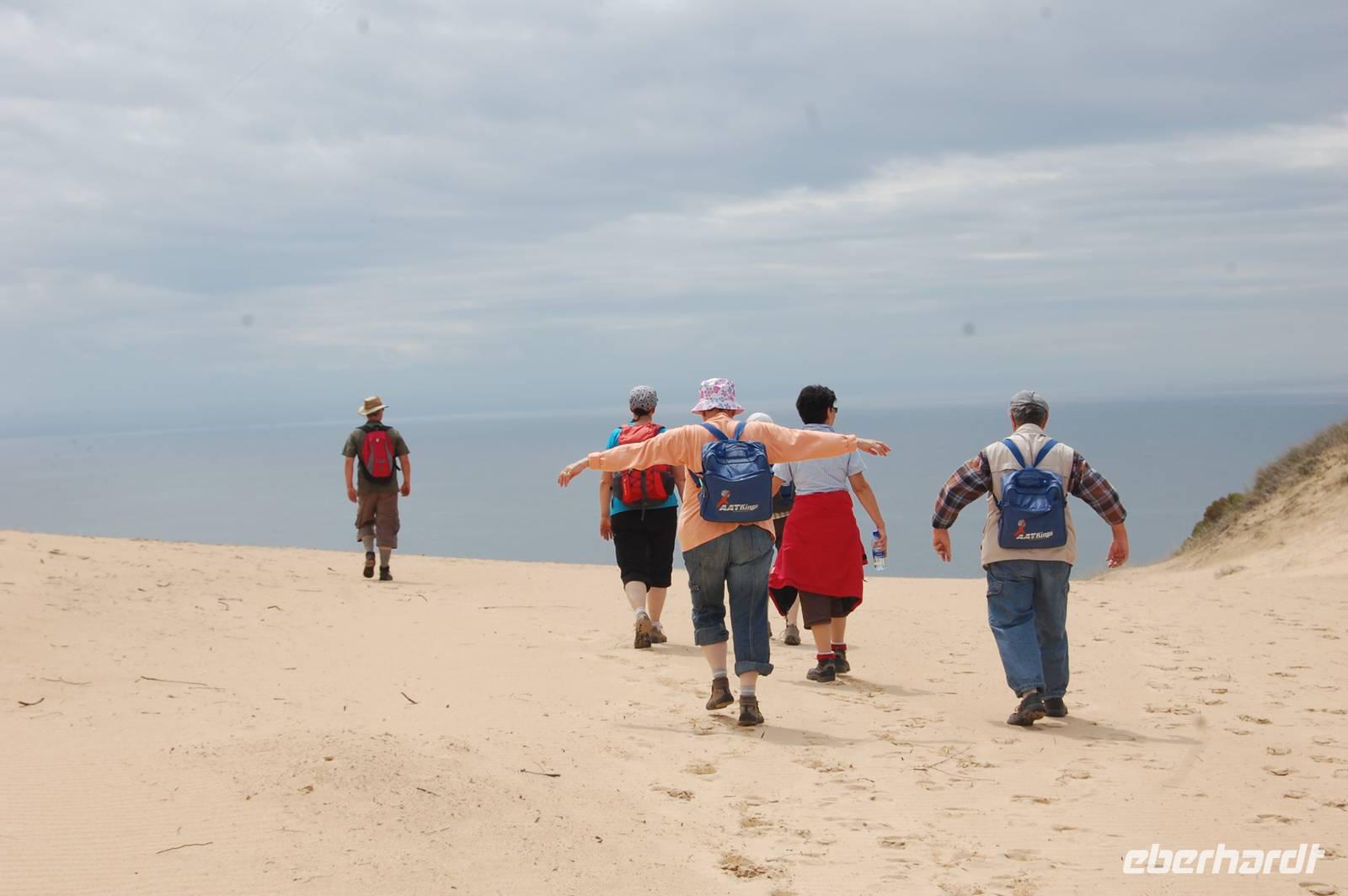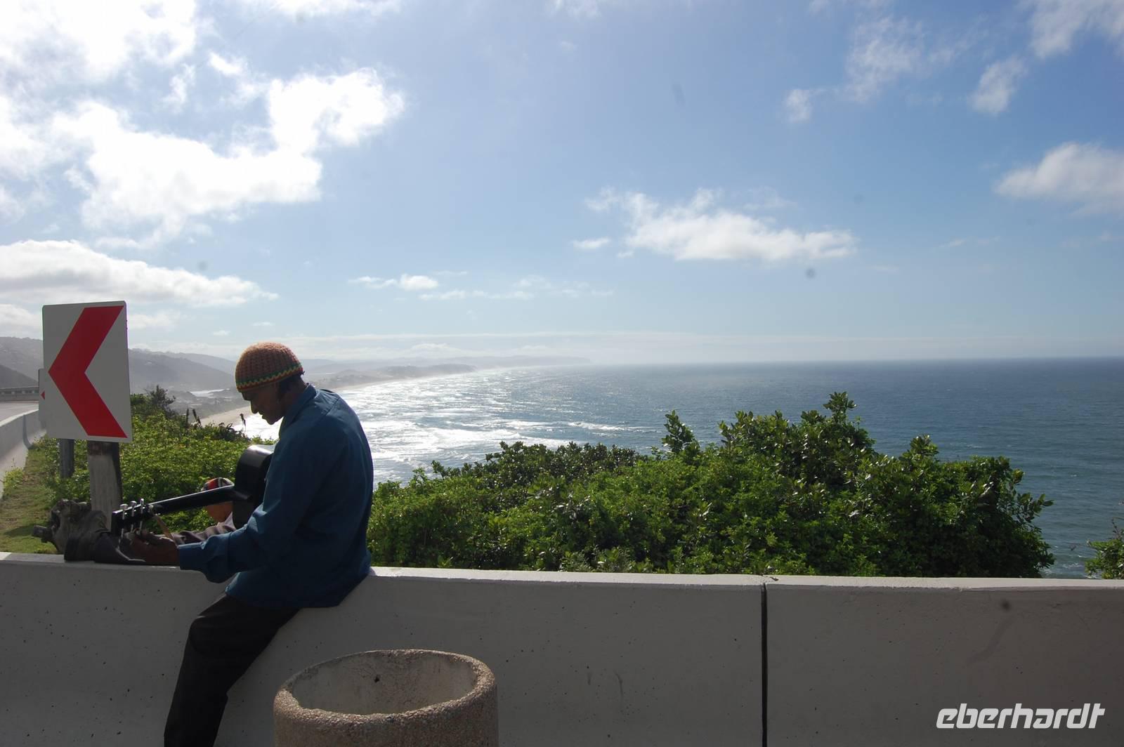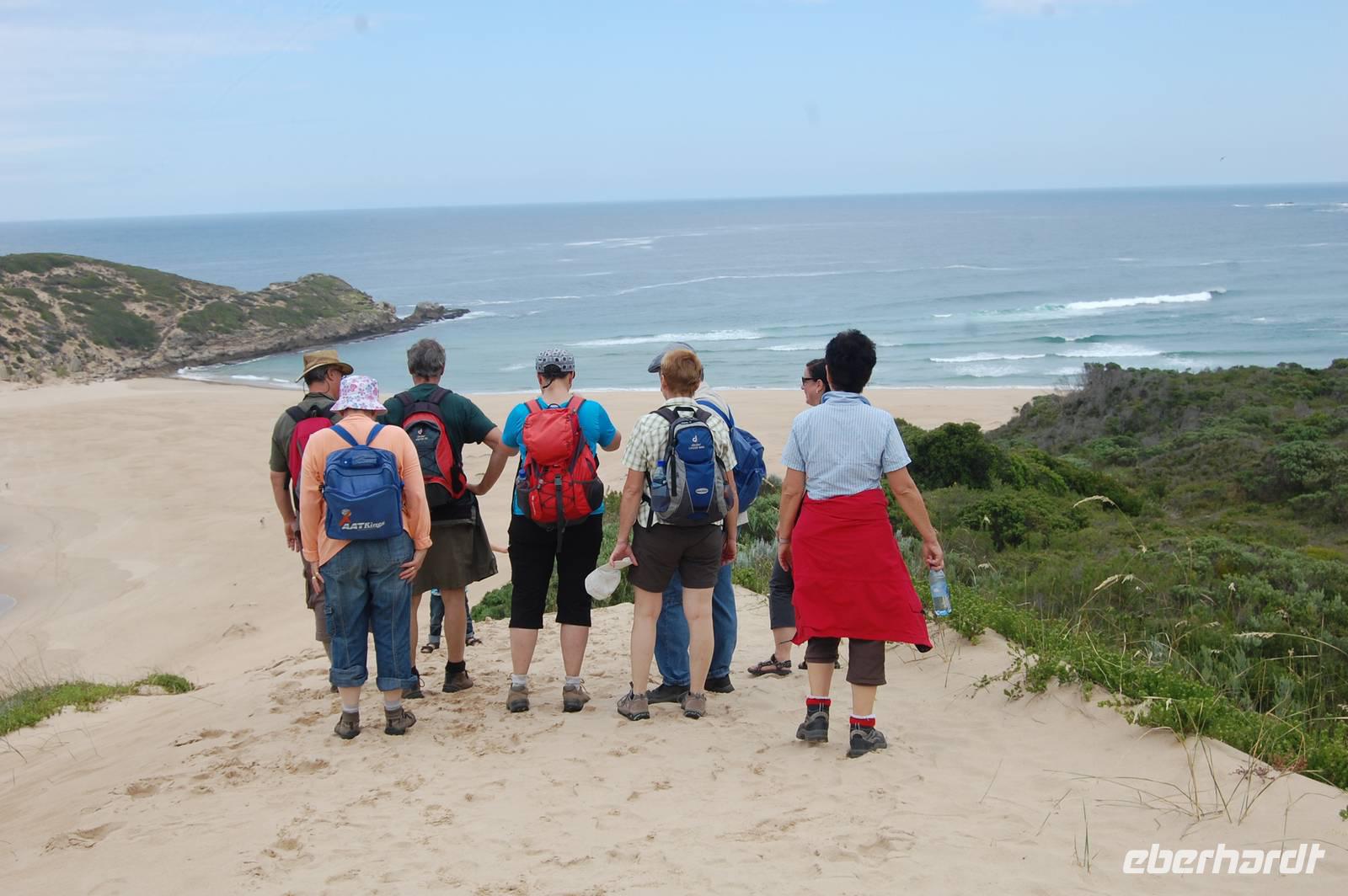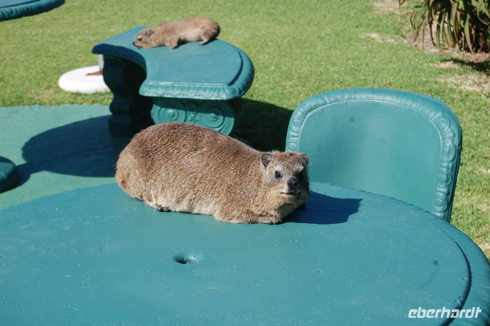 Wir frühstücken um 08.00 Uhr und fahren um 09.00 Uhr nach Osten in Richtung Plettenberg Bay. Um 09:45 Uhr am Robbberg-Naturreservat angekommen, parken wir ab, um die Halbinsel zu Fuß zu erkunden. Unterwegs konnten wir in der Brandung tummelnde Pelzrobben sehen und hören. Im offenen Meer sahen wir einen Wal. Nach 1,5 Stunden entlang der Klippen geht es wieder bergab. Über einen feinsandigen Hang erreichen wir eine Badebucht. Dort bietet sich endlich eine Möglichkeit, im Indischen Ozean zu baden (Wassertemperatur: ca. 18 °C). Nach einer knappen Stunde gehen wir am Strand der Bucht entlang und steigen wieder auf knapp 100 m. An mit Geländern gesicherten Klippen entlang kommen wir zu einem riesigen Felsvorsprung, wo vor 3000 - 4000 Jahren das Urvolk der Khoi lebte. Deren Hauptnahrung bestand aus Meeresfrüchten. Noch heute befinden sich in dieser Höhle meterhohe Schichten von Muschelschalen und Krabbenpanzern. Schließlich kommen wir gegen 13.00 Uhr zum Parkplatz zurück. Carsten hatte während der Wanderung sehr ausführlich über die Flora und Fauna erzählt. Bei strahlendem Sonnenschein war es eine landschaftlich sehr schöne Wanderung und der eingelegte Badestopp war ein Muss in diesem Urlaub. Gegen 13.00 Uhr fahren wir nach Plettenberg, wo uns Carsten nach einer kleinen Rundfahrt zu einem Aussichtspunkt bringt, von dem wir wunderbar auf die Plettenberg-Bucht schauen können. Nun machten wir uns auf die Heimreise zum Hotel, Carsten stoppte noch an einem Aussichtspunkt in Knysna, wo wir auf die Landzunge blicken konnten, auf der wir am Vortag die Feaderbed-Experience durchgeführt hatten. Um 14.30 Uhr erreichten wir unser Hotel, um 15.00 Uhr verabredeten wir uns zum Kaffeetrinken an der "Waterfront", um in Anschluss bei schönem Wetter noch eine kleine Runde über die Main Road nach Hause zu schlendern.
