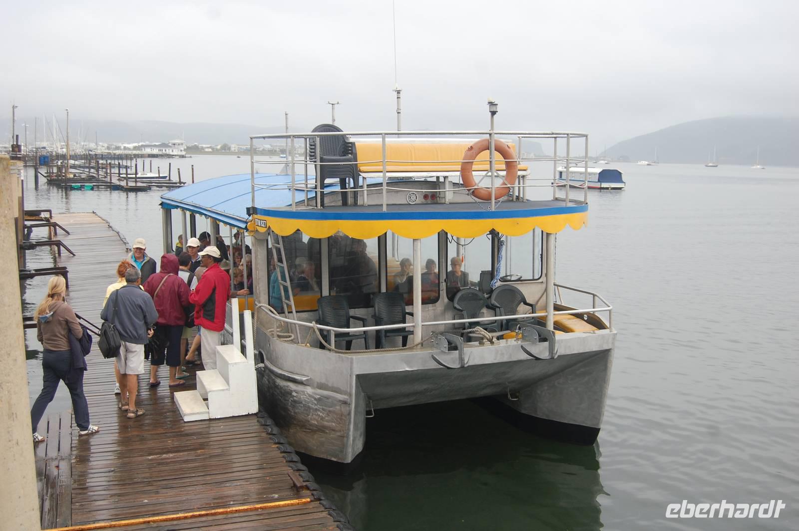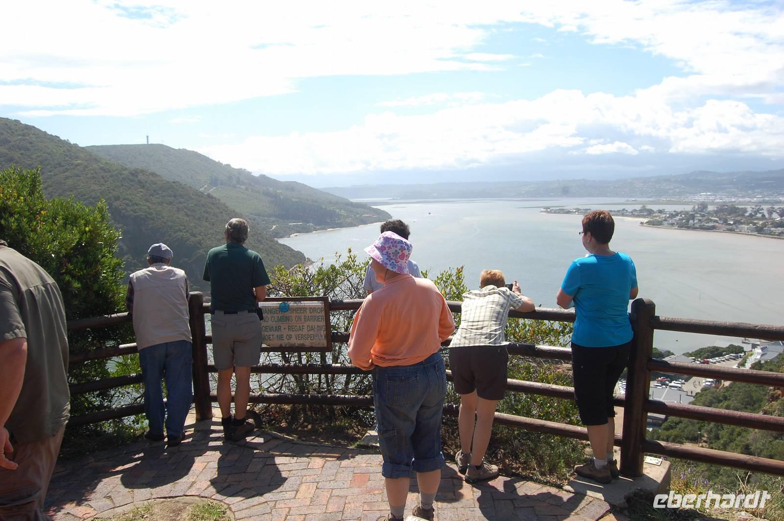 Heute möchten wir ausschlafen und treffen uns erst um 08:30 Uhr zum Frühstück im benachbarten Café. Leider gewittert es. Wir brechen dennoch um 10 Uhr auf, um die „Featherbed-Experience" in Angriff zu nehmen. Wir werden von Carsten am Bootssteg mit Tickets ausgestattet und legen ab. Auf der Fahrt durch die Lagune von Knysna moderiert ein lustiger junger Mann (Oliver) über Mikrofon und erzählt auf Englisch etwas über die Inseln und deren Bewohner. Recht lustig und trocken (Boot ist mit einem Dach ausgestattet) erreichen wir die „Featherbed-Bay" unser Ausgangspunkt für unser gebuchtes Erlebnis. Wir werden einem Unimog-Gespann zugeordnet, das sich mit zwei Hängern den steilen Weg nach oben quält. Oliver steht auf der Ladefläche des LKW und moderiert trotz des Regens fröhlich weiter. So erfahren wir mehr über die Pflanzen- und Tierwelt des Westkopfes der Halbinsel. Oben angekommen, führt ein 2,2 km langer gut ausgebauter Weg wieder zurück ans Meer. Oliver begleitet uns und wir haben Gelegenheit, viele Fragen zu stellen. Einige Wege führen vom Hauptweg zu Aussichtspunkten oder zu Meereshöhlen. Glücklicherweise pausiert der Regen während unserer Rückwanderung, so dass wir die einzigartige Landschaft und Natur entspannt genießen können. Gegen 12.00 Uhr treffen wir im Restaurant ein, wo das Mittagessen eingenommen werden kann. Eine gute Auswahl an verschiedenen Salaten, Beilagen, Fisch, Fleisch und Geflügel, dazu verschiedene Obstsorten und verschiedene Desserts, stehen für alle auf dem Buffet bereit. Um 13:30 Uhr brechen wir zum Bootsanleger auf, um wenig später im Hafen von Knysna wieder sicher anzulegen. Nun haben wir bis zum gemeinsam geplanten Abendessen etwas Zeit zum Shoppen oder Ausspannen. Um 19.00 Uhr treffen wir uns zum gemeinsamen Abendessen. Ich habe einen Tisch im „Firefly Eating House" reservieren lassen. Wir wandern ca. 2 km an der Uferstraße entlang und werden in einem purpurroten Kaminzimmer platziert. Es gibt kleine Portionen verschiedenster Küchenkreationen, nicht viel, aber sehr interessant zusammengestellt und gewürzt. (Hatte den Tipp aus dem Reiseführer). Als Wandergruppe sind wir natürlich auch zurück ins Hotel gewandert.