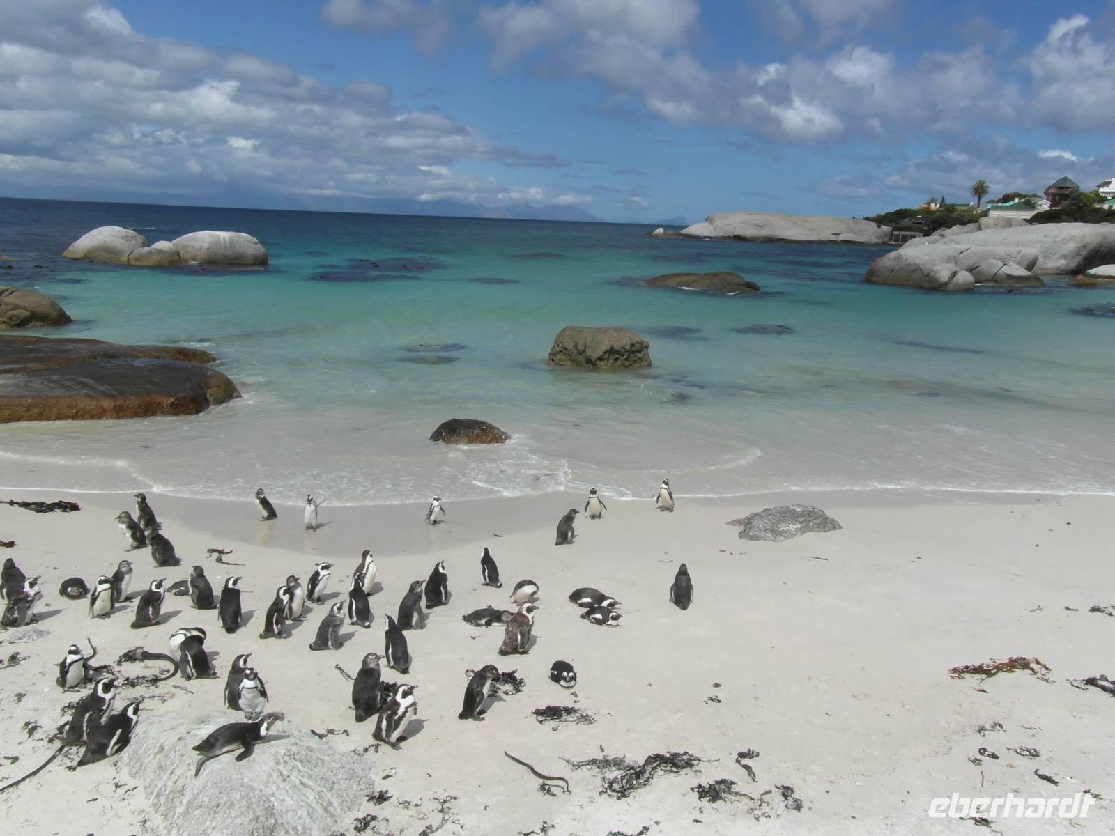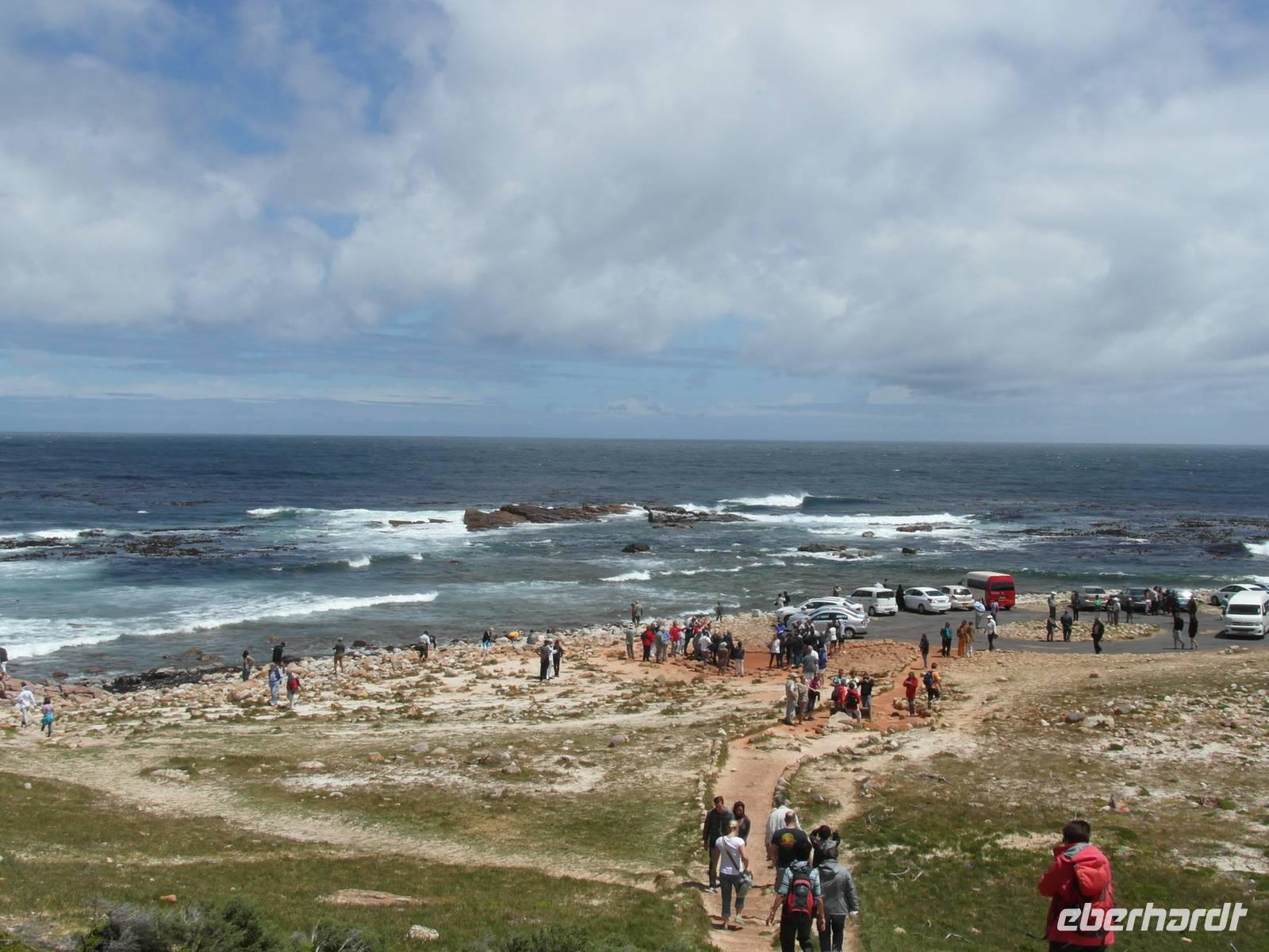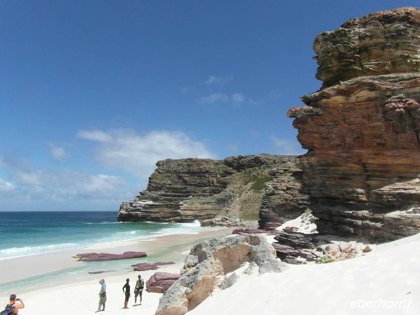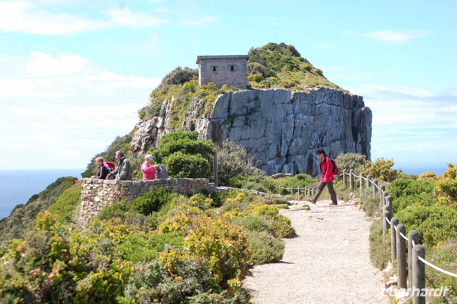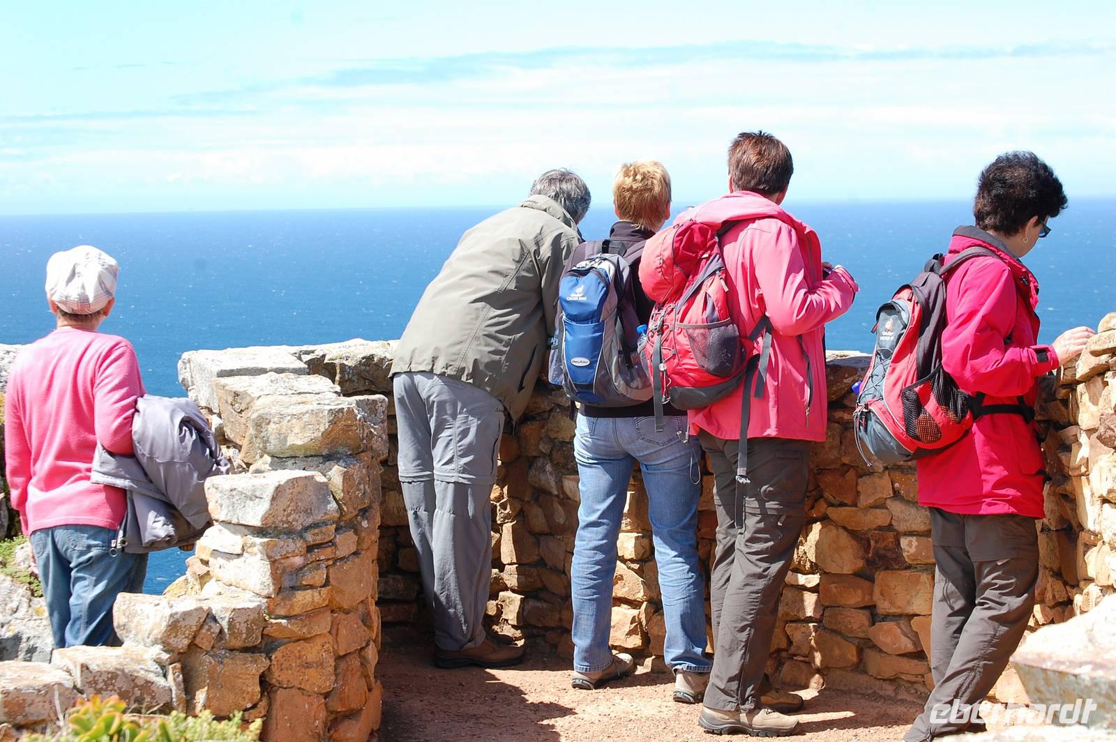 Wir starten um 08.00 Uhr in Richtung Süden, kommen am neuen Stadion von Kapstadt vorbei und folgen zuerst der Westküste der Kap-Halbinsel. An einem Aussichtspunkt schauen wir zurück auf die Huot Bay (Holzbucht, weil hier die Schiffbauer in früheren Zeiten das Holz zur Reparatur der Schiffe fanden) und erreichen den Eingang des Kap-Nationalparks. Carsten stellt um 09:30 Uhr den Bus an der Talstation der Standseilbahn ab. Wegen des schönen Wetters beschließen wir, den Weg zum alten Leuchtturm auf dem Berg zu Fuß zu bewältigen. Bei strahlendem Sonnenschein wandern wir weiter zur Landzunge „Cape Point", wo 1924 ein weiterer Leuchtturm in Meeresspiegelhöhe errichtet wurde, der auch bei wolkenbehangener Bergspitze den nahenden Schiffen sicheres Geleit geben konnte. Unterwegs beobachten wir einen Orka-Wal, zwei kuschlige Klippschliefer und fotografieren die herrliche Pflanzenwelt. Nach zwei Stunden erreichen wir wieder die Talstation, um gleich gemeinsam weiter zum Kap der guten Hoffnung zu wandern. Nach einem Abstecher hinunter zum herrlichen Dias-Strand, mit seinem weißen Sand und den hohen Wellen, steigen wir die vielen Holzstufen wieder hinauf zum gut befestigten Wanderweg. Über Stock und Stein erklimmen wir eine letzte Erhebung, um dann über steinige Wege endgültig zum "Cape of Good Hope" abzusteigen. Das wohl am meisten fotografierte Schild Südafrikas wird von Touristengruppen aus aller Welt stark frequentiert. Dennoch gelingt es uns, ein Gruppenfoto zu machen und dabei mit einem Glas südafrikanischem Sekt anzustoßen. Glücklich über das prächtige Wetter und mit zahlreichen tollen Fotos im „Kasten" verlassen wir gegen 13.00 Uhr das Naturschutzgebiet der Kapregion, um nun entlang der „False Bay" die Ostseite der Kap-Halbinsel zu erkunden. Nach einer kurzen Fahrt erreichen wir das Städtchen Simon´s Town, wo wir uns einen Cappuccino genehmigen. Dann laufen wir nicht einmal 800 m, um zum Eingang des Pinguin-Reservates zu gelangen. Hier am Boulders Beach lebt die einzige Kolonie der stark bedrohten afrikanischen Pinguine.