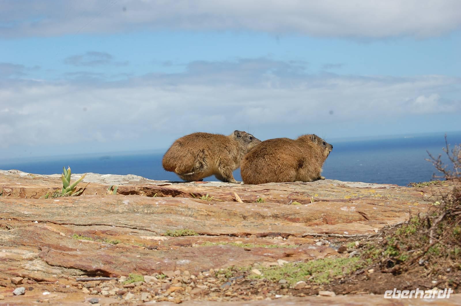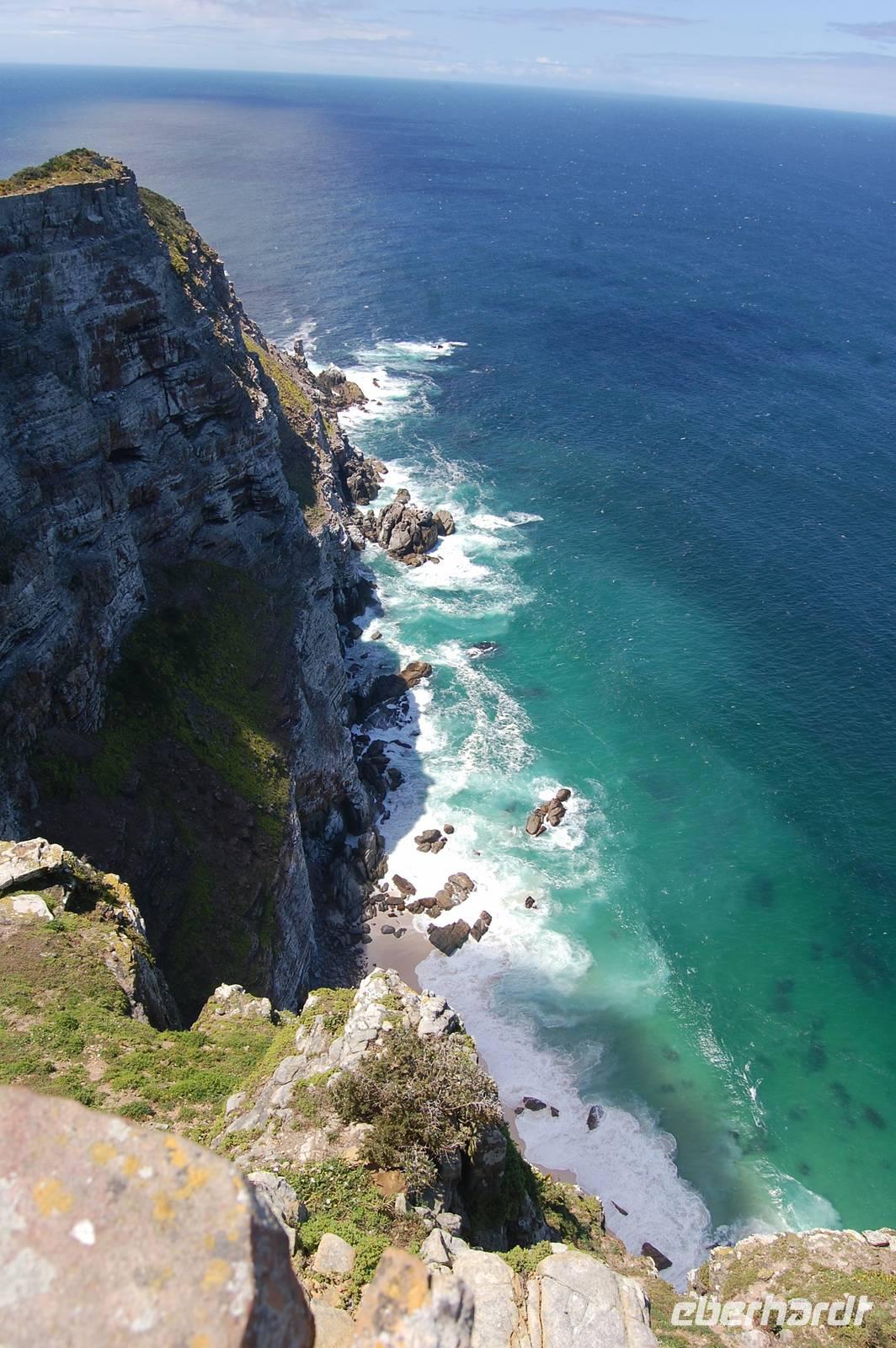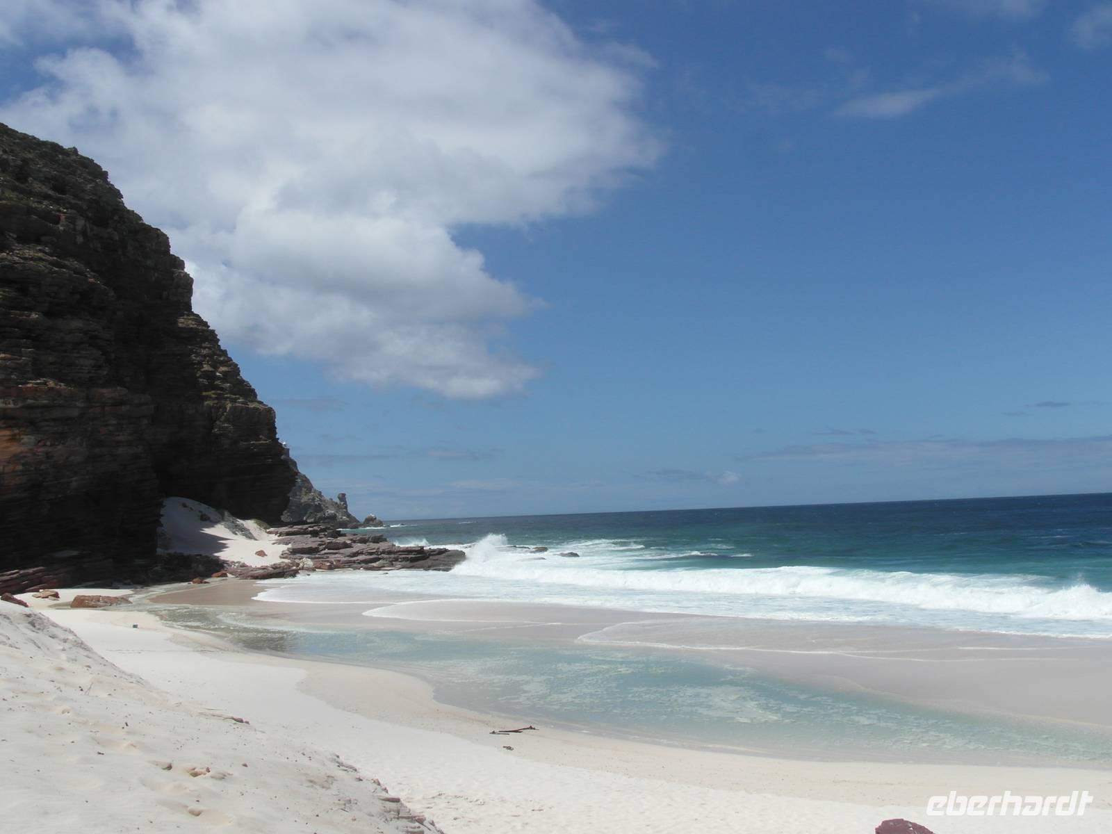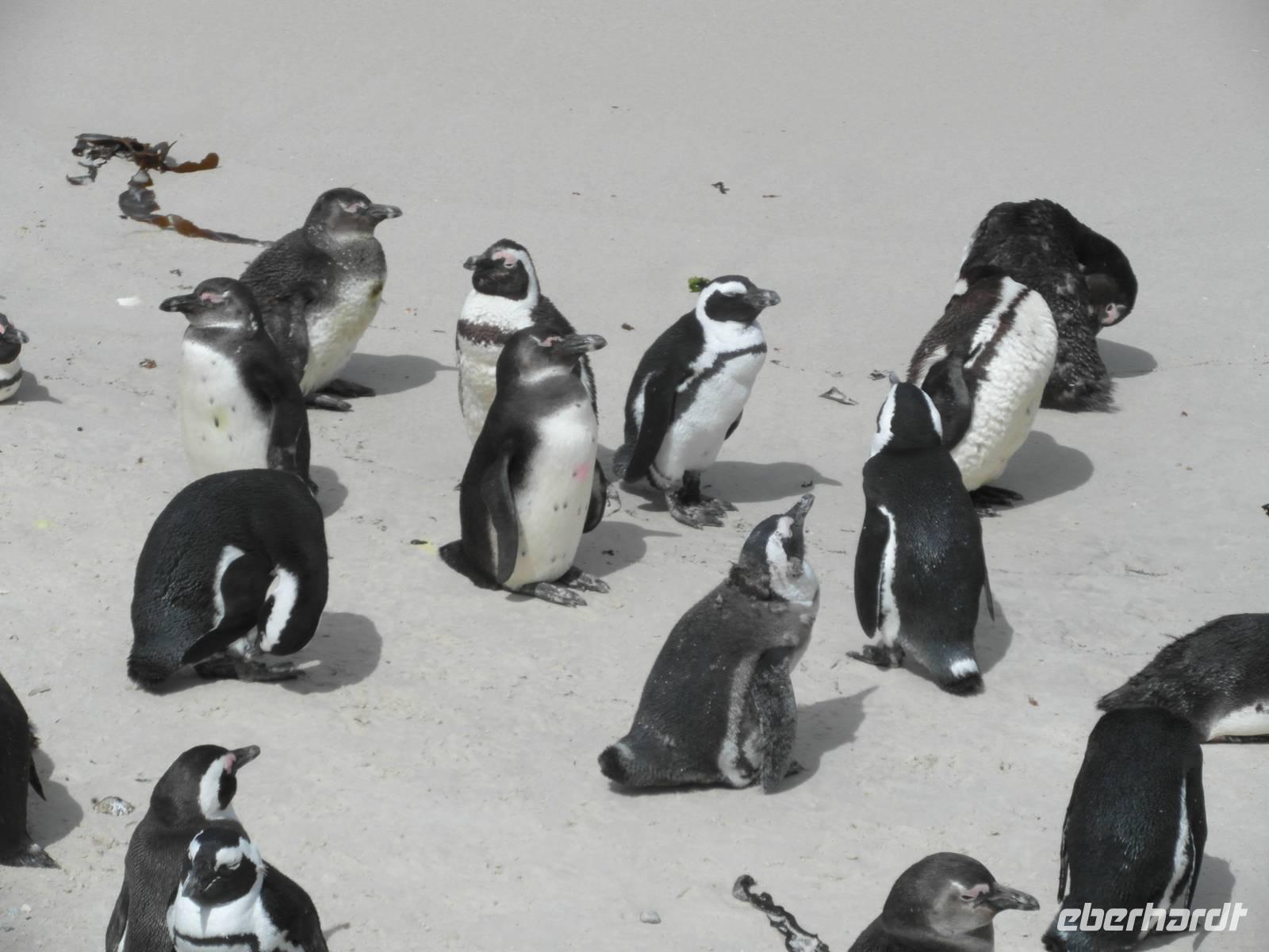 Wir starten um 08.00 Uhr in Richtung Süden, kommen am neuen Stadion von Kapstadt vorbei und folgen zuerst der Westküste der Kap-Halbinsel. An einem Aussichtspunkt schauen wir zurück auf die Huot Bay (Holzbucht, weil hier die Schiffbauer in früheren Zeiten das Holz zur Reparatur der Schiffe fanden) und erreichen den Eingang des Kap-Nationalparks. Carsten stellt um 09:30 Uhr den Bus an der Talstation der Standseilbahn ab. Wegen des schönen Wetters beschließen wir, den Weg zum alten Leuchtturm auf dem Berg zu Fuß zu bewältigen. Bei strahlendem Sonnenschein wandern wir weiter zur Landzunge „Cape Point", wo 1924 ein weiterer Leuchtturm in Meeresspiegelhöhe errichtet wurde, der auch bei wolkenbehangener Bergspitze den nahenden Schiffen sicheres Geleit geben konnte. Unterwegs beobachten wir einen Orka-Wal, zwei kuschlige Klippschliefer und fotografieren die herrliche Pflanzenwelt. Nach zwei Stunden erreichen wir wieder die Talstation, um gleich gemeinsam weiter zum Kap der guten Hoffnung zu wandern. Nach einem Abstecher hinunter zum herrlichen Dias-Strand, mit seinem weißen Sand und den hohen Wellen, steigen wir die vielen Holzstufen wieder hinauf zum gut befestigten Wanderweg. Über Stock und Stein erklimmen wir eine letzte Erhebung, um dann über steinige Wege endgültig zum "Cape of Good Hope" abzusteigen. Das wohl am meisten fotografierte Schild Südafrikas wird von Touristengruppen aus aller Welt stark frequentiert. Dennoch gelingt es uns, ein Gruppenfoto zu machen und dabei mit einem Glas südafrikanischem Sekt anzustoßen. Glücklich über das prächtige Wetter und mit zahlreichen tollen Fotos im „Kasten" verlassen wir gegen 13.00 Uhr das Naturschutzgebiet der Kapregion, um nun entlang der „False Bay" die Ostseite der Kap-Halbinsel zu erkunden. Nach einer kurzen Fahrt erreichen wir das Städtchen Simon´s Town, wo wir uns einen Cappuccino genehmigen. Dann laufen wir nicht einmal 800 m, um zum Eingang des Pinguin-Reservates zu gelangen. Hier am Boulders Beach lebt die einzige Kolonie der stark bedrohten afrikanischen Pinguine.