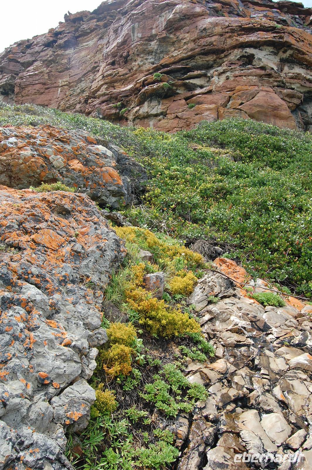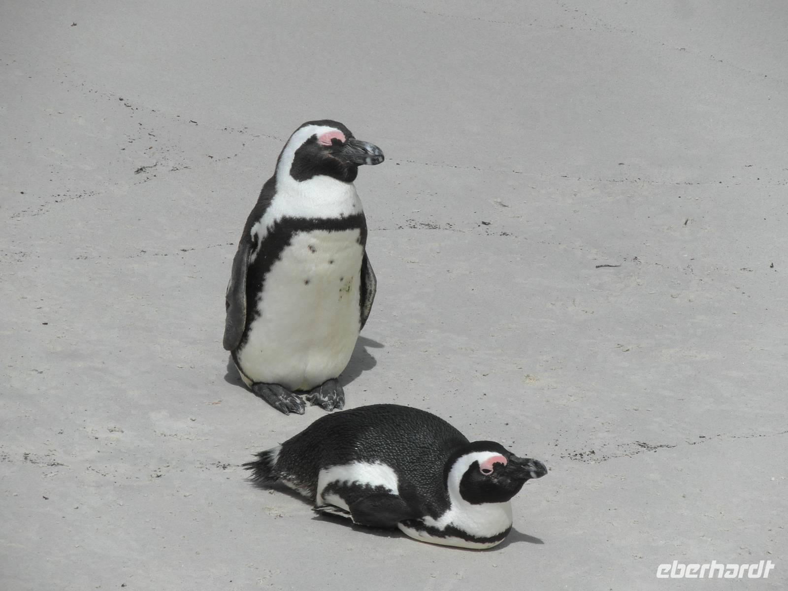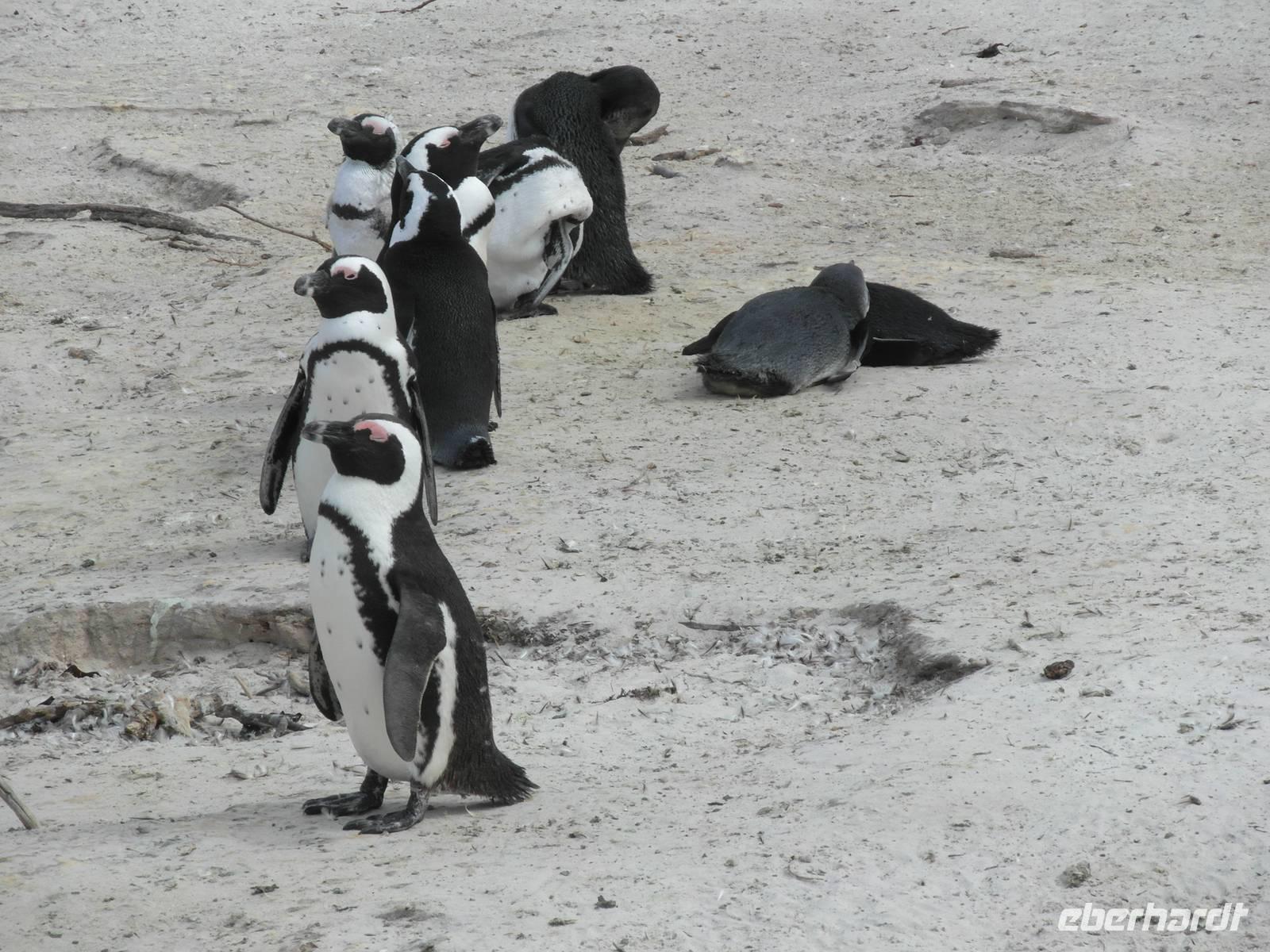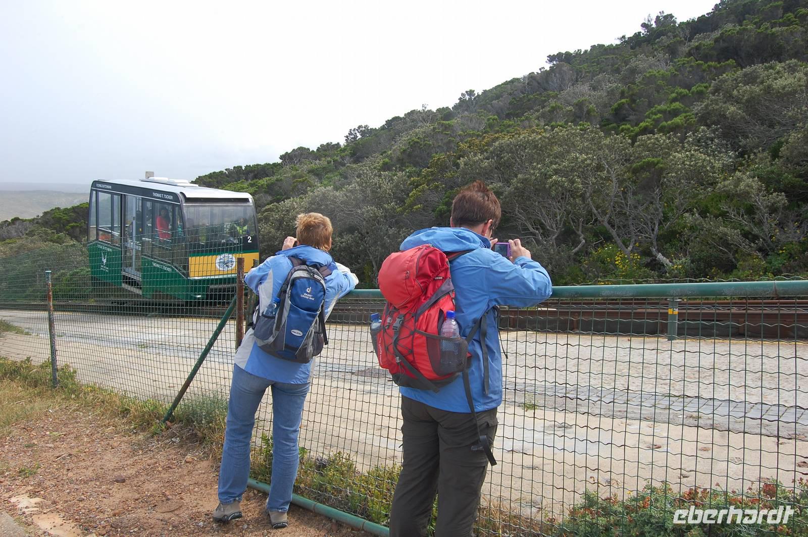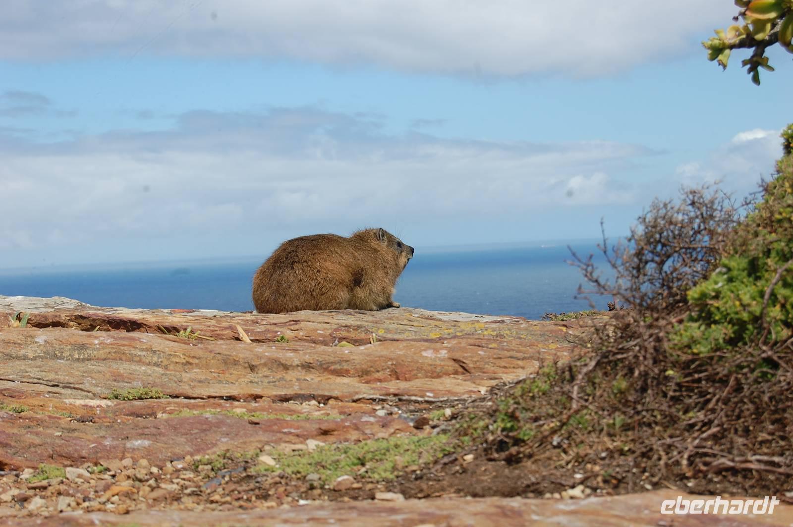 Wir starten um 08.00 Uhr in Richtung Süden, kommen am neuen Stadion von Kapstadt vorbei und folgen zuerst der Westküste der Kap-Halbinsel. An einem Aussichtspunkt schauen wir zurück auf die Huot Bay (Holzbucht, weil hier die Schiffbauer in früheren Zeiten das Holz zur Reparatur der Schiffe fanden) und erreichen den Eingang des Kap-Nationalparks. Carsten stellt um 09:30 Uhr den Bus an der Talstation der Standseilbahn ab. Wegen des schönen Wetters beschließen wir, den Weg zum alten Leuchtturm auf dem Berg zu Fuß zu bewältigen. Bei strahlendem Sonnenschein wandern wir weiter zur Landzunge „Cape Point", wo 1924 ein weiterer Leuchtturm in Meeresspiegelhöhe errichtet wurde, der auch bei wolkenbehangener Bergspitze den nahenden Schiffen sicheres Geleit geben konnte. Unterwegs beobachten wir einen Orka-Wal, zwei kuschlige Klippschliefer und fotografieren die herrliche Pflanzenwelt. Nach zwei Stunden erreichen wir wieder die Talstation, um gleich gemeinsam weiter zum Kap der guten Hoffnung zu wandern. Nach einem Abstecher hinunter zum herrlichen Dias-Strand, mit seinem weißen Sand und den hohen Wellen, steigen wir die vielen Holzstufen wieder hinauf zum gut befestigten Wanderweg. Über Stock und Stein erklimmen wir eine letzte Erhebung, um dann über steinige Wege endgültig zum "Cape of Good Hope" abzusteigen. Das wohl am meisten fotografierte Schild Südafrikas wird von Touristengruppen aus aller Welt stark frequentiert. Dennoch gelingt es uns, ein Gruppenfoto zu machen und dabei mit einem Glas südafrikanischem Sekt anzustoßen. Glücklich über das prächtige Wetter und mit zahlreichen tollen Fotos im „Kasten" verlassen wir gegen 13.00 Uhr das Naturschutzgebiet der Kapregion, um nun entlang der „False Bay" die Ostseite der Kap-Halbinsel zu erkunden. Nach einer kurzen Fahrt erreichen wir das Städtchen Simon´s Town, wo wir uns einen Cappuccino genehmigen. Dann laufen wir nicht einmal 800 m, um zum Eingang des Pinguin-Reservates zu gelangen. Hier am Boulders Beach lebt die einzige Kolonie der stark bedrohten afrikanischen Pinguine.
