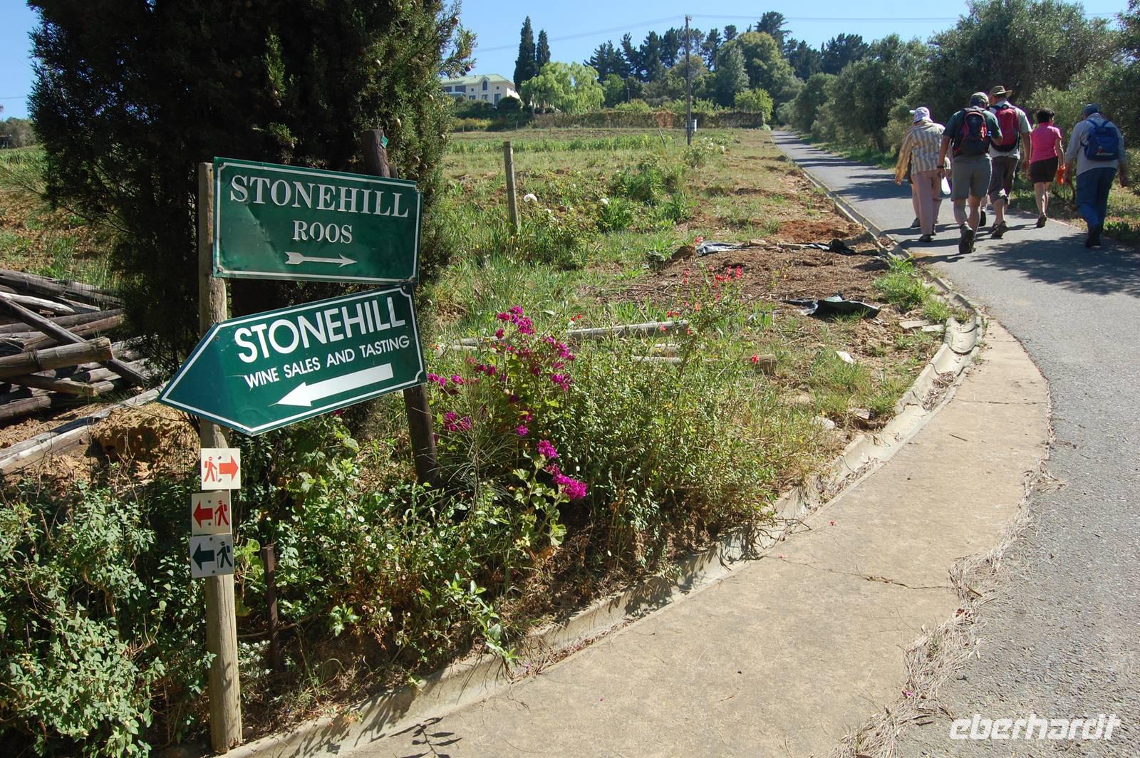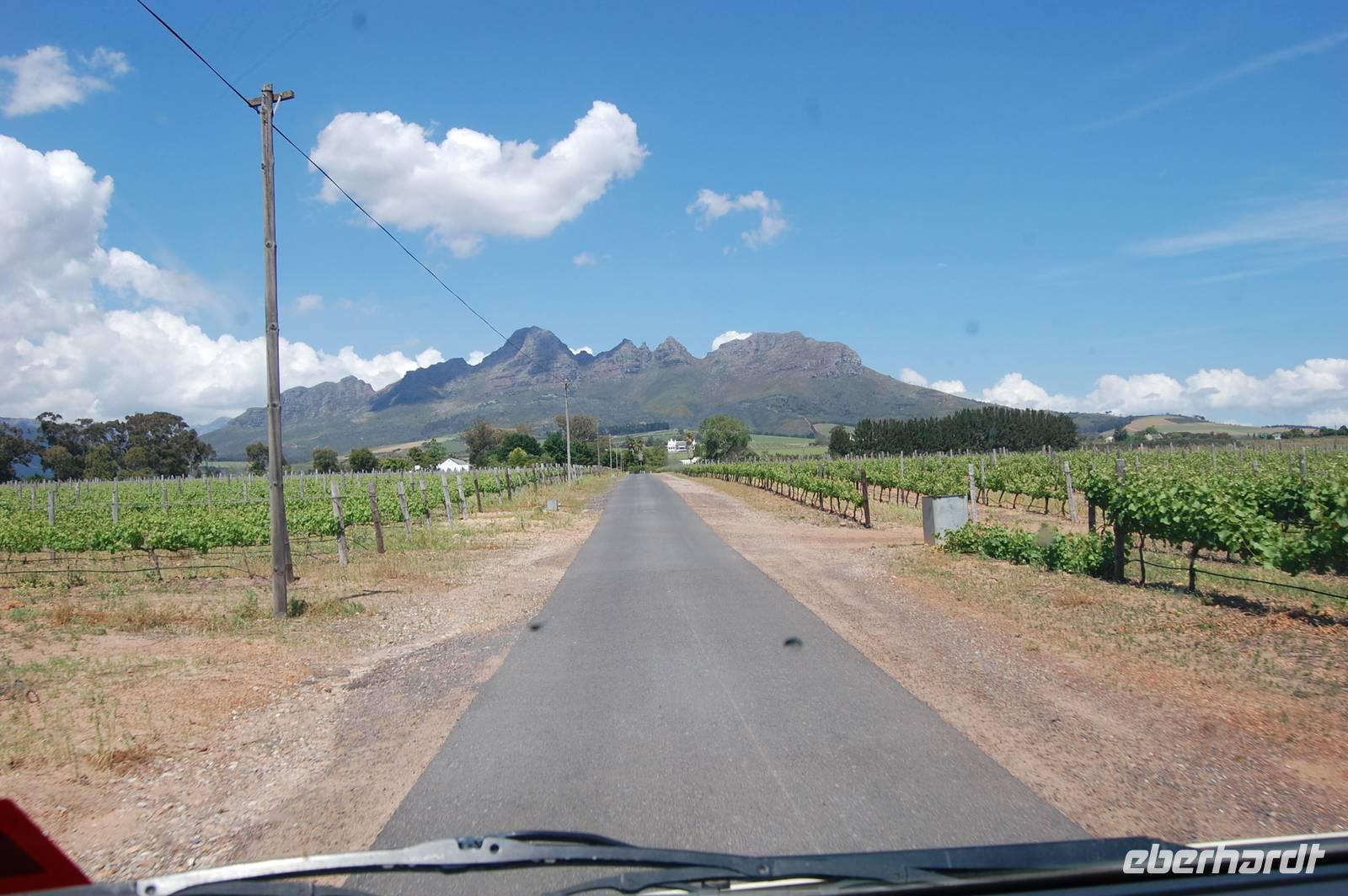 Nach einem etwas späteren Frühstück fahren wir um 09.00 Uhr zum Devon Valley Hotel nahe Stellenbosch, wo wir an der Rezeption Kartenmaterial zum geplanten Weinwanderweg erhalten. Der anfangs gut ausgeschilderte Weg führt durch die Weinplantagen, über Berge und durch Täler. Es bieten sich immer wieder schöne Fotomotive. Dank der guten Orientierung unseres Wanderführers, Carsten, finden wir den richtigen Weg und kommen nach 1,5 h am Weingut „Middelvlei" an. Dort werden wir vom Weinbauer herzlich begrüßt. Mit einem Glas Weißwein in der Hand, beginnen wir unsere Kellerführung. Im Keller angekommen, erhalten wir aus einem Tank einen frischen Rotwein. Später im Fasslager zeigt uns der Winzer einige Fotos via Beamer, die den Ablauf der Weinherstellung gut darstellen. Dazu gibt es einen fassgelagerten Rotwein zum Verkosten. Um 12.30 Uhr werden wir zum Mittag geführt. Wir sitzen auf der schattigen Terrasse des Gasthauses und nehmen uns etwas Zeit. Es gibt reichhaltiges Gegrilltes und natürlich Wein. Um 13:30 Uhr treten wir den Rückweg an und erreichen den Ausgangspunkt unserer Wanderung pünktlich um 15.00 Uhr. Es war eine sehr schöne Wanderung durch die sonnigen, gepflegten Weinberge.