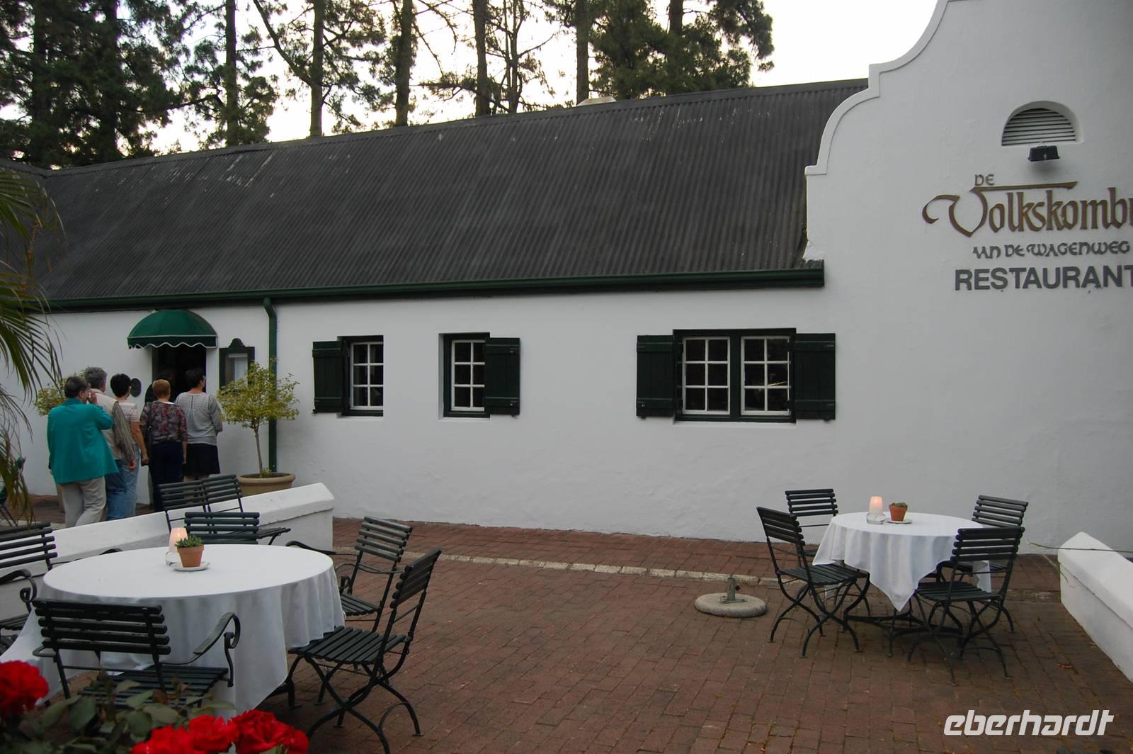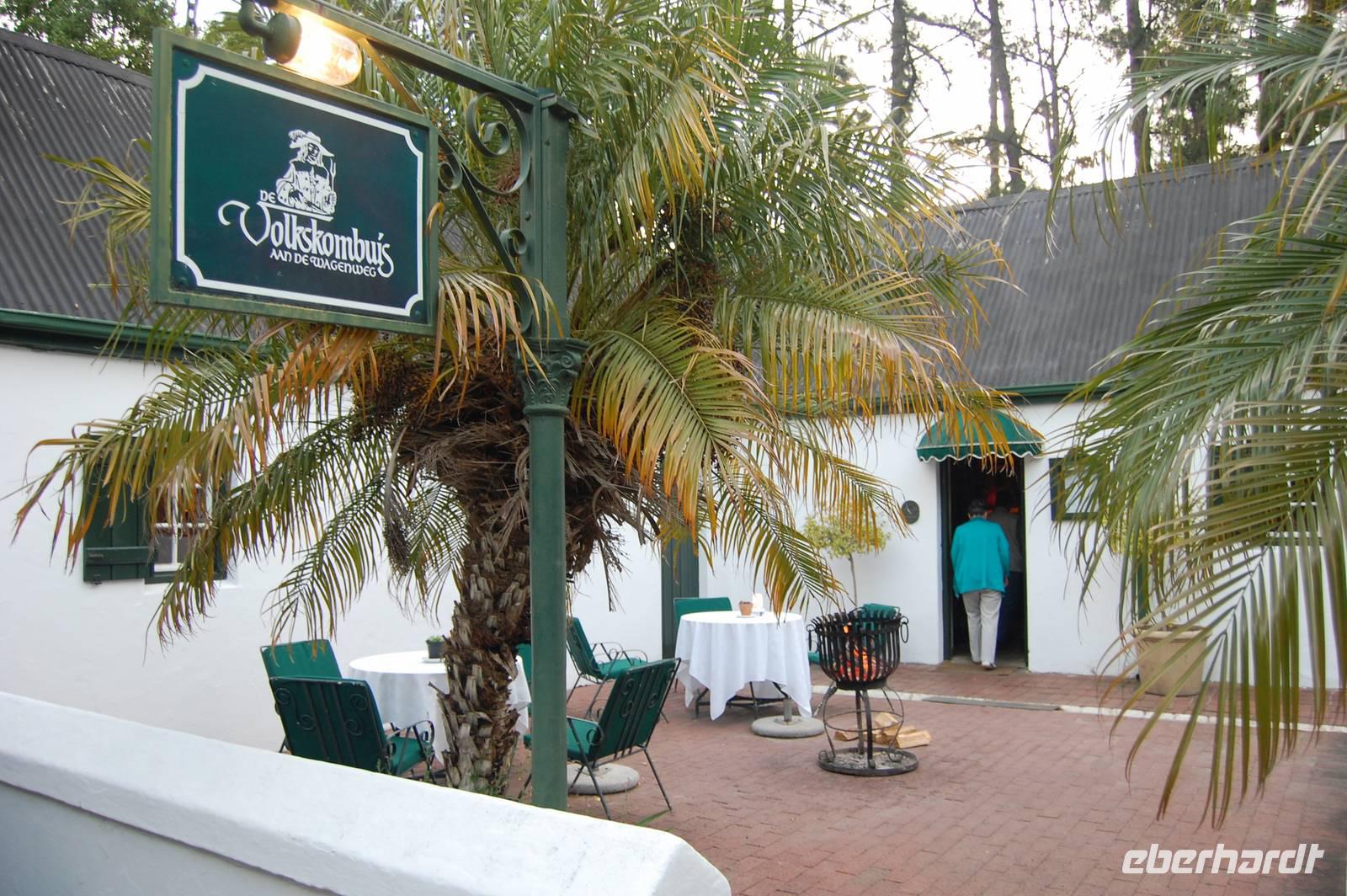Um 19:00 Uhr bringt uns Carsten nach Stellenbosch ins Restaurant „Volkskombuis" zum Abendessen. Uns bietet sich ein tolles Ambiente in und um das Haus, welches im kapholländischen Stil gebaut wurde.