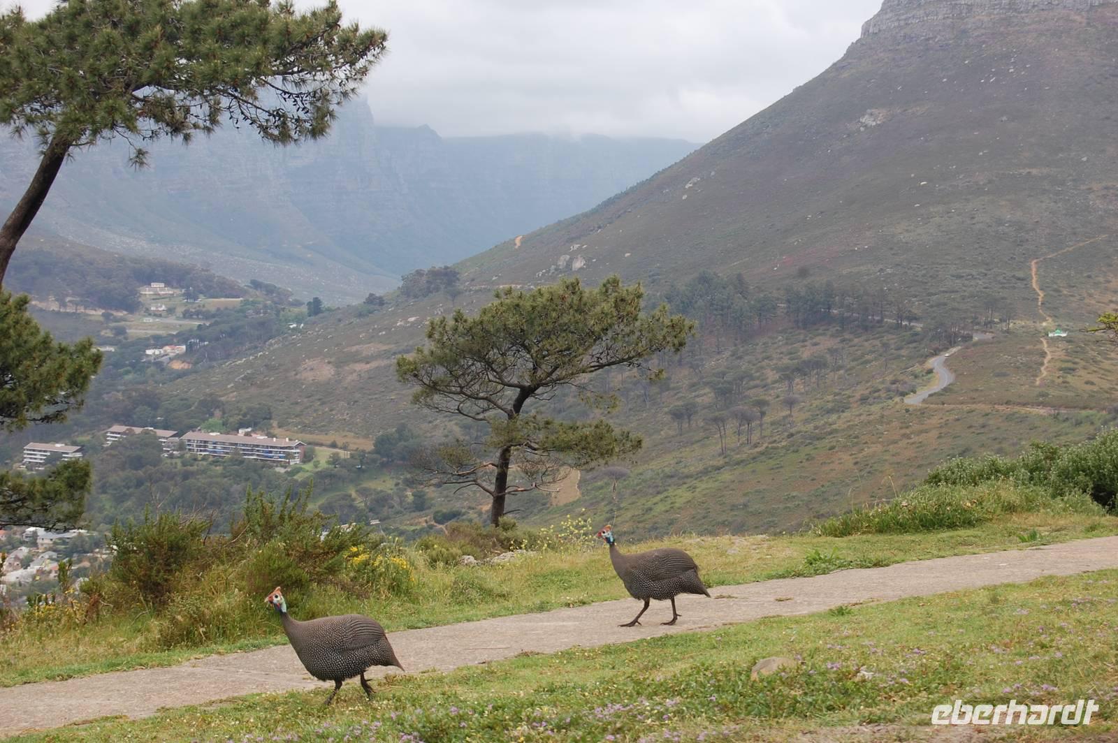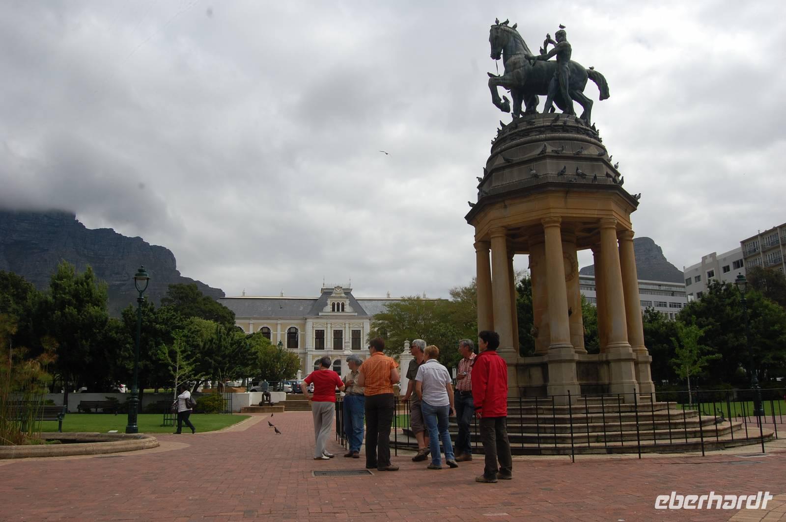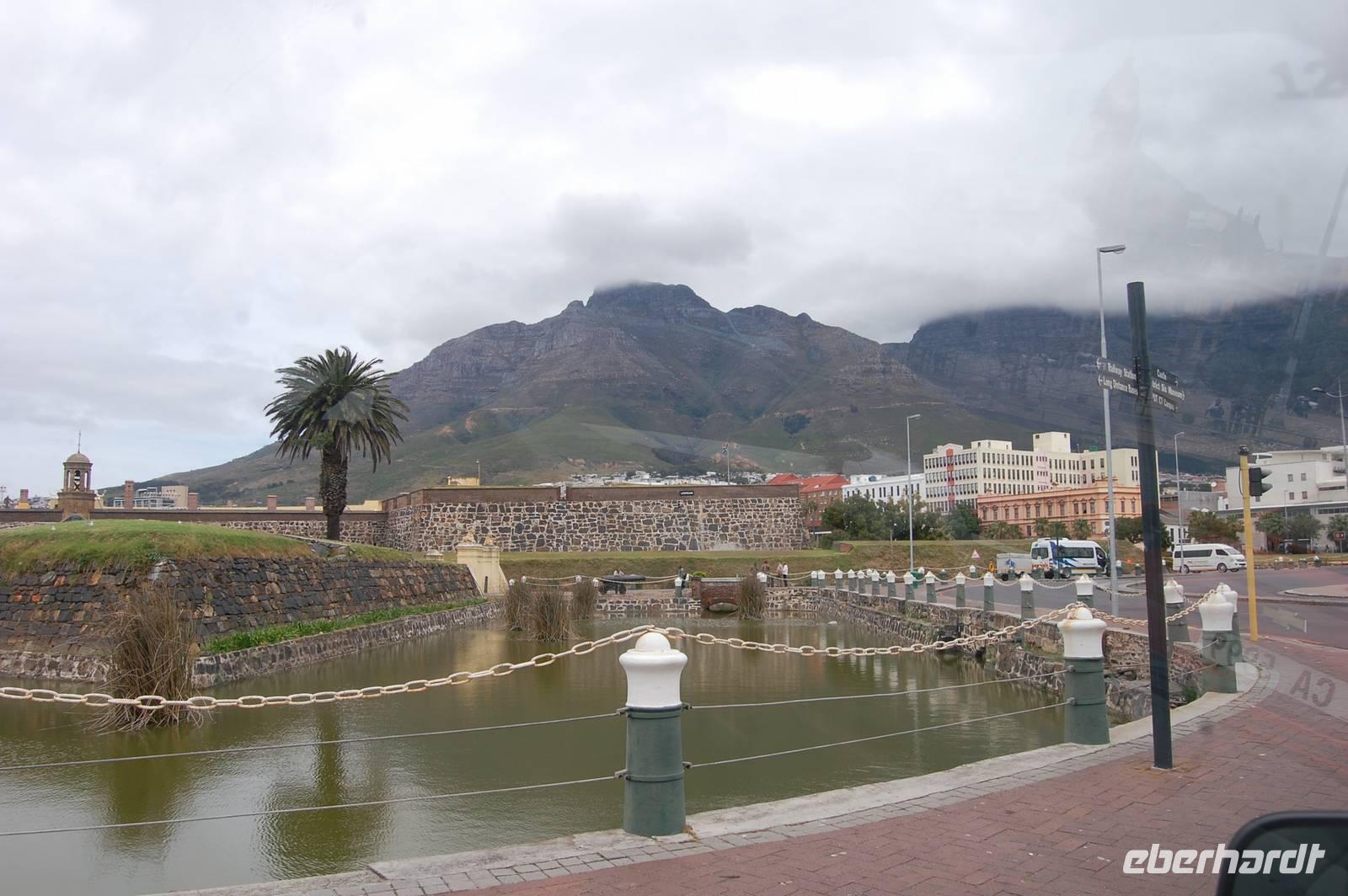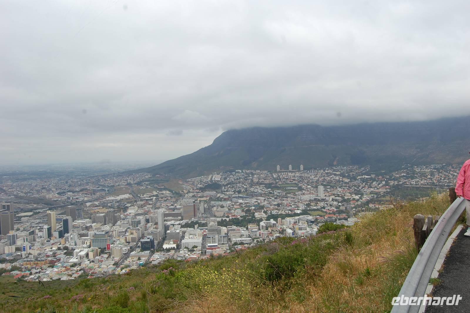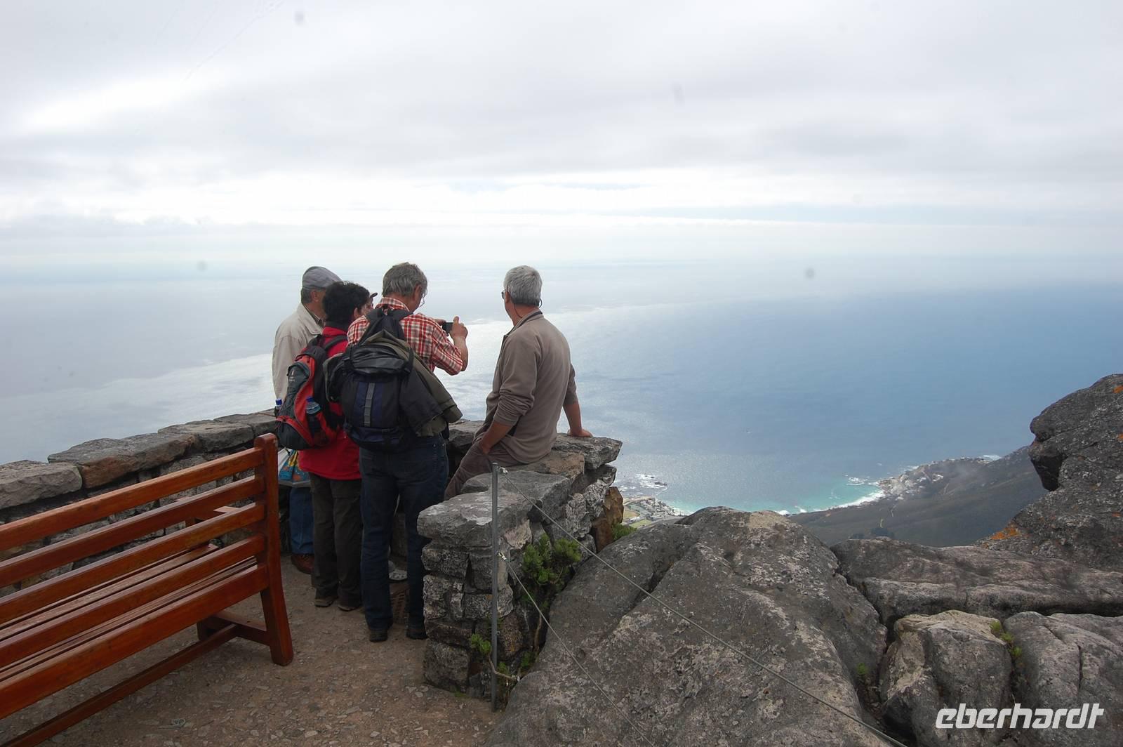Nach etwas persönlicher Freizeit starten wir um 11.30 Uhr, um gerade rechtzeitig um 12.00 Uhr den Signal-Berg zu erreichen, wo täglich um diese Zeit ein Kanonenschuss abgefeuert wird. Dieser Schuss diente früher den Seefahrern, deren Schiffe im Hafen ankerten, um die Chronometer zu stellen. Auf dem Signal-Hill erwartet uns ein kleines Sektbufett, welches der hiesige Reiseveranstalter als kleine Überraschung für unsere Gruppe organisiert hatte. Zum Sekt gibt es „Biltong" (Trockenfleisch) vom Strauß und Rind, sowie Nüsse und Trockenfrüchte. Wir genießen die tolle Aussicht, die in der Höhe von ca. 500 m noch gegeben ist. Weiter höher, z.B. auf dem Tafelberg verdecken Wolken die Sicht, die immer wieder neu aus süd-östlicher Richtung herangetragen werden. Nun brechen wir zum Hotel auf und erreichen das „Garden Court de Waal-Hotel" um 13.00 Uhr. Da unsere Zimmer noch nicht bereitstehen, stellen wir nur das Gepäck ein und beginnen unmittelbar unsere Stadtrundfahrt mit Ausstiegen am Paradeplatz und dem „Company´s Garden". Dann haben wir großes Glück, denn Carsten macht uns darauf aufmerksam, dass der Tafelberg frei ist. Wir sputen uns, um möglichst schnell zur Talstation der Kabinenbahn zu gelangen, denn es werden viele Touristen versuchen, die kurze, nebelfreie Zeit zu nutzen, um den Tafelberg zu besuchen. Um 15.00 Uhr sind wir schließlich in der Gondel, die sich bei der Auffahrt einmal um die eigene Achse dreht. Auf dem Tafelberg angekommen, genießen wir die gute Sicht auf die sonnenerhellte Stadt, den Atlantik, Robben-Island, das Hafengelände mit der Waterfront und den vielen Wohngebieten Kapstadts. Schon nach einer Stunde zieht sich der Tafelberg sein Tischtuch wieder über, so dass wir bei der Abfahrt durch Nebelwände fahren. Nun fahren wir zum Hotel, um unsere Zimmer zu beziehen. Wir bestellen uns ein Taxi für 18.45 Uhr, das uns zum Restaurant „Arnold´s" bringen wird. Das Essen ist sehr schmackhaft und gut. Nach einer abschließenden Runde „Springbock" bringt uns das gleiche Taxi um 21.30 Uhr ins Hotel zurück.