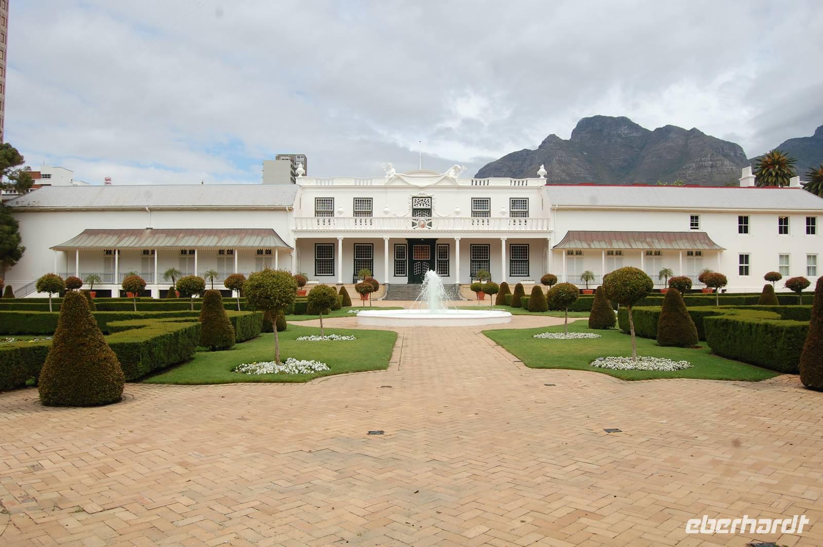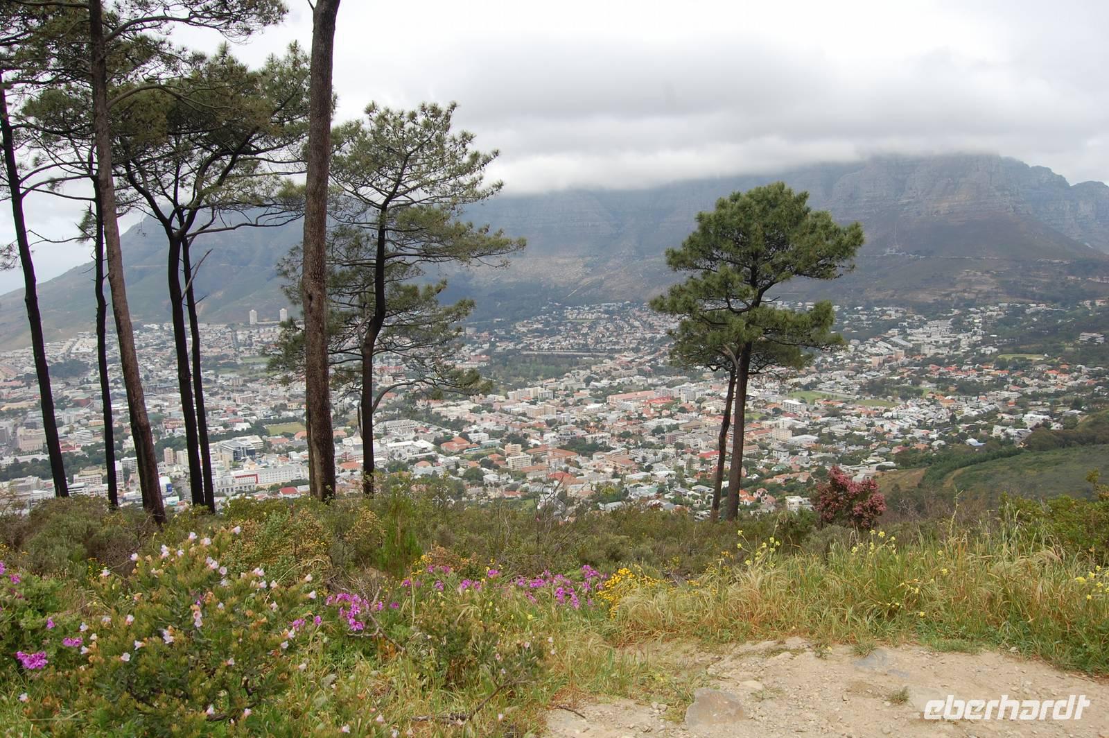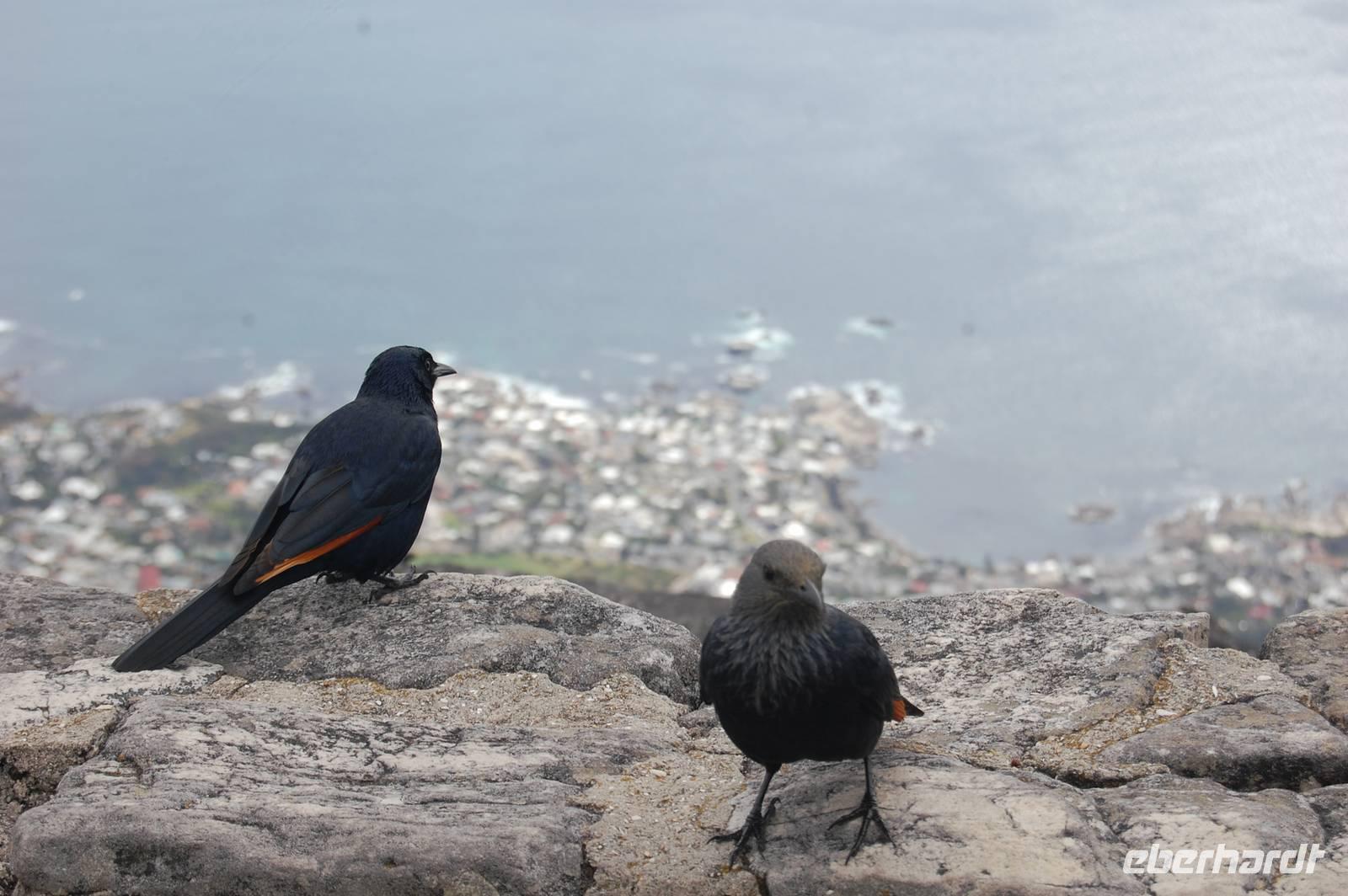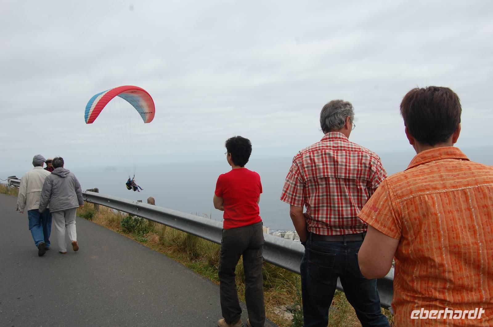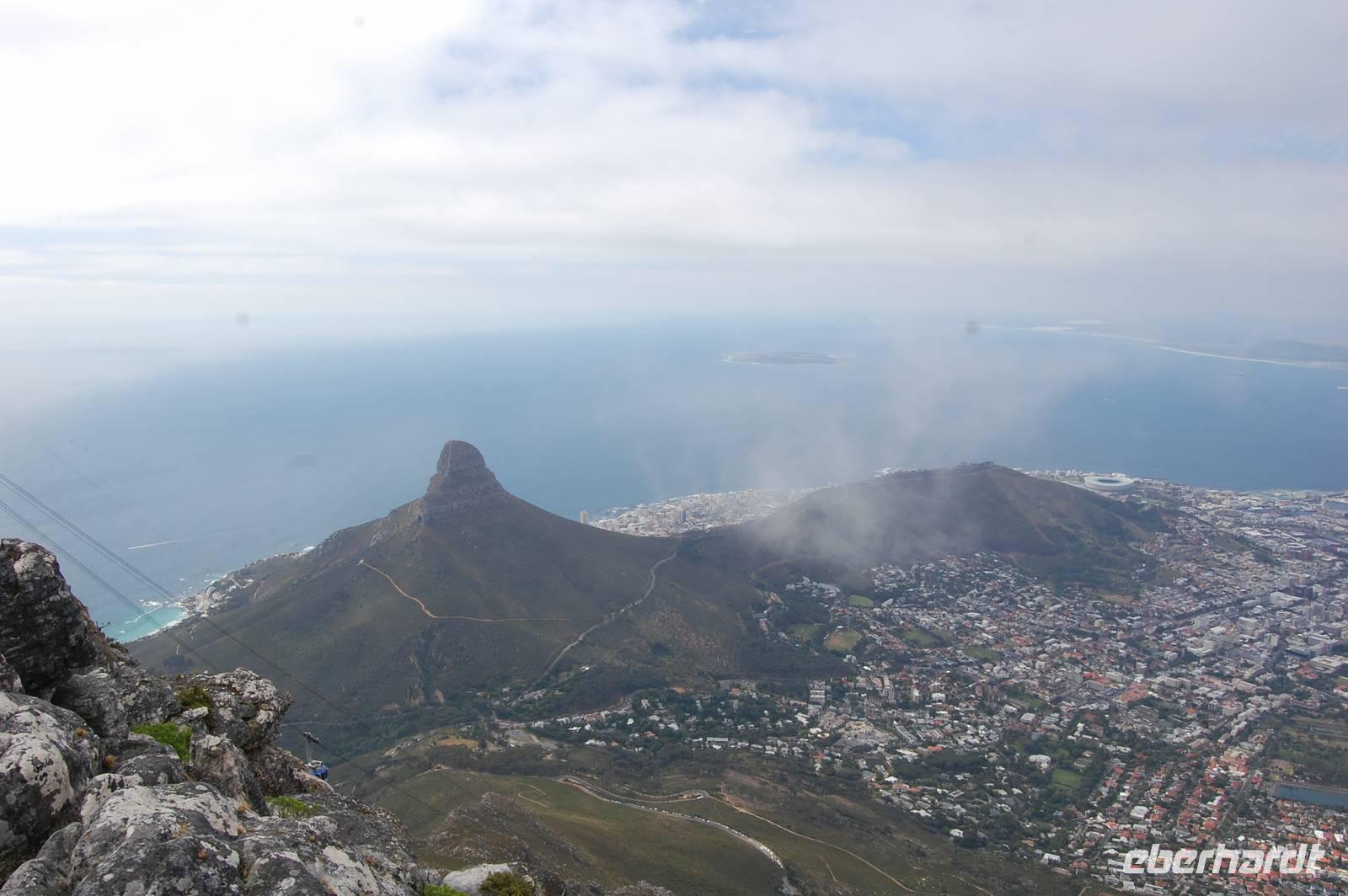 Nach etwas persönlicher Freizeit starten wir um 11.30 Uhr, um gerade rechtzeitig um 12.00 Uhr den Signal-Berg zu erreichen, wo täglich um diese Zeit ein Kanonenschuss abgefeuert wird. Dieser Schuss diente früher den Seefahrern, deren Schiffe im Hafen ankerten, um die Chronometer zu stellen. Auf dem Signal-Hill erwartet uns ein kleines Sektbufett, welches der hiesige Reiseveranstalter als kleine Überraschung für unsere Gruppe organisiert hatte. Zum Sekt gibt es „Biltong" (Trockenfleisch) vom Strauß und Rind, sowie Nüsse und Trockenfrüchte. Wir genießen die tolle Aussicht, die in der Höhe von ca. 500 m noch gegeben ist. Weiter höher, z.B. auf dem Tafelberg verdecken Wolken die Sicht, die immer wieder neu aus süd-östlicher Richtung herangetragen werden. Nun brechen wir zum Hotel auf und erreichen das „Garden Court de Waal-Hotel" um 13.00 Uhr. Da unsere Zimmer noch nicht bereitstehen, stellen wir nur das Gepäck ein und beginnen unmittelbar unsere Stadtrundfahrt mit Ausstiegen am Paradeplatz und dem „Company´s Garden". Dann haben wir großes Glück, denn Carsten macht uns darauf aufmerksam, dass der Tafelberg frei ist. Wir sputen uns, um möglichst schnell zur Talstation der Kabinenbahn zu gelangen, denn es werden viele Touristen versuchen, die kurze, nebelfreie Zeit zu nutzen, um den Tafelberg zu besuchen. Um 15.00 Uhr sind wir schließlich in der Gondel, die sich bei der Auffahrt einmal um die eigene Achse dreht. Auf dem Tafelberg angekommen, genießen wir die gute Sicht auf die sonnenerhellte Stadt, den Atlantik, Robben-Island, das Hafengelände mit der Waterfront und den vielen Wohngebieten Kapstadts. Schon nach einer Stunde zieht sich der Tafelberg sein Tischtuch wieder über, so dass wir bei der Abfahrt durch Nebelwände fahren. Nun fahren wir zum Hotel, um unsere Zimmer zu beziehen. Wir bestellen uns ein Taxi für 18.45 Uhr, das uns zum Restaurant „Arnold´s" bringen wird. Das Essen ist sehr schmackhaft und gut. Nach einer abschließenden Runde „Springbock" bringt uns das gleiche Taxi um 21.30 Uhr ins Hotel zurück.