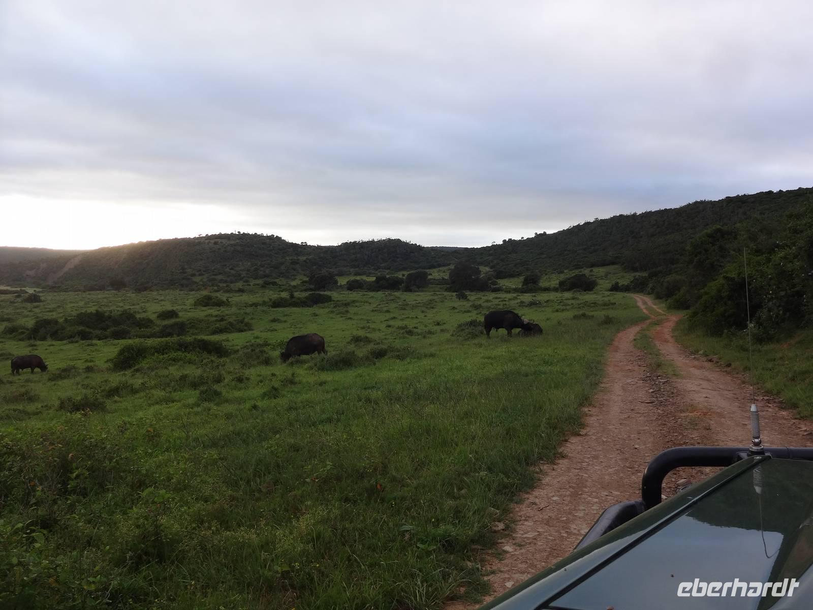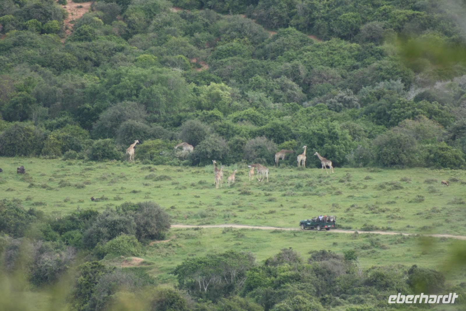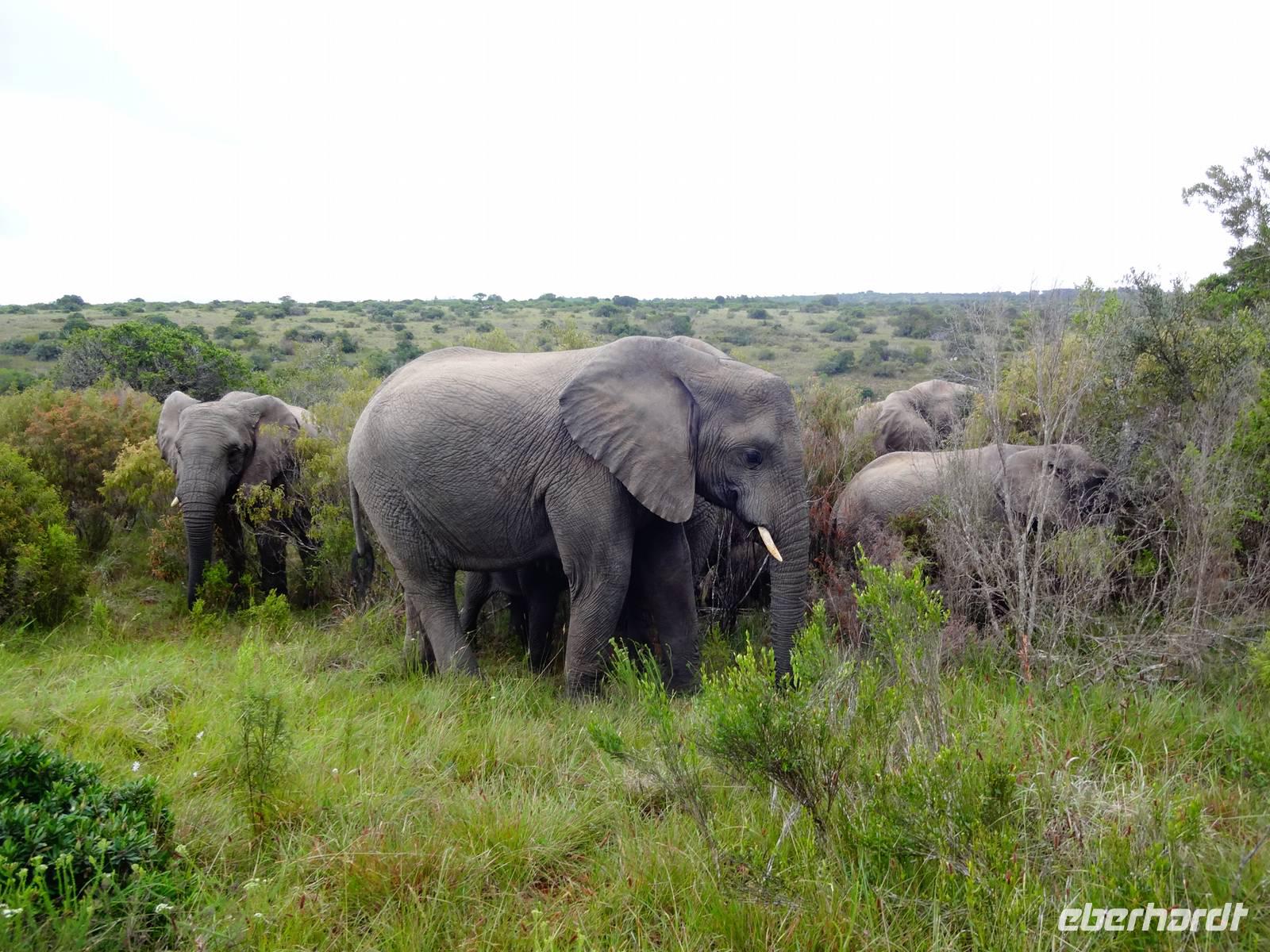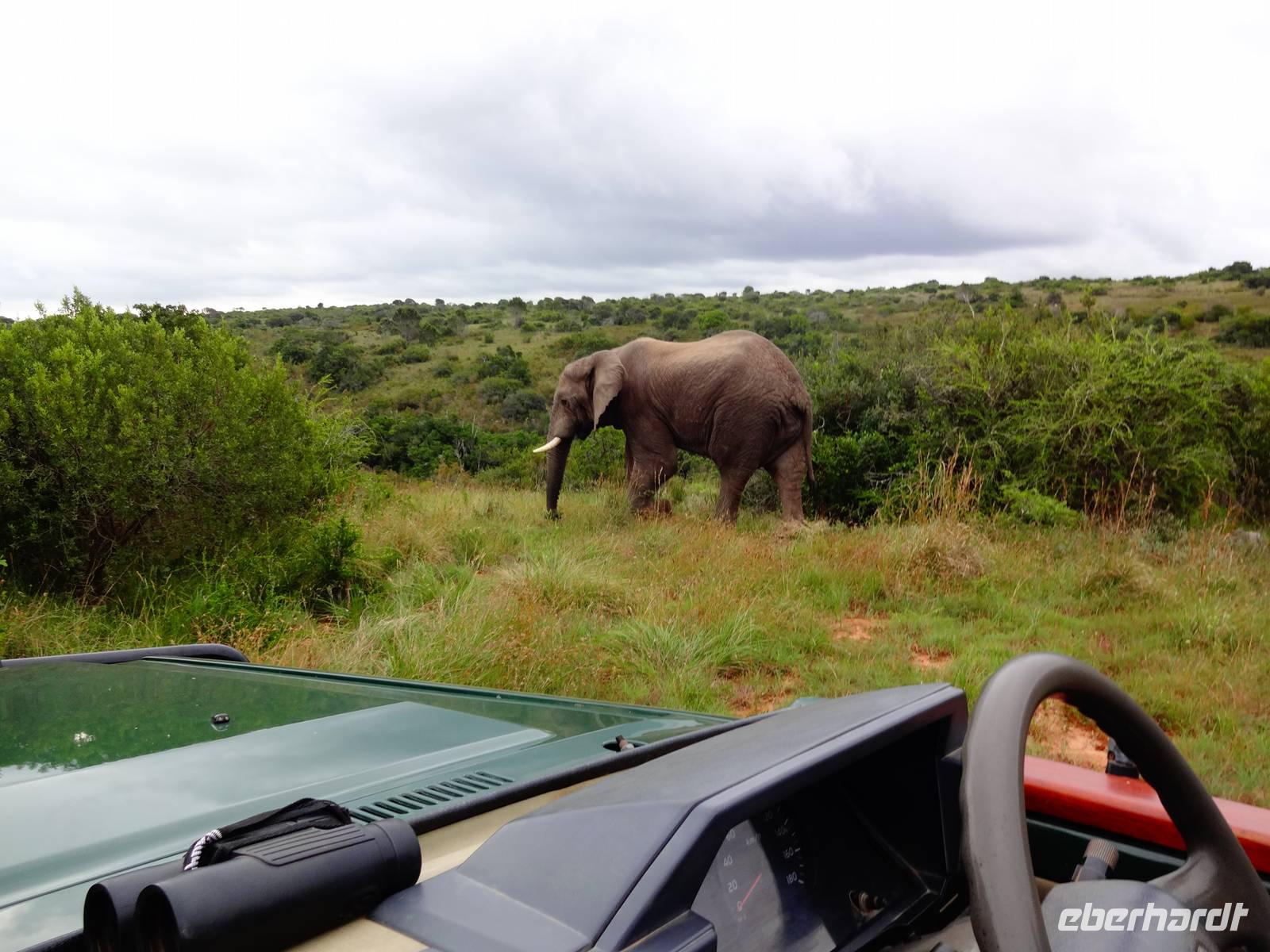 Gegen vier Uhr in der Nacht hieß es Abfahrt in Richtung Flughafen Durban. In der Dunkelheit fuhren wir durch das ruhige Tal, bevor wir im hellen die Autobahn gen Südosten erreichten und der Hafenstadt Durban am Indischen Ozean immer näher kamen. Nach der Verabschiedung des Reiseleiters durchliefen wir das immergleiche Sicherheitsprozedere am Flughafen und flogen mit einer kleinen Maschine nach Port Elizabeth. Hier wurden wir von unserem heutigen Fahrer Michael bereits erwartet und erreichten nach ungefähr 1,5h Fahrzeit das Kariega Game Reserve. Der für unsere Eberhardt-Gruppe zuständige Ranger Gladmann, dem Tossa-Stamm zugehörig, half uns mit der Verladung unserer Koffer und führte uns durch das Camp um einen ersten kleinen Eindruck zu bekommen. Nach dem Mittagessen ging es dann für uns auf die erste Pirschfahrt durch das 6.000 Hektar große Gebiet. Wir erhielten eine kurze Einweisung und dann ging es auch schon los in unserem Geländewagen mit 11 Sitzen, was für ein Spaß! Immer gespannt ging es mit offenen Augen durch das Reservat, man hoffte ja doch schon immer inständig die Big5 zu Gesicht zu bekommen. So ging es los mit einigen Huftieren und nach einer Weile war es dann soweit: ein paar hundert Meter entfernt sahen wir Elefanten durch die Wälder streifen. Nur wir hatten ein kleines Problem, wie kommen wir auf dem schnellsten Wege dort hin? Aber wozu hat man Ranger-Kollegen? Immer in Verbindung mit den anderen Jeeps kamen wir den Elefanten näher und bestaunten nach einer Weile die beeindruckenden Tiere ganz aus der Nähe. Was für ein tolles Erlebnis! Wir waren überaus zufrieden und ließen die Pirschfahrt mit einem Sundowner ausklingen, bevor es dann für uns zum wohlverdienten Abendessen ging.