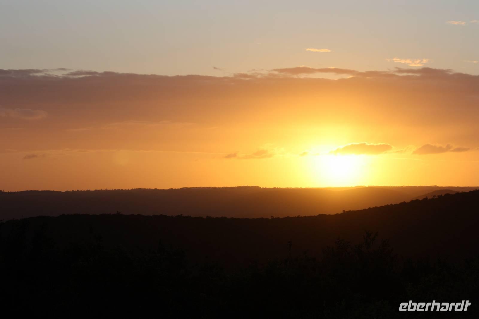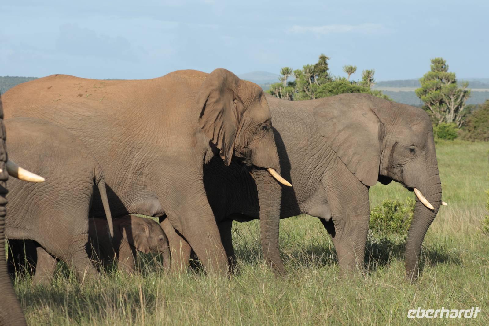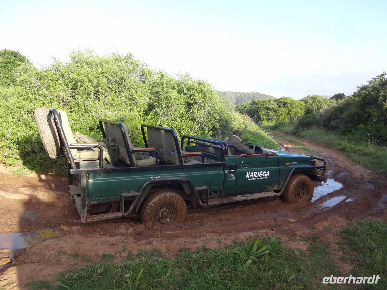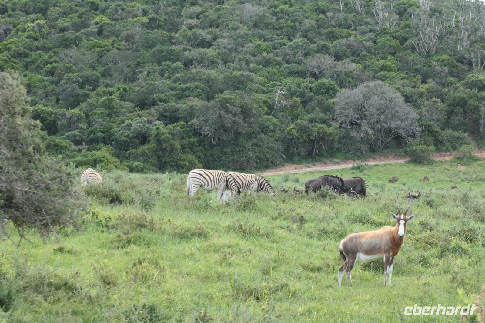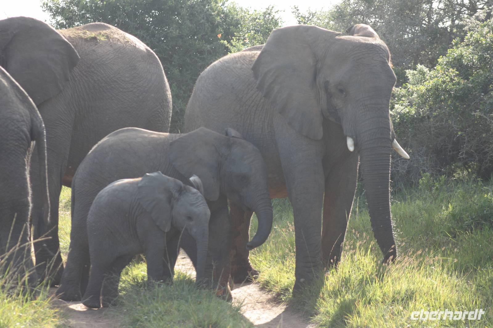 Gegen vier Uhr in der Nacht hieß es Abfahrt in Richtung Flughafen Durban. In der Dunkelheit fuhren wir durch das ruhige Tal, bevor wir im hellen die Autobahn gen Südosten erreichten und der Hafenstadt Durban am Indischen Ozean immer näher kamen. Nach der Verabschiedung des Reiseleiters durchliefen wir das immergleiche Sicherheitsprozedere am Flughafen und flogen mit einer kleinen Maschine nach Port Elizabeth. Hier wurden wir von unserem heutigen Fahrer Michael bereits erwartet und erreichten nach ungefähr 1,5h Fahrzeit das Kariega Game Reserve. Der für unsere Eberhardt-Gruppe zuständige Ranger Gladmann, dem Tossa-Stamm zugehörig, half uns mit der Verladung unserer Koffer und führte uns durch das Camp um einen ersten kleinen Eindruck zu bekommen. Nach dem Mittagessen ging es dann für uns auf die erste Pirschfahrt durch das 6.000 Hektar große Gebiet. Wir erhielten eine kurze Einweisung und dann ging es auch schon los in unserem Geländewagen mit 11 Sitzen, was für ein Spaß! Immer gespannt ging es mit offenen Augen durch das Reservat, man hoffte ja doch schon immer inständig die Big5 zu Gesicht zu bekommen. So ging es los mit einigen Huftieren und nach einer Weile war es dann soweit: ein paar hundert Meter entfernt sahen wir Elefanten durch die Wälder streifen. Nur wir hatten ein kleines Problem, wie kommen wir auf dem schnellsten Wege dort hin? Aber wozu hat man Ranger-Kollegen? Immer in Verbindung mit den anderen Jeeps kamen wir den Elefanten näher und bestaunten nach einer Weile die beeindruckenden Tiere ganz aus der Nähe. Was für ein tolles Erlebnis! Wir waren überaus zufrieden und ließen die Pirschfahrt mit einem Sundowner ausklingen, bevor es dann für uns zum wohlverdienten Abendessen ging.
