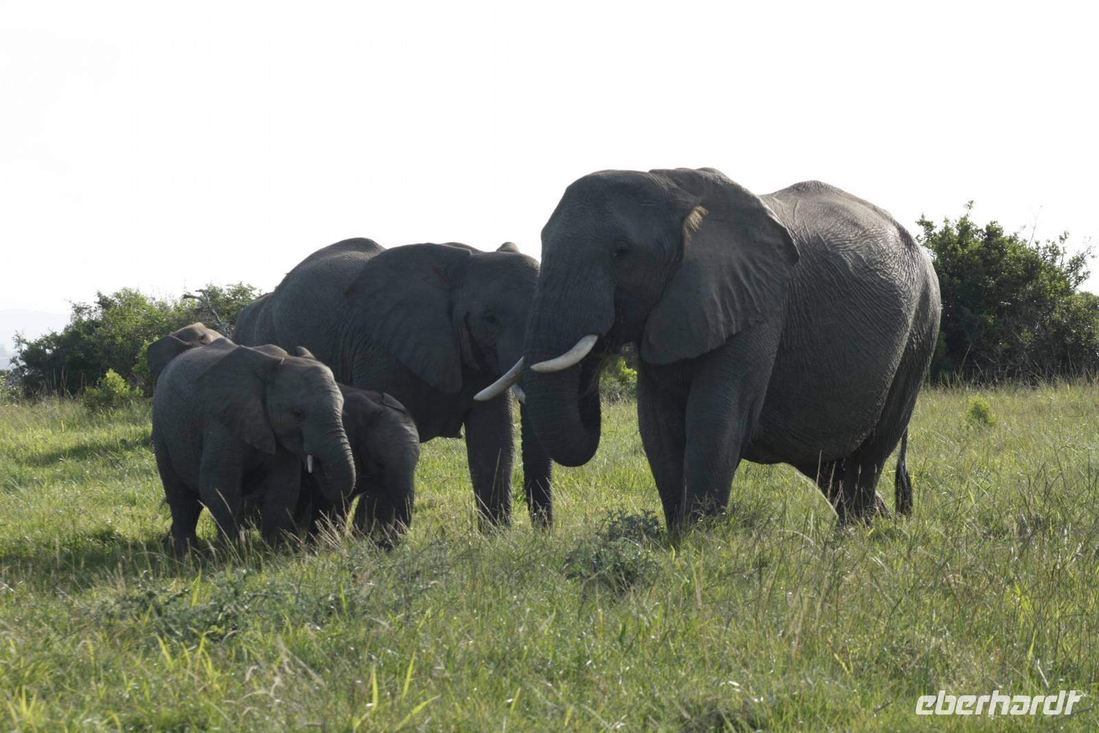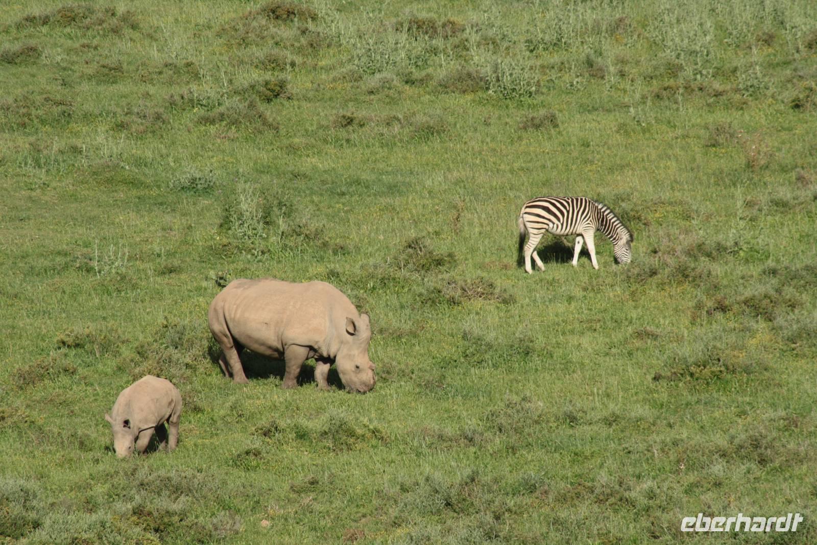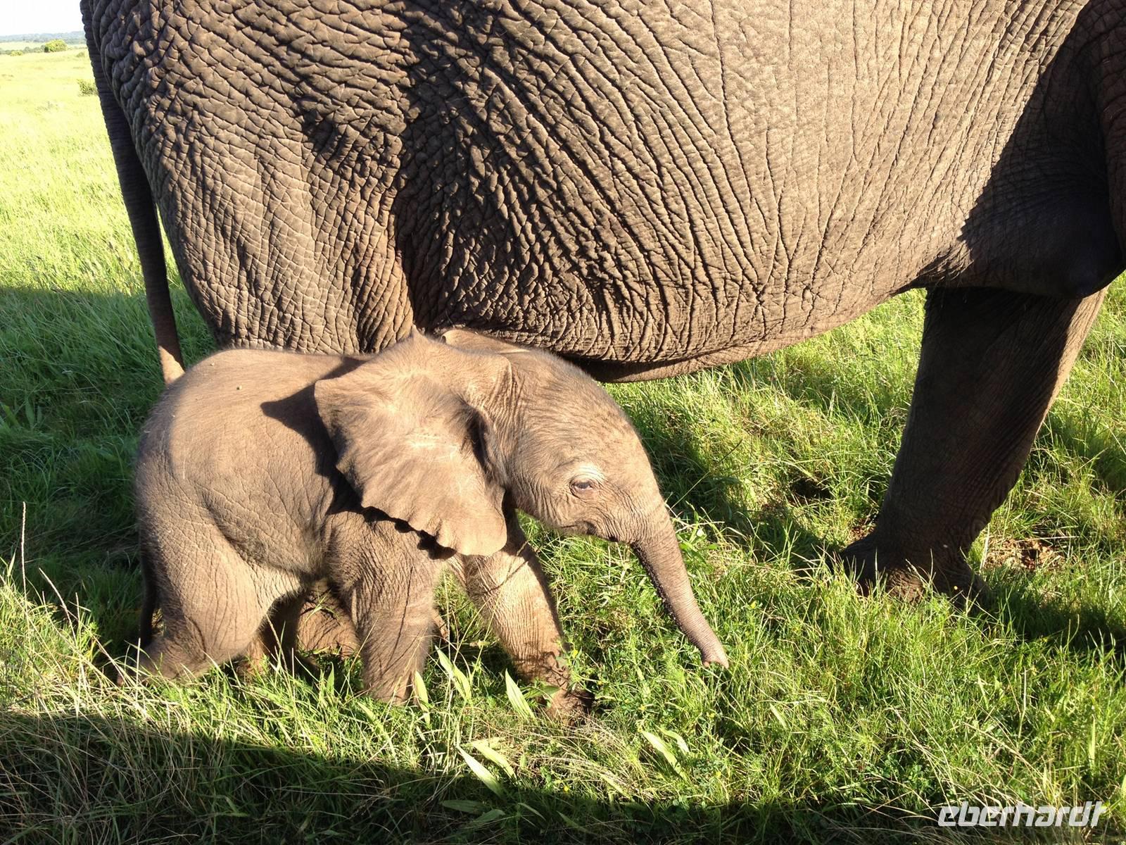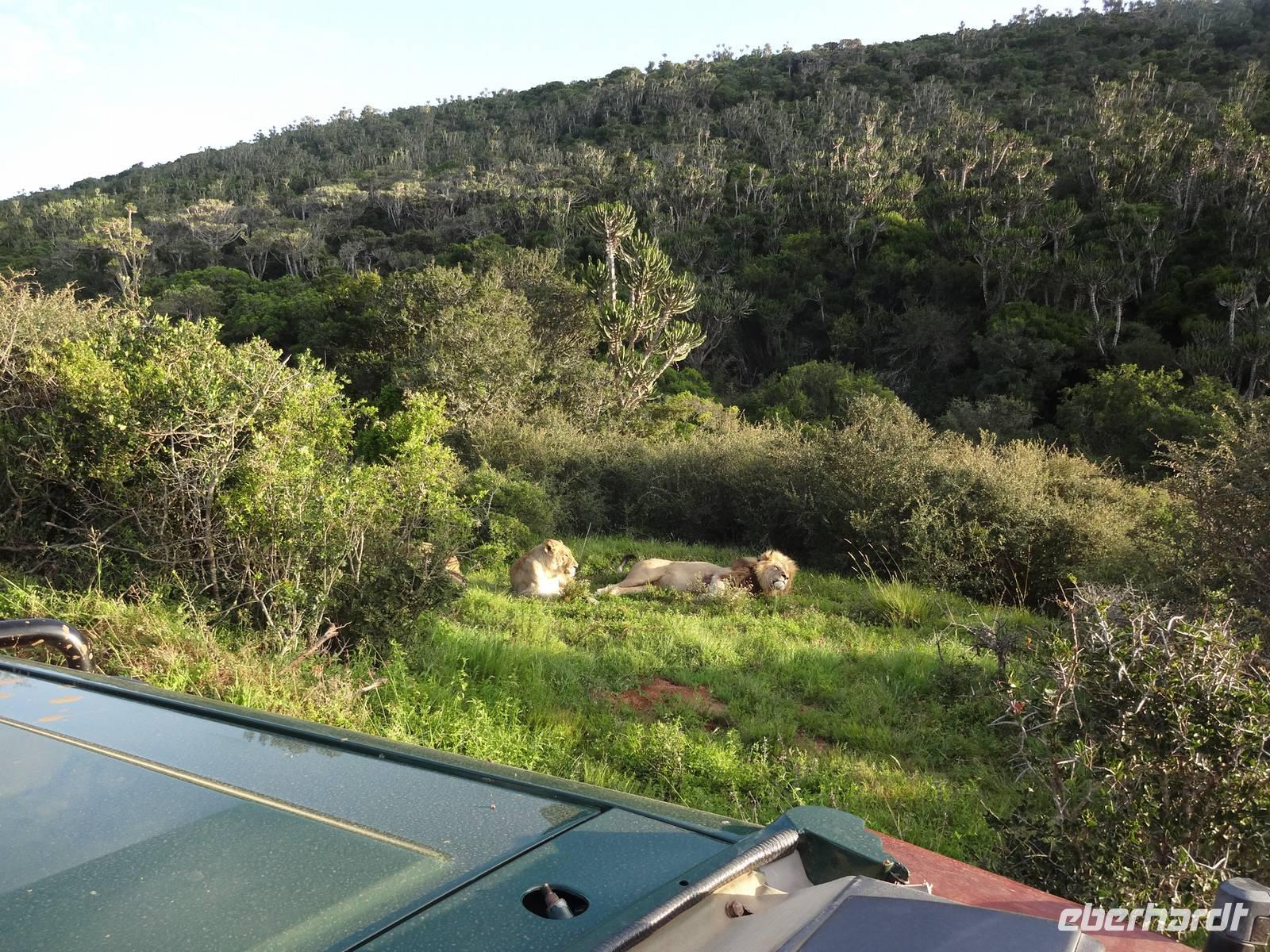 Gegen vier Uhr in der Nacht hieß es Abfahrt in Richtung Flughafen Durban. In der Dunkelheit fuhren wir durch das ruhige Tal, bevor wir im hellen die Autobahn gen Südosten erreichten und der Hafenstadt Durban am Indischen Ozean immer näher kamen. Nach der Verabschiedung des Reiseleiters durchliefen wir das immergleiche Sicherheitsprozedere am Flughafen und flogen mit einer kleinen Maschine nach Port Elizabeth. Hier wurden wir von unserem heutigen Fahrer Michael bereits erwartet und erreichten nach ungefähr 1,5h Fahrzeit das Kariega Game Reserve. Der für unsere Eberhardt-Gruppe zuständige Ranger Gladmann, dem Tossa-Stamm zugehörig, half uns mit der Verladung unserer Koffer und führte uns durch das Camp um einen ersten kleinen Eindruck zu bekommen. Nach dem Mittagessen ging es dann für uns auf die erste Pirschfahrt durch das 6.000 Hektar große Gebiet. Wir erhielten eine kurze Einweisung und dann ging es auch schon los in unserem Geländewagen mit 11 Sitzen, was für ein Spaß! Immer gespannt ging es mit offenen Augen durch das Reservat, man hoffte ja doch schon immer inständig die Big5 zu Gesicht zu bekommen. So ging es los mit einigen Huftieren und nach einer Weile war es dann soweit: ein paar hundert Meter entfernt sahen wir Elefanten durch die Wälder streifen. Nur wir hatten ein kleines Problem, wie kommen wir auf dem schnellsten Wege dort hin? Aber wozu hat man Ranger-Kollegen? Immer in Verbindung mit den anderen Jeeps kamen wir den Elefanten näher und bestaunten nach einer Weile die beeindruckenden Tiere ganz aus der Nähe. Was für ein tolles Erlebnis! Wir waren überaus zufrieden und ließen die Pirschfahrt mit einem Sundowner ausklingen, bevor es dann für uns zum wohlverdienten Abendessen ging.