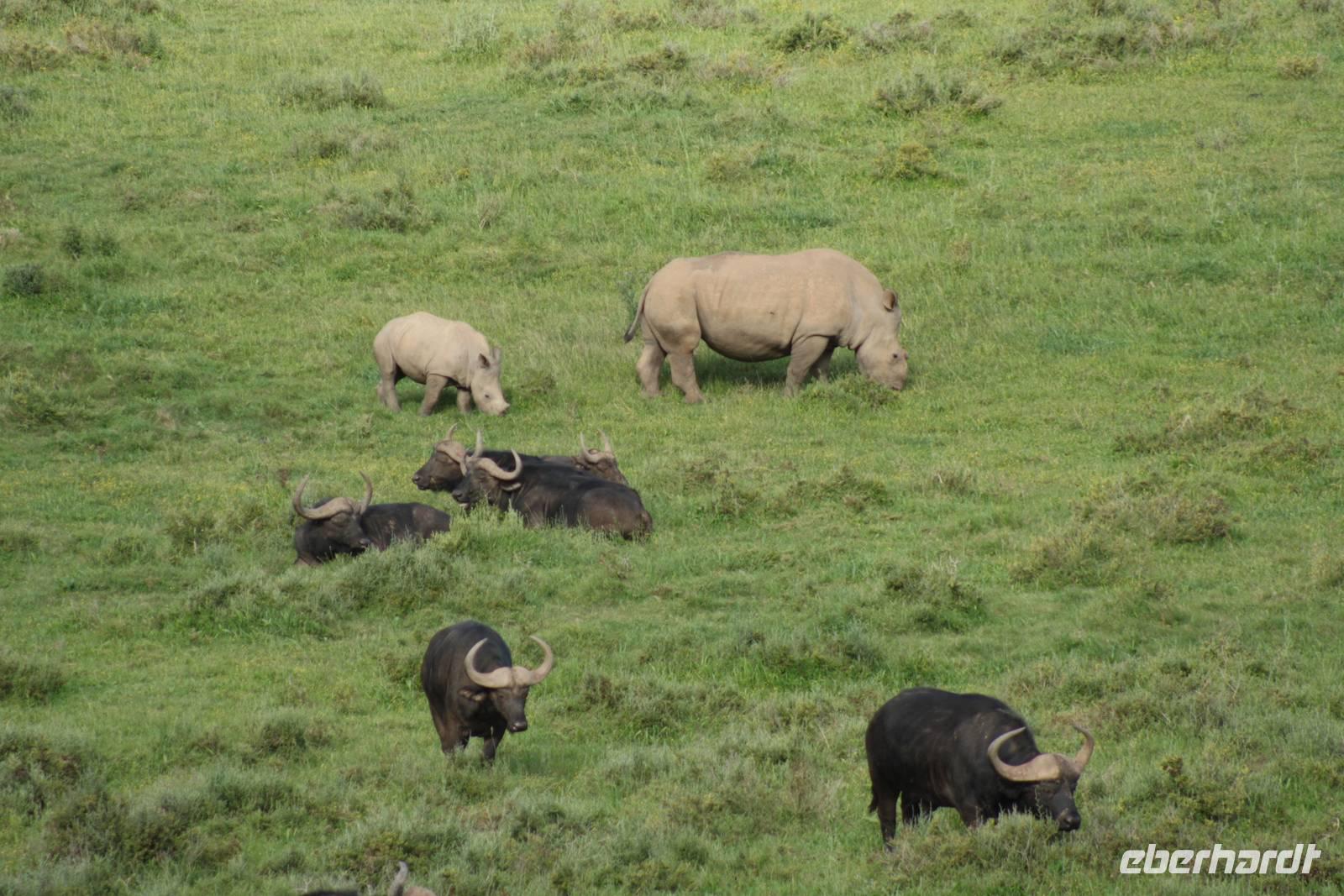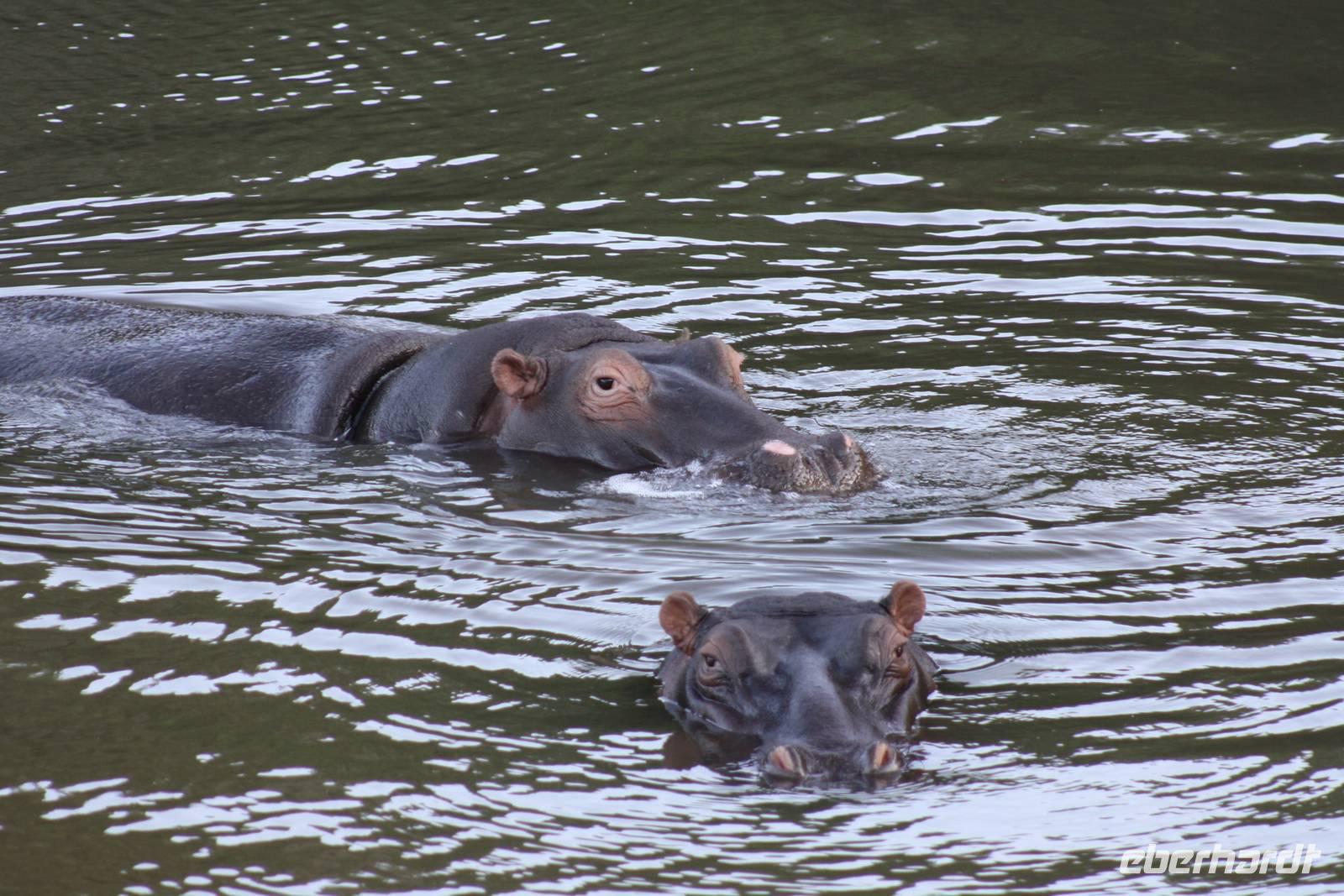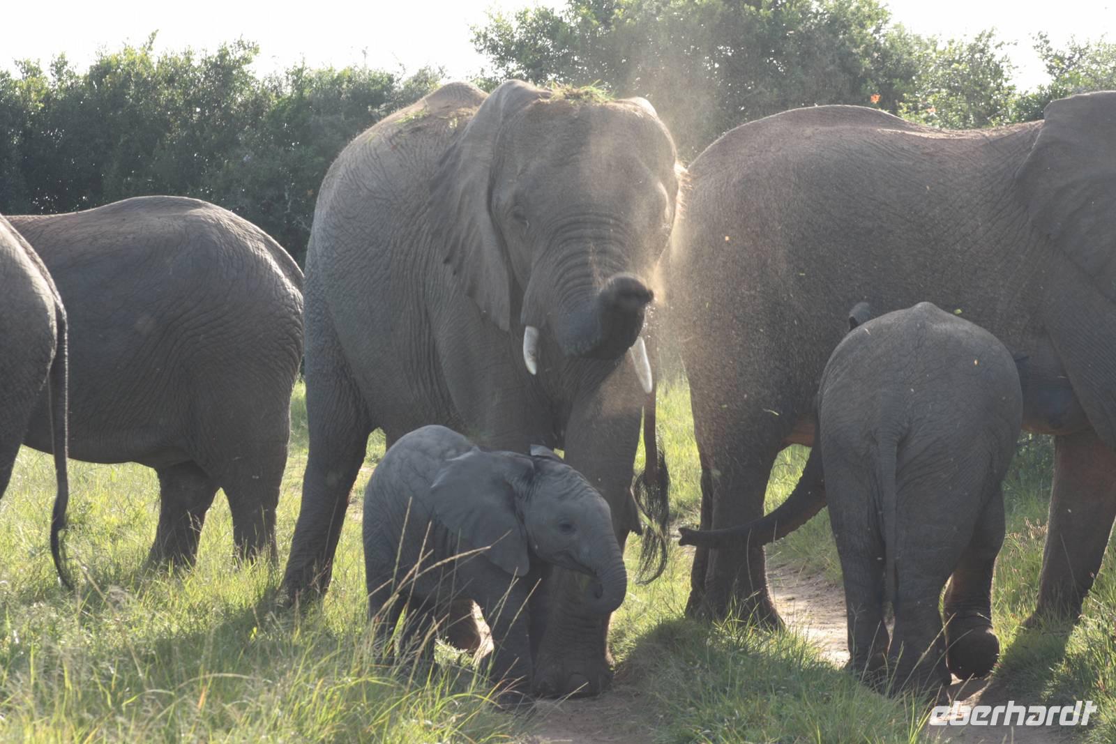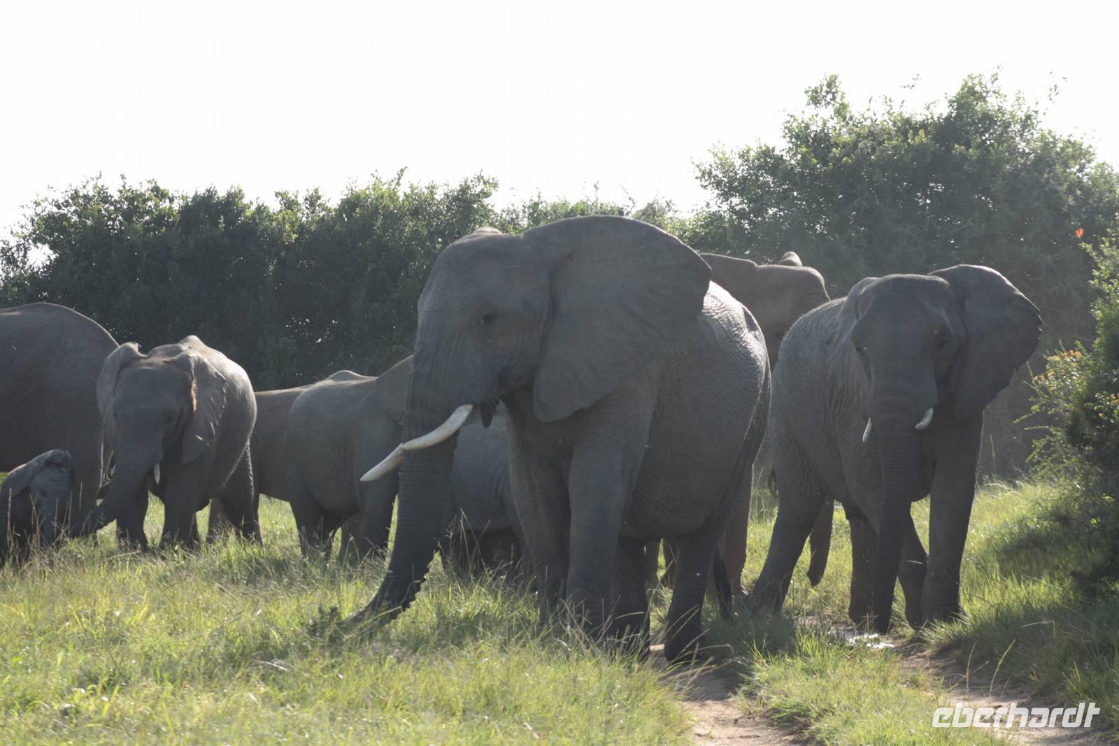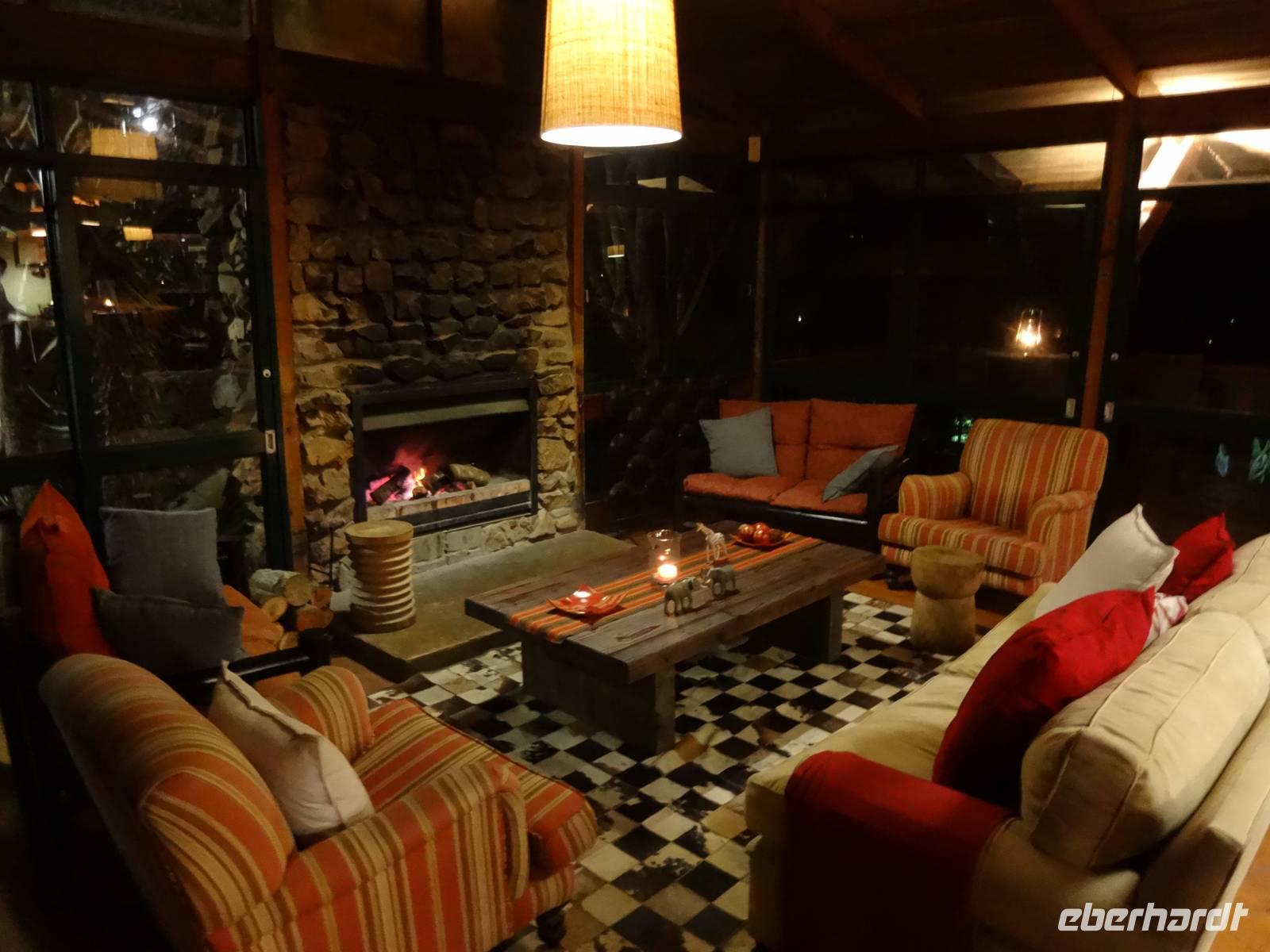 Gegen vier Uhr in der Nacht hieß es Abfahrt in Richtung Flughafen Durban. In der Dunkelheit fuhren wir durch das ruhige Tal, bevor wir im hellen die Autobahn gen Südosten erreichten und der Hafenstadt Durban am Indischen Ozean immer näher kamen. Nach der Verabschiedung des Reiseleiters durchliefen wir das immergleiche Sicherheitsprozedere am Flughafen und flogen mit einer kleinen Maschine nach Port Elizabeth. Hier wurden wir von unserem heutigen Fahrer Michael bereits erwartet und erreichten nach ungefähr 1,5h Fahrzeit das Kariega Game Reserve. Der für unsere Eberhardt-Gruppe zuständige Ranger Gladmann, dem Tossa-Stamm zugehörig, half uns mit der Verladung unserer Koffer und führte uns durch das Camp um einen ersten kleinen Eindruck zu bekommen. Nach dem Mittagessen ging es dann für uns auf die erste Pirschfahrt durch das 6.000 Hektar große Gebiet. Wir erhielten eine kurze Einweisung und dann ging es auch schon los in unserem Geländewagen mit 11 Sitzen, was für ein Spaß! Immer gespannt ging es mit offenen Augen durch das Reservat, man hoffte ja doch schon immer inständig die Big5 zu Gesicht zu bekommen. So ging es los mit einigen Huftieren und nach einer Weile war es dann soweit: ein paar hundert Meter entfernt sahen wir Elefanten durch die Wälder streifen. Nur wir hatten ein kleines Problem, wie kommen wir auf dem schnellsten Wege dort hin? Aber wozu hat man Ranger-Kollegen? Immer in Verbindung mit den anderen Jeeps kamen wir den Elefanten näher und bestaunten nach einer Weile die beeindruckenden Tiere ganz aus der Nähe. Was für ein tolles Erlebnis! Wir waren überaus zufrieden und ließen die Pirschfahrt mit einem Sundowner ausklingen, bevor es dann für uns zum wohlverdienten Abendessen ging.