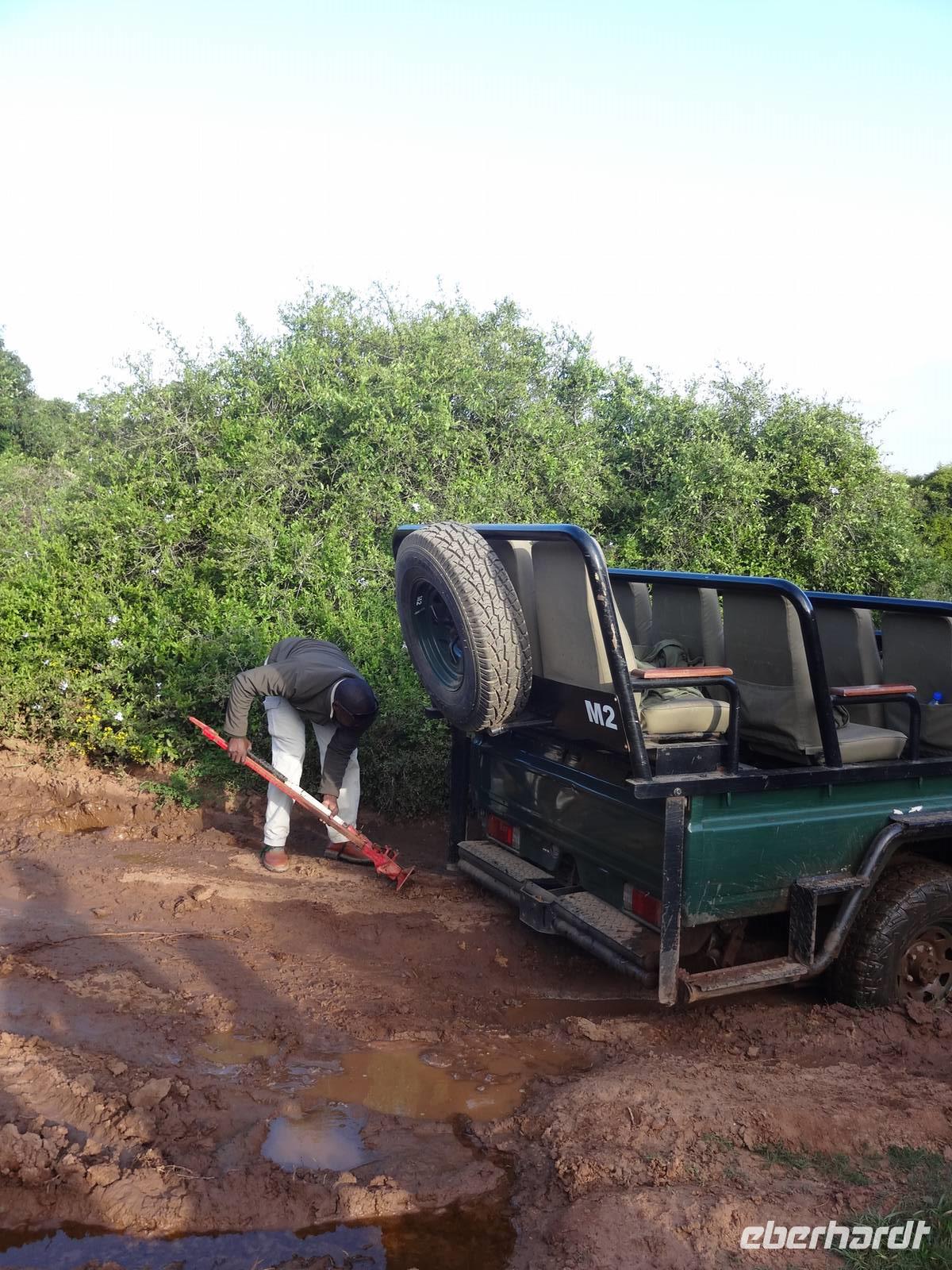 Heute ging es noch vor dem Frühstück los zu unserer ersten Pirschfahrt des Tages. Bei wechselhaftem Wetter machten wir uns kurz nach Sonnenaufgang auf den Weg die Tierwelt Südafrikas zu beobachten, immer mit der Hoffnung die Big5 zu sehen. Nach ein paar anfänglichen Kurzschauern, dem Sichten einer kleinen Büffelherde und eines Elefanten klarte das Wetter langsam auf. Als wir dann noch einen anderen Ranger trafen, der uns die Information gab in der Ferne ein paar Löwen gesehen zu haben wurde unsere Gruppe doch ein wenig aufgeregt. Wir fuhren das Gelände ab, aber von den Großkatzen keine Spur. Dafür sahen wir einen Verwandten im Gras herumschleichen, einen normalerweise nachtaktiven Wüstenluchs. Naja, mit den Büffeln und den Elefanten hatten wir ja schon zwei von fünf Big5 zu Augen bekommen und somit konnten wir unser kleines Frühstück in der Natur mit Café, Kakao und Muffins genießen, bevor es wieder zurück ins Camp ging. Dort unternahmen wir am Vormittag mit unserem Ranger Gladman einen kleinen Rundgang über den Blue Duikers Trail, wir liefen durch die Natur mit ihrer üppigen Vegetation und lernten einiges über die hier einheimischen Pflanzen. Einige der Gruppe probierten zum Beispiel den Saft der Aloe Pflanze, der den Einheimischen bei Magenproblemen zu helfen scheint, ACHTUNG: sehr bitter!! Danke Maria für das Bonbon! ? Des Weiteren sahen wir auch einen Tausendfüßler sich auf unserem Pfad fortbewegen und waren so fasziniert, dass wir so viel Zeit verbrachten Ihn zu beobachten, wir hätten glatt auch die Beine zählen können. Zurück im Camp genossen wir ein wenig Freizeit und das leckere Mittagessen mit kulinarischen Köstlichkeiten bevor es zu nächsten Pirschfahrt ging. Vom Balkon unseres Chalets beobachteten wir eine Herde Giraffen am Waldesrand, die sich genüsslich die Zeit mit Fressen vertrieb, dies war auch unser erster Stopp bei unserer Rundfahrt und wir konnten schöne Fotos schießen von Giraffen, aus dem Wald ragenden Giraffenhälsen und den Hinterteilen von Giraffen ohne Hälse, da diese auf der Suche nach Essbarem im Wald verschwanden, tolle Aufnahmen. Weiter ging es zu unserer schon bekannten großen Wiesenfläche mit grasenden Huftieren und wir bekamen Nummer drei von fünf zu sehen, denn es mischten sich ein paar Nashörner unter die anderen Tiere und so verweilten wir eine Weile und beobachteten vor allem das Muttertier mit ihrem Nachwuchs. Weiter ging es durch das Reservat und wir trafen auf eine große Elefantenherde mit ungefähr 15 Tieren, darunter auch ein oder zwei kleine Elefanten und ein kleiner süßer Babyelefant, der laut unserem Ranger eine Woche alt gewesen ist. Und wir bekamen das volle Programm geboten, nach der anfänglichen ungestörten Graserei nahmen die Elefanten eine Schutzposition ein und kamen in der Gruppe zusammen um den kleinen Elefanten zu schützen, es wurde mit den Füßen gestampft und trompetet bis sich nach einer Weile die Situation wieder beruhigte und die Elefantenherde wieder zum Fressen überging. Ein tolles Erlebnis das Verhalten der frei lebenden Tiere aus nächster Nähe zu beobachten, auch wenn einem durch die schiere Größe dieser riesigen Tiere eventuell ein bisschen mulmig gewesen ist. Weiter ging die Fahrt und ein weiteres Highlight wartete auf uns, denn wir blieben mit unserem Jeep in einem großen Wasser- und Schlammloch stecken und konnten uns nicht mehr mit unserer eigenen Kraft befreien. Glücklicherweise kamen noch zwei andere Jeeps vorbei, die sich aber anfänglich nur über uns lustig machten. Die Gruppe stieg aus und beobachtete den vergeblichen Rettungsversuch Gladmans mit einem Wagenheber den Geländewagen zu befreien, denn keiner der drei Jeeps hatte ein Abschleppseil mit, typisch afrikanisch! Letztendlich kam ein vierter Jeep, sogar mit Abschleppseil und befreite uns, sodass wir unsere Pirschfahrt mit dem durch Schlamm zur neuen Farbe gekommenen Fahrzeug fortsetzen konnten. Gegen Ende der Tour bekamen wir dann noch Nummer vier von fünf zu sehen, am Wegesrand ganz entspannt vor sich her schlummernd und die letzten Sonnenstrahlen des Tages genießend beobachteten wir den König der Tiere, drei im Gras liegende Löwen. Der Männliche sah den herannahenden Jeep und beschloss, dass dieser keine Gefahr für Ihn darstellt und somit drehte er sich mit dem Rücken zu uns und setzte sein Nachmittagsschläfchen im Beisein seiner beiden Löwinnen ungestört fort. Wir hatten alle Zeit der Welt die majestätischen Tiere zu betrachten und genossen einfach den Augenblick. Bei einem Sundowner, weit entfernt von den Löwen, genossen wir den wunderschönen Sonnenuntergang und machten uns durch die Dunkelheit auf den Weg zurück zum Camp, wo wir nach einem abenteuerlichen Tag den Abend ausklingen ließen, eine schöne Gesangsaufführung der Angestellten bestaunten und unsere neue Reiseleiterin Ingrid für die nächsten Tage begrüßten.
