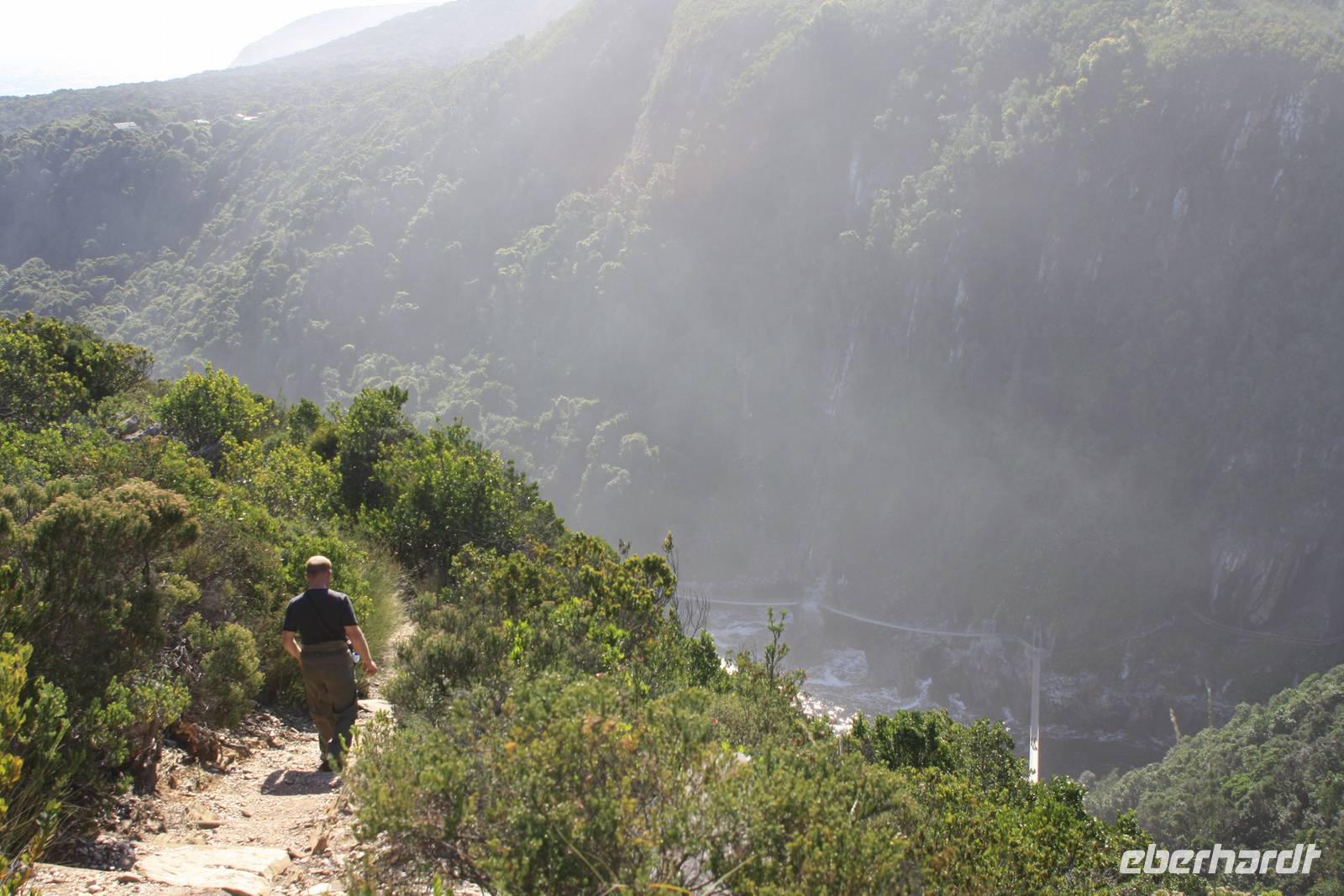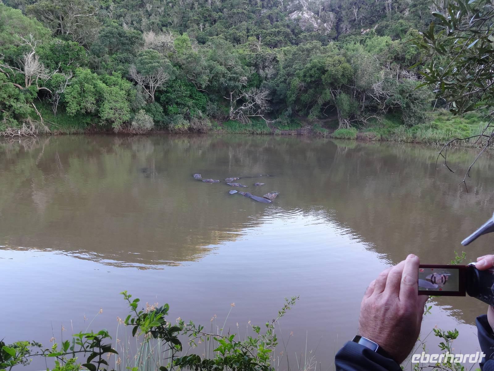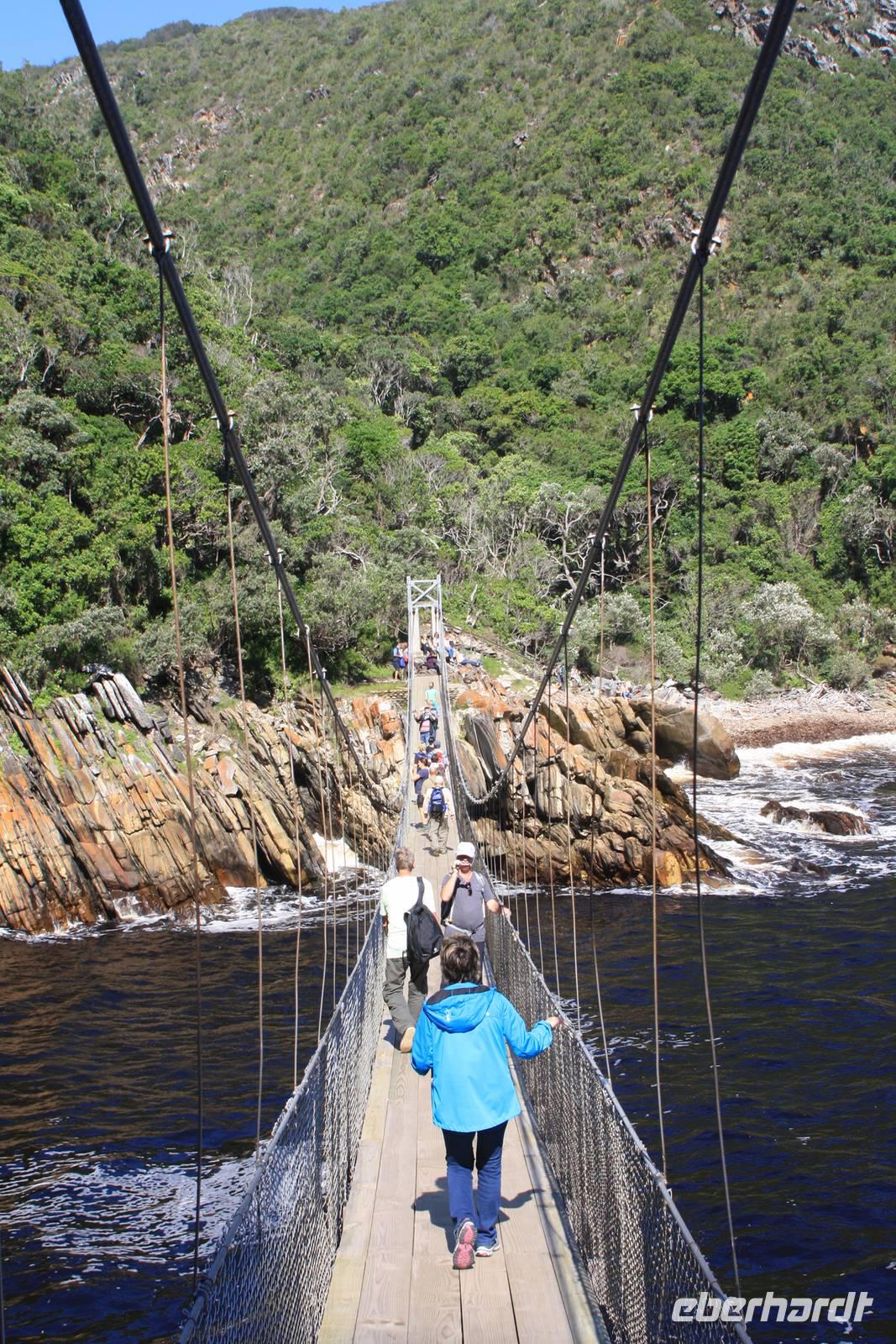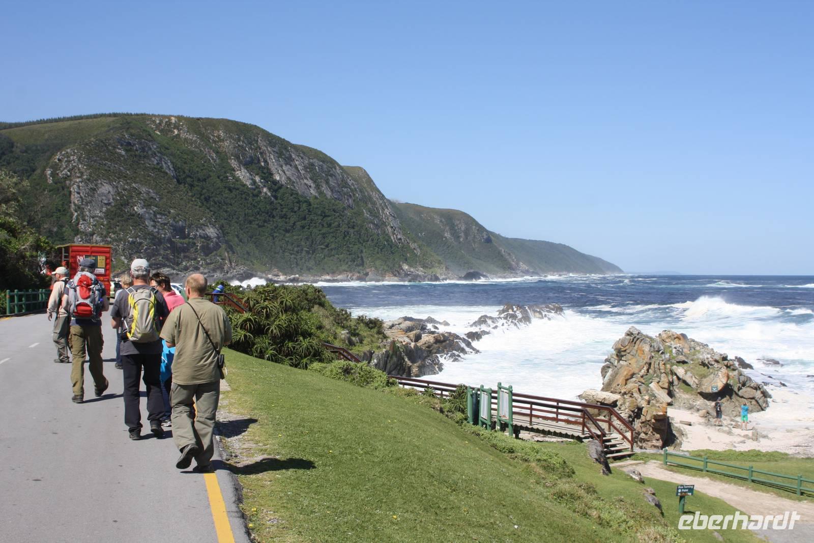 Um 5.30 Uhr startete unsere letzte Pirschfahrt im Morgengrauen und bei relativ kühlen Temperaturen, aber wir waren gut vorbereitet, packten uns warm ein und unser Ranger hatte wie immer seine Wolldecken mit im Jeep. Wir bekamen die „üblich Verdächtigen" Tiere zu sehen wie Zebras, Gnus, Antilopen, Springböcke, Giraffen und machten uns heute auf die Suche nach den Flusspferde. Am ersten und zweiten Wasserloch wurden wir aber leider durch gähnende Leere enttäuscht, doch ein ins Dickicht verschwindender Flusspferdbulle brachte uns Hoffnung. Und somit trafen wir an einem etwas größeren See auf eine Herde Flusspferde. Nachdem unser Ranger die Lage gecheckt hatte stiegen wir aus dem Jeep aus und standen Auge in Auge mit den imposanten Tieren, bei denen aber zum größten Teil nur Augen, Ohren und Nasen aus dem Wasser ragten. Nach anfänglich kleiner Aufregung beruhigte sich die Herde und genoss weiter ihr Bad im kühlen Nass. Bei uns stand dann auch schon das kleine Frühstück auf einem in der Sonne liegenden Hügel statt und wir genossen die letzten Stunden an diesem wunderschönen Ort, bis ein Gnu-Bulle sich in seinem Stolz verletzt fühlte, da wir uns in seinem markierten Revier befanden. Doch nach kurzer Begutachtung unserer Gruppe entschied er sich lieber seinen Konkurrenten über die Wiese zu jagen und unsere Gruppe in Ruhe zu lassen. Für unsere Gruppe ging es dann nach dem Frühstück weiter zur nächsten Station in unserem Reiseprogramm, es ging die Küste entlang nach Westen auf der weltberühmten Gartenroute. Auf dem Weg hatten wir zwei Stopps eingeplant, und der erste führte uns zu einem riesigen, jahrhundertealten Gelbholzbaum. Hier hatten wir die Möglichkeit uns die Beine ein wenig zu vertreten und die Natur des Tsitsikamma Nationalparks zu genießen, bevor es zu unserer kleinen Wanderung an die Küste ging. Wir unternahmen eine kleine Wanderung zur Mündung des Storms Rivers in den Ozean und genossen das gute Wetter. Über eine Hängebrücke den Fluss querend beschloss der Großteil der Reisegruppe umzukehren und das kleine Picknick an unserem Startpunkt zu genießen, doch Joscha entdeckte ein Wegschild mit der Aufschrift „Aussichtspunkt" und konnte Volker und Stefan natürlich von der kleinen Zusatzwanderung ohne Probleme überzeugen. Der Weg führte uns einen steilen Weg über Treppenstufen und einen Pfad hinauf zu einem wunderschönen Aussichtspunkt mit Blick auf die Küste und den Ozean. Nachdem alle ihren kleinen Mittagssnack genossen hatten ging die Fahrt ins Lagunenstädtchen Knysna weiter. Wir checkten in unser Hotel ein und machten uns so langsam auf den Weg zur kleinen Waterfront, ein mit Geschäften und Restaurants gesäumten umgestalteten Hafenbereich, wo wir uns ein leckeres Abendessen schmecken ließen.