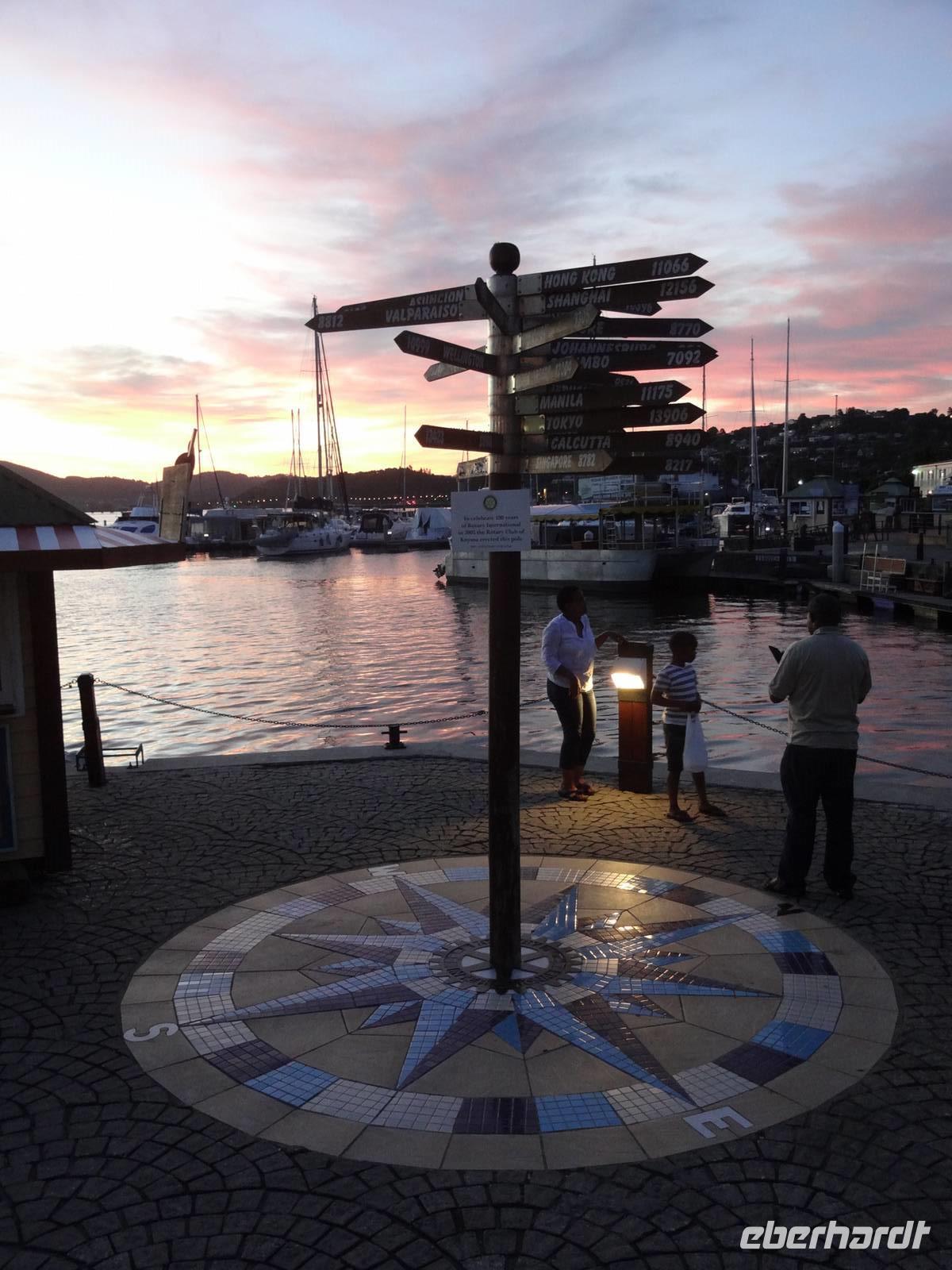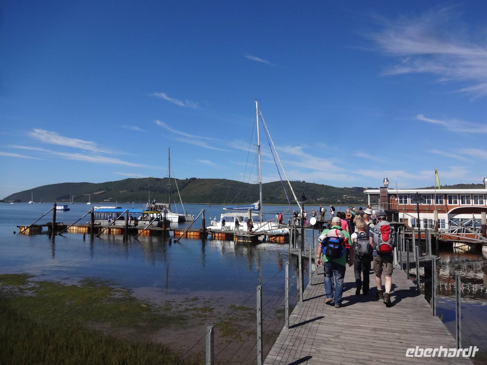 Am Morgen traf sich die Gruppe zu unserem Halbtagesausflug zum Featherbed Naturreservat. Mit einem kleinen Boot ging es durch die Lagune zu der gegenüberliegenden und die Stadt vor dem Ozean schützenden Landzunge bei strahlendem Sonnenschein, es konnte nur ein schöner Tag werden. Am Zielpunkt angekommen ging es mit einem von einem Unimog gezogenen Hänger, einem kleinen Zug gleichend, bergauf zu unserem Ausgangspunkt der Wanderung. Wir liefen durch die grüne Landschaft bergab und genossen die Ausblicke auf die Küste, die Flussmündung und die Lagunenstadt Knysna. Bevor wir am Mittag im Restaurant ankamen entdeckten wir noch einen in der Lagune spielenden Seehund, der uns mit seinen Flossen zu winken schien, danach schlemmten wir wieder einmal südafrikanische Köstlichkeiten bevor es mit dem Boot zurück ging. Das Angebot am Nachmittag eine kleine Stadtrundfahrt mit unserer Reiseleiterin zu unternehmen konnten wir genauso wenig ausschlagen wie das Abendessen an der Waterfront und so neigte sich ein durchaus entspannter Tag so langsam dem Ende zu.